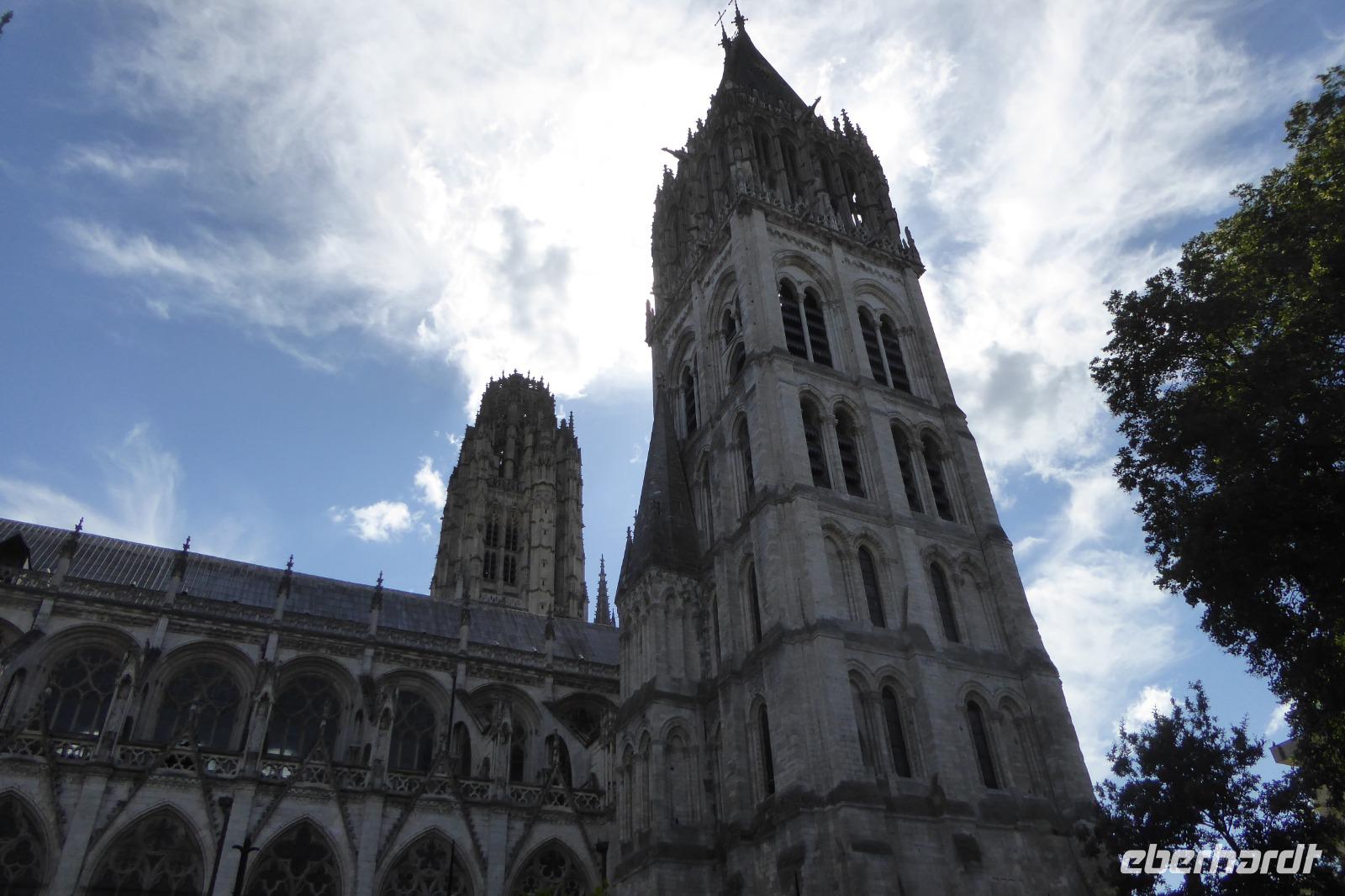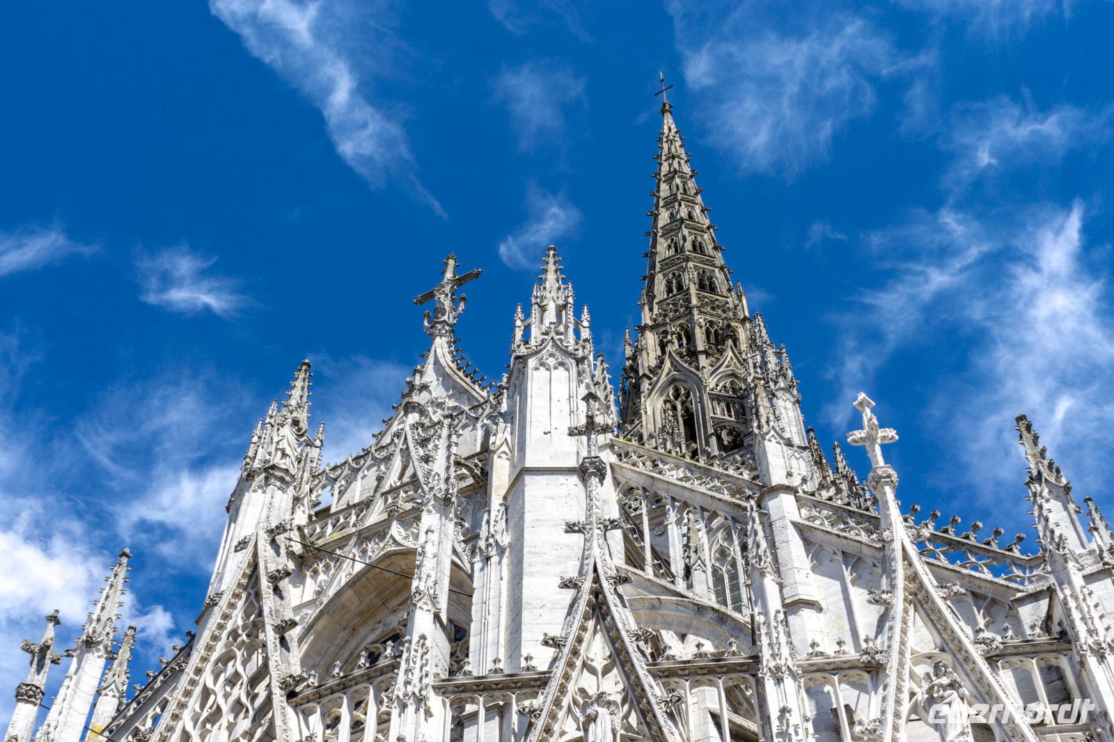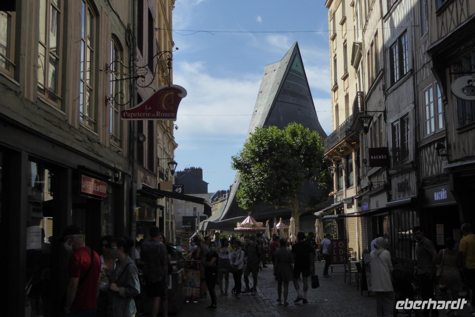 Wir begannen unseren Rundgang in der „Stadt der hundert Kirchtürme, deren Glockengeläut himmelauf schwingt" wie der französische Schriftsteller Victor Hugo die Stadt Rouen vor fast zweihundert Jahren beschrieb, mit der Kirche Saint-Maclou, die 1436 im Stil der Flamboyant-Gotik errichtet wurde. Ihre Steinmetzarbeiten erinnern an feinste Häkelarbeiten! Das Pest-Beinhaus L'aître Saint-Maclou ist mit Holzgalerien mit Schnitzereien von Totentanzszenen aus der Zeit um 1530 umschlossen. Die Gebäude beherbergen heute Kunstateliers. Vor der Kathedrale stand einst die Staffelei des Malers Monet, der die Fassade in einem Bilderzyklus verewigte. Ihm gleich versuchten auch wir das Bauwerk mit unseren heutigen Mitteln von dieser Warte aus festzuhalten. Die berühmten Gräber im Inneren der Kirche beleuchten die Meilensteine der Geschichte der Region: hier liegen Rollo, der erste Herzog der Normandie und Richard Löwenherz unter Stein gemeißelten Grabmonumenten begraben- im Falle des Letztgenannten jedoch lediglich sein einbalsamiertes Herz in einem Bleikästchen. Der Justizpalast im ehemaligen jüdischen Viertel ist das größte nichtsakrale gotische Gebäude Europas und wurde zu Beginn des 16. Jahrhunderts errichtet. Die eng mit Fachwerkhäusern bestandenen Straßen der Innenstadt führen direkt zum alten Marktplatz. Am 30. Mai 1431 wurde dort das junge Mädchen Jehanne aus der lothringischen Provinz, das sich mutig in die politischen Wirren des 100- jährigen Krieges einmischte, von der Kurie dem Flammentod übergeben. Die moderne, architektonisch einmalige Kirche mit den leuchtstarken Glasfenstern aus der Renaissance ist ihr, Jeanne d´Arc, geweiht.