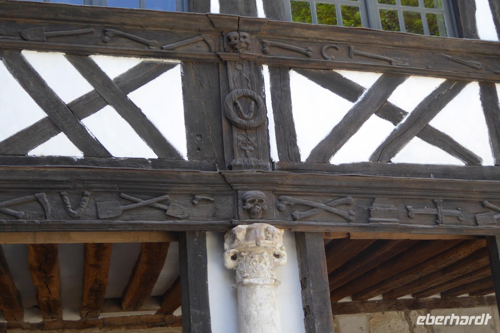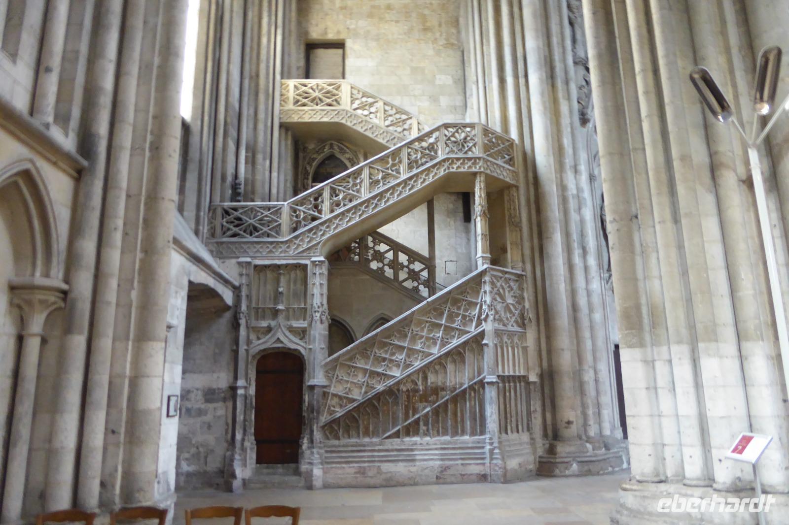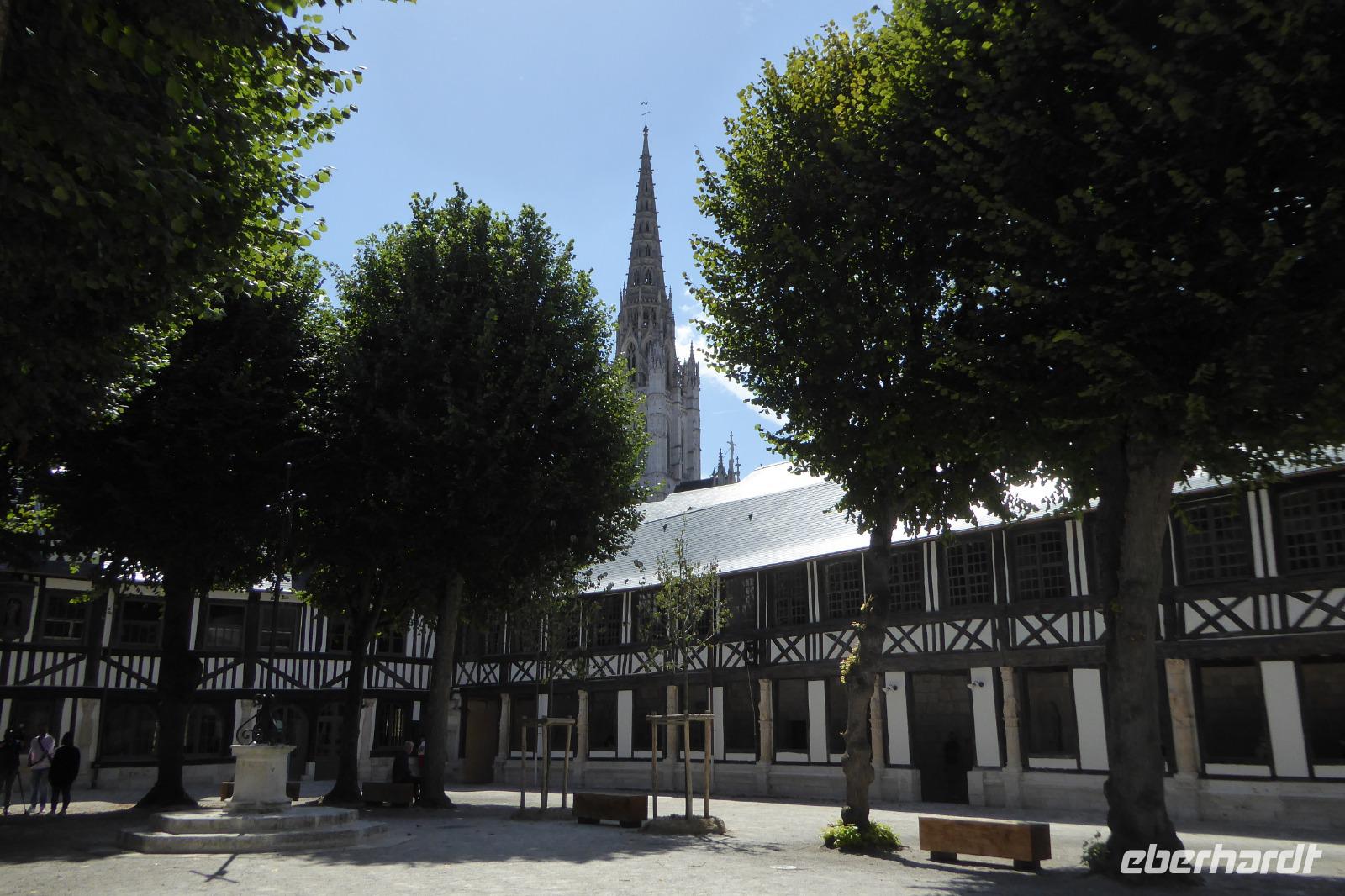 Wir begannen unseren Rundgang in der „Stadt der hundert Kirchtürme, deren Glockengeläut himmelauf schwingt" wie der französische Schriftsteller Victor Hugo die Stadt Rouen vor fast zweihundert Jahren beschrieb, mit der Kirche Saint-Maclou, die 1436 im Stil der Flamboyant-Gotik errichtet wurde. Ihre Steinmetzarbeiten erinnern an feinste Häkelarbeiten! Das Pest-Beinhaus L'aître Saint-Maclou ist mit Holzgalerien mit Schnitzereien von Totentanzszenen aus der Zeit um 1530 umschlossen. Die Gebäude beherbergen heute Kunstateliers. Vor der Kathedrale stand einst die Staffelei des Malers Monet, der die Fassade in einem Bilderzyklus verewigte. Ihm gleich versuchten auch wir das Bauwerk mit unseren heutigen Mitteln von dieser Warte aus festzuhalten. Die berühmten Gräber im Inneren der Kirche beleuchten die Meilensteine der Geschichte der Region: hier liegen Rollo, der erste Herzog der Normandie und Richard Löwenherz unter Stein gemeißelten Grabmonumenten begraben- im Falle des Letztgenannten jedoch lediglich sein einbalsamiertes Herz in einem Bleikästchen. Der Justizpalast im ehemaligen jüdischen Viertel ist das größte nichtsakrale gotische Gebäude Europas und wurde zu Beginn des 16. Jahrhunderts errichtet. Die eng mit Fachwerkhäusern bestandenen Straßen der Innenstadt führen direkt zum alten Marktplatz. Am 30. Mai 1431 wurde dort das junge Mädchen Jehanne aus der lothringischen Provinz, das sich mutig in die politischen Wirren des 100- jährigen Krieges einmischte, von der Kurie dem Flammentod übergeben. Die moderne, architektonisch einmalige Kirche mit den leuchtstarken Glasfenstern aus der Renaissance ist ihr, Jeanne d´Arc, geweiht.