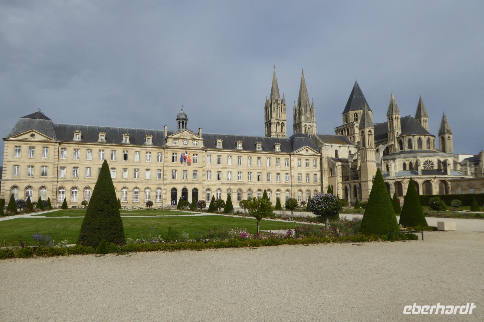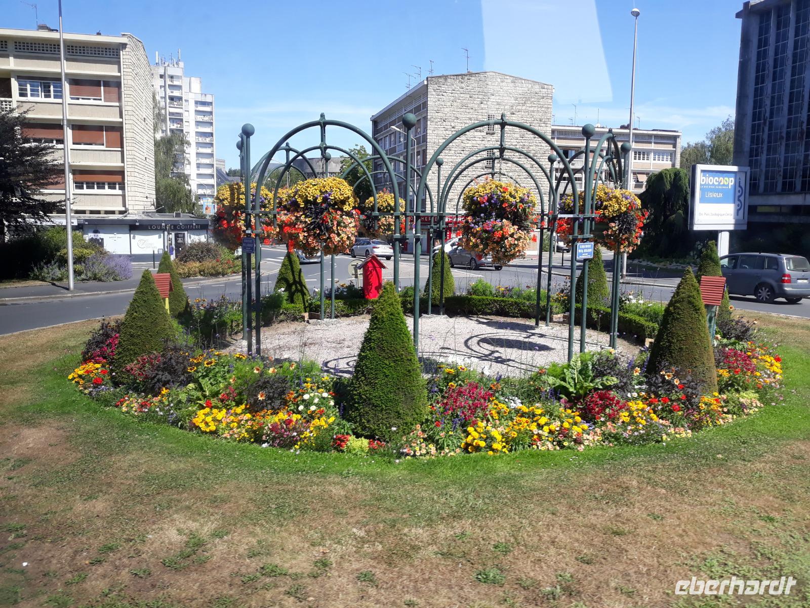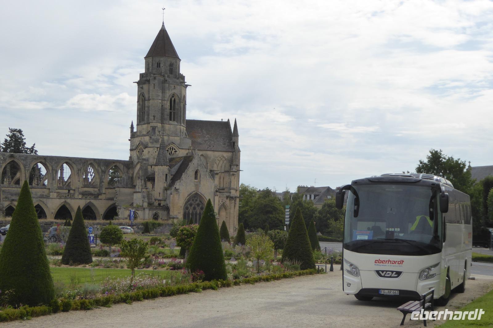 Gleich nach dem Frühstück, das uns Coronasicher auf einem mit Folie abgedeckten Tablett serviert wurde machten wir uns auf zu einem Spaziergang durch die Stadt, vorbei an St. Pierre ins Viertel Vauguex und zur Burg Williams des Eroberers. Unter dessen Schutz und Herrschaft erlangte die Region eine wirtschaftliche Blütezeit. Die mächtige Wehranlage thront über der Stadt, die im zweiten Weltkrieg fast völlig zerstört wurde. Heute hat sich die Burganlage der Kunst verschrieben, das normannische Kunstmuseum zeigt eindrucksvolle Großskulpturen von Rodin und Bourdelle sowie moderne Plastiken internationaler zeitgenössischer Künstler. Auch in der Stadt begegneten uns überall die Kunstwerke internationaler Street Art Künstler.Mit dem Bus erreichten wir wenig später die Abbay aux Hommes in Caen. William ließ zwei Klöster, St. Étienne, die Abbaye aux Hommes und Sainte Trinité, die Abbaye aux Dames im elften Jahrhundert errichten, um, wegen seiner von Papst Leo IX missbilligten Heirat mit seiner Cousine Mathilde von Flandern, Abbitte zu leisten. In der Abteikirche St. Étienne fand er seine letzte Ruhestätte, bis Aufständische das Grab plünderten. Lediglich eine bescheidene Grabplatte im Chor erinnert an den großen normannischen Herrscher.Im Park vor den Klostergebäuden, in denen sich das Rathaus und ein Museum befinden, machten wir eine gemütliche Kaffeepause, bevor wir zum Parc floral weiterfuhren.