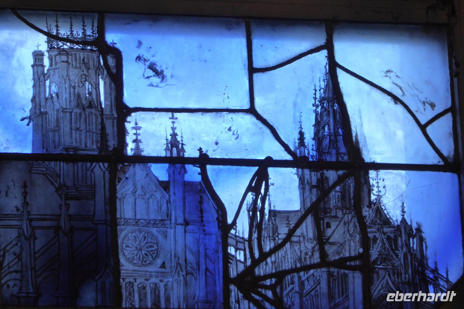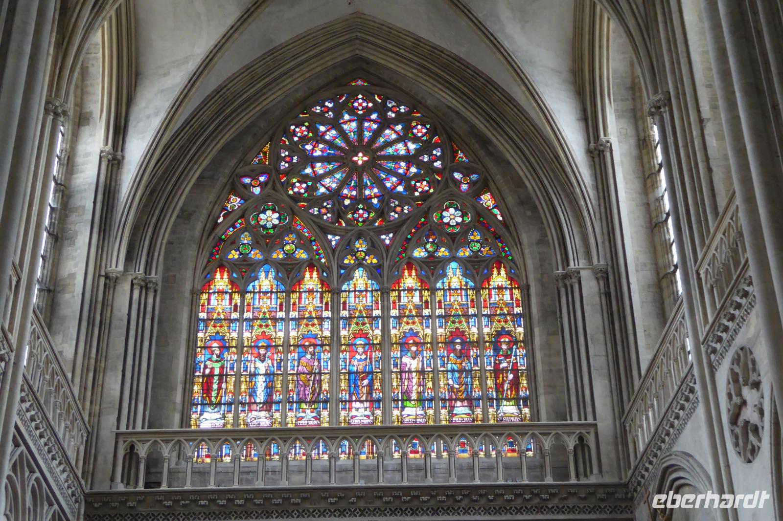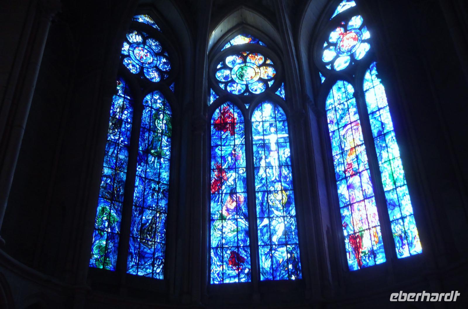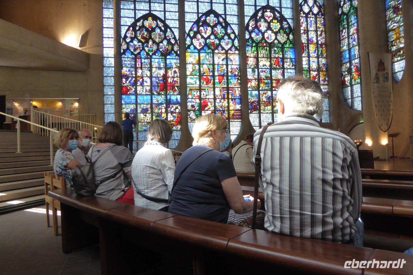 Am nächsten Morgen stand erst ein Besuch in Reims auf dem Programm, der Stadt, in der 29 französische Könige gekrönt wurden und die heute fest mit feinperligem Champagner verbunden ist. Nur eine einzige weitere Reisegruppe war vor Ort und so hatten wir keine Parkplatzprobleme und genügend Zeit, etwas durch die Stadt zu bummeln und das neue Straßenbahnsystem zu bewundern, bevor wir gemeinsam die Kathedrale mit ihren mittelalterlichen Skulpturen und den leuchtenden Glasfenstern besuchten. Im Ersten Weltkrieg wurde Reims schwer zerstört. Reiche Amerikaner, darunter Rockefeller und Carnegie, sorgten für einen baldigen Wiederaufbau der Stadt und der Kathedrale, die heute Weltkulturerbestatus hat. In ihrem Inneren sind auch Glasfenster berühmter Künstler der Neuzeit wie Marc Chagall, Imi Knöbl und Greg Tricker zu bewundern.