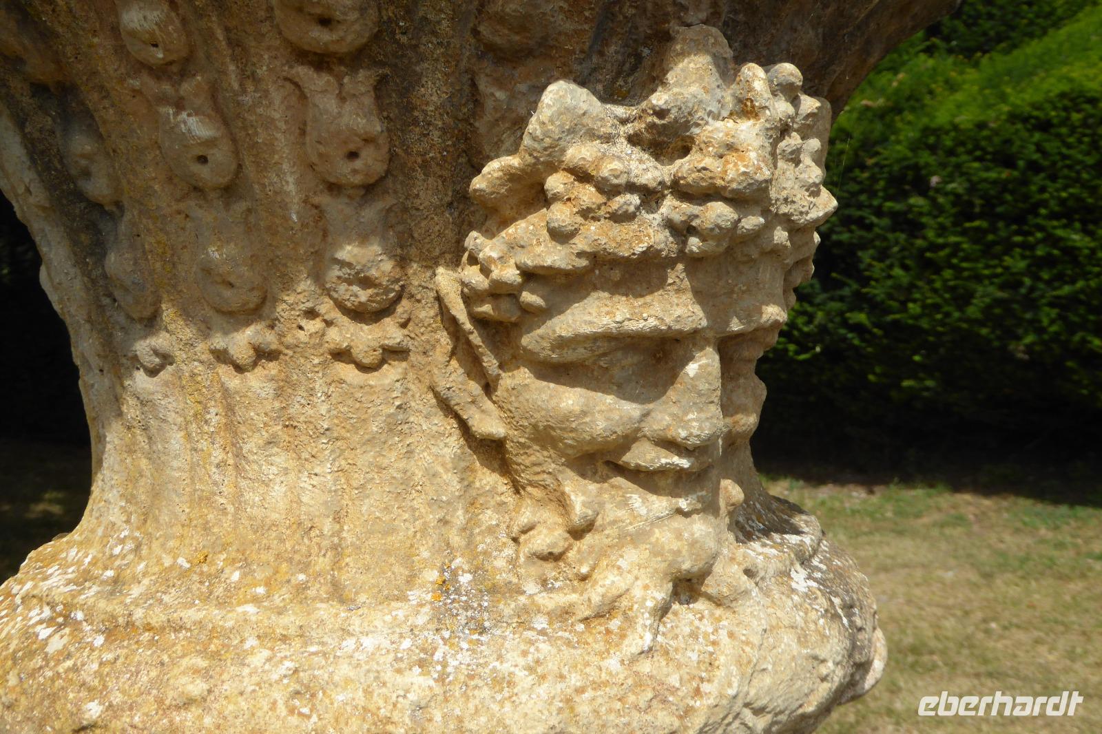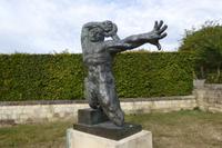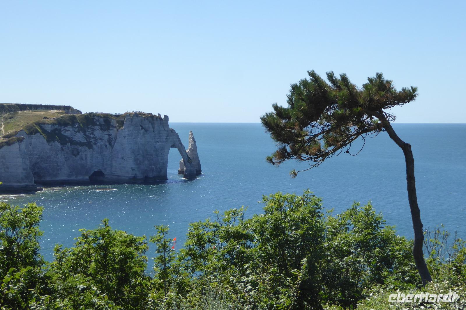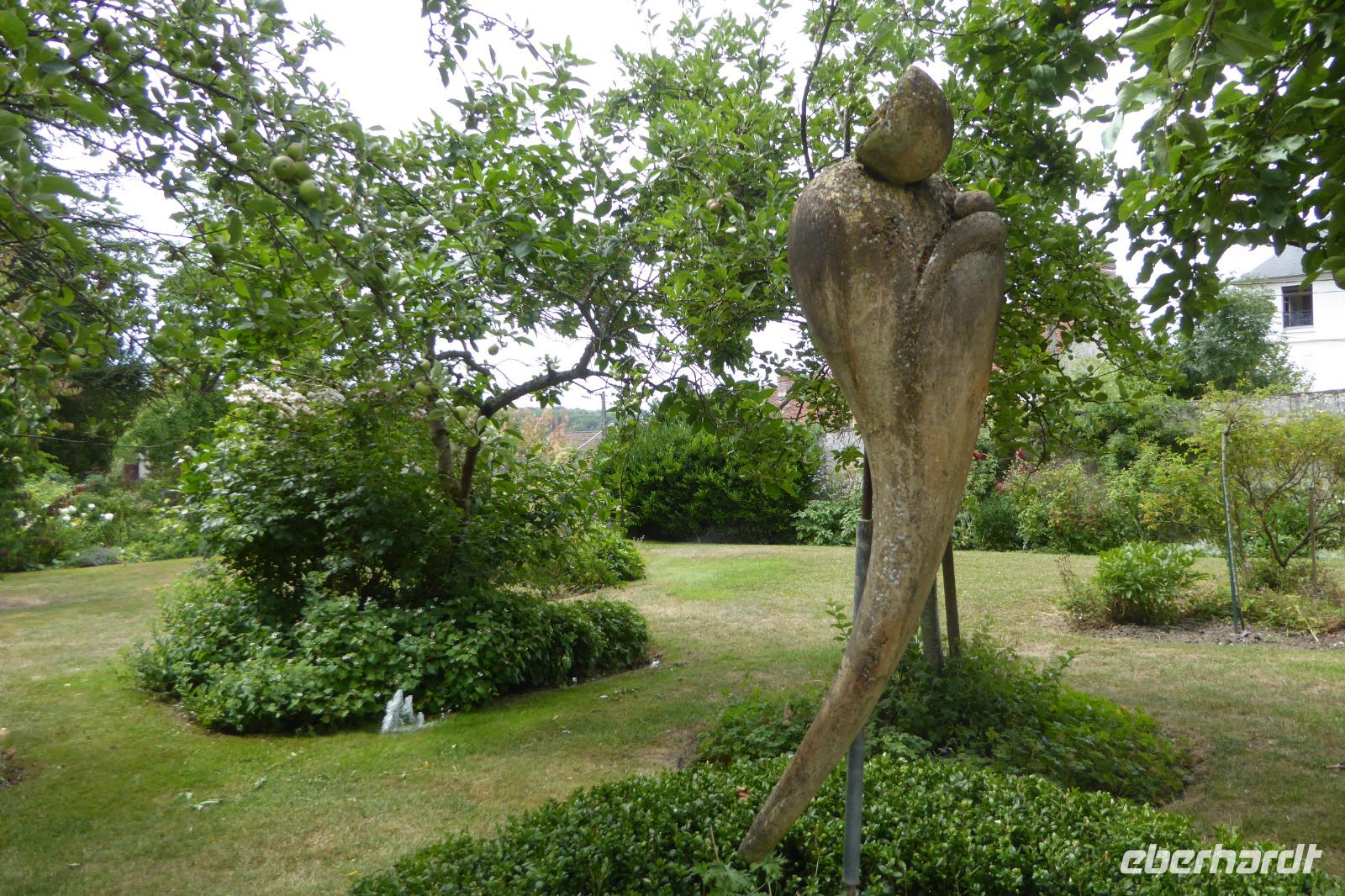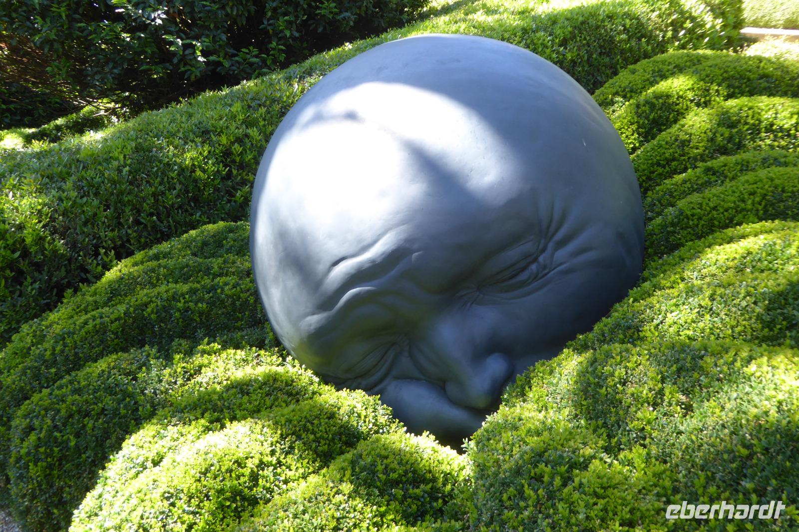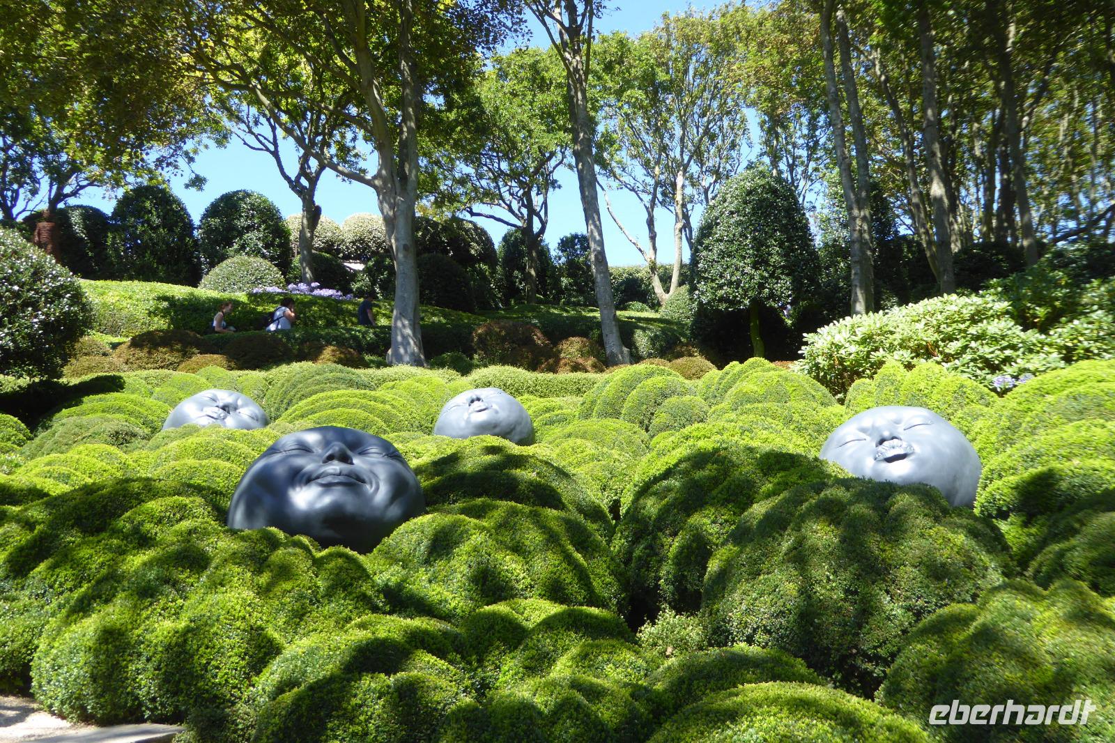 Ein Höhepunkt der Reise erwartete uns im Anschluß: Etretat mit seinen drei markanten Felsbögen der Alabasterküste: Porte d'Amont, Porte d'Aval und Manneporte. Ihre Entstehung verdanken die Klippen nicht der Meeresbrandung, sondern einem Fluss, der parallel zur heutigen Küstenlinie verlief. Die Felsnadel Aiguille besteht aus etwas härterem Kalkstein, der der Erosion bis heute widerstanden hat. Strand und Strandpromenade waren brechend voll von einer bunten Schar Sonnenhungriger und im Städtchen drängten sich die Urlauber, um einen Platz in einem Restaurant zu bekommen. So machten wir uns bald an den Aufstieg zu dem neuen neofuturistischen Garten hoch über dem Meer auf der Klippe d´Amont und traten ein in eine Märchenwelt aus immergrünen, zugeschnittenen Pflanzen und modernen Skulpturen. Die riesigen Köpfe des Künstlers Samuel Salcedo ließen uns schmunzeln und wir genossen die Aussicht, die Ruhe und die mythische Stimmung auf den labyrinthisch angelegten Wegen im Schatten alter Baumriesen.