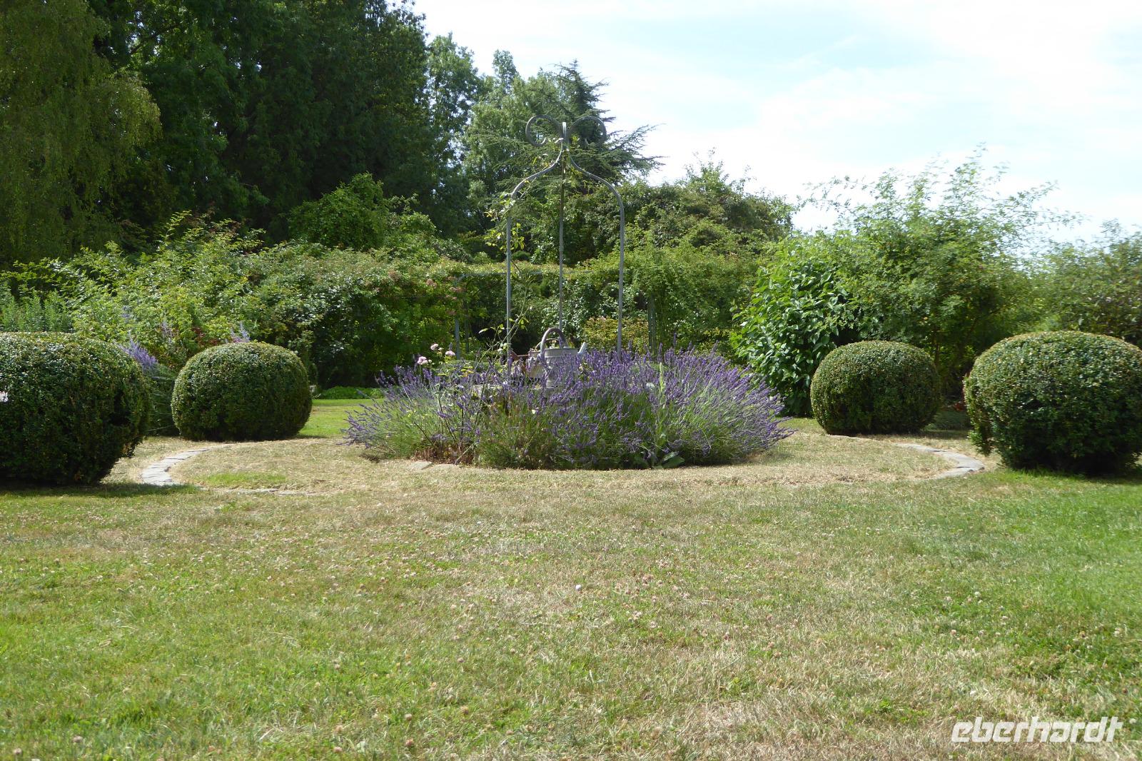 Mit den ersten gut 200 Kilometer Richtung Osten begannen wir unsere Rückreise, verabschiedeten uns vom Meer und kamen in den Süden der Normandie ins Département Orne. Normannische Hecken- und Weidelandschaft, Apfelbäume, Herrenhäuser und edle Pferde prägen diesen Teil der Normandie. Der Garten Francois liegt südöstlich des größten zusammenhängenden Waldgebietes der Normandie, dem Forêt de Bellême im Regionalen Naturpark Perche. Der Garten von Francois ist ein kleines friedliches Paradies mit herrlichen Blumen, blühenden Stauden, duftenden Rosen und aromatischen Kräutern. Ein plätschernder Bachlauf säumt das Haus und Klavierklänge umschmeicheln das Ohr, jäh zerissen von einem Aufschrei der ophidiophoben Reiseleiterin, für die schon die Erwähnung der Reptilien genügte! Zu jedem Paradies gehört eine Schlange! Hier ringelten sich große Ringelnattern im kühlen Grund und nur eine kleine Schwindelei unserer versierten Gartenführerin, der sorcière Perrine, es seien nur Blindschleichen, ermöglichte eine weitere Besichtigung des weitläufigen Geländes.... Der Patron Francois persönlich bewirtete uns mit selbstgemachtem Cidre und Perrine lud zu leckerem Nussgebäck und Kräuterkräckern ein.