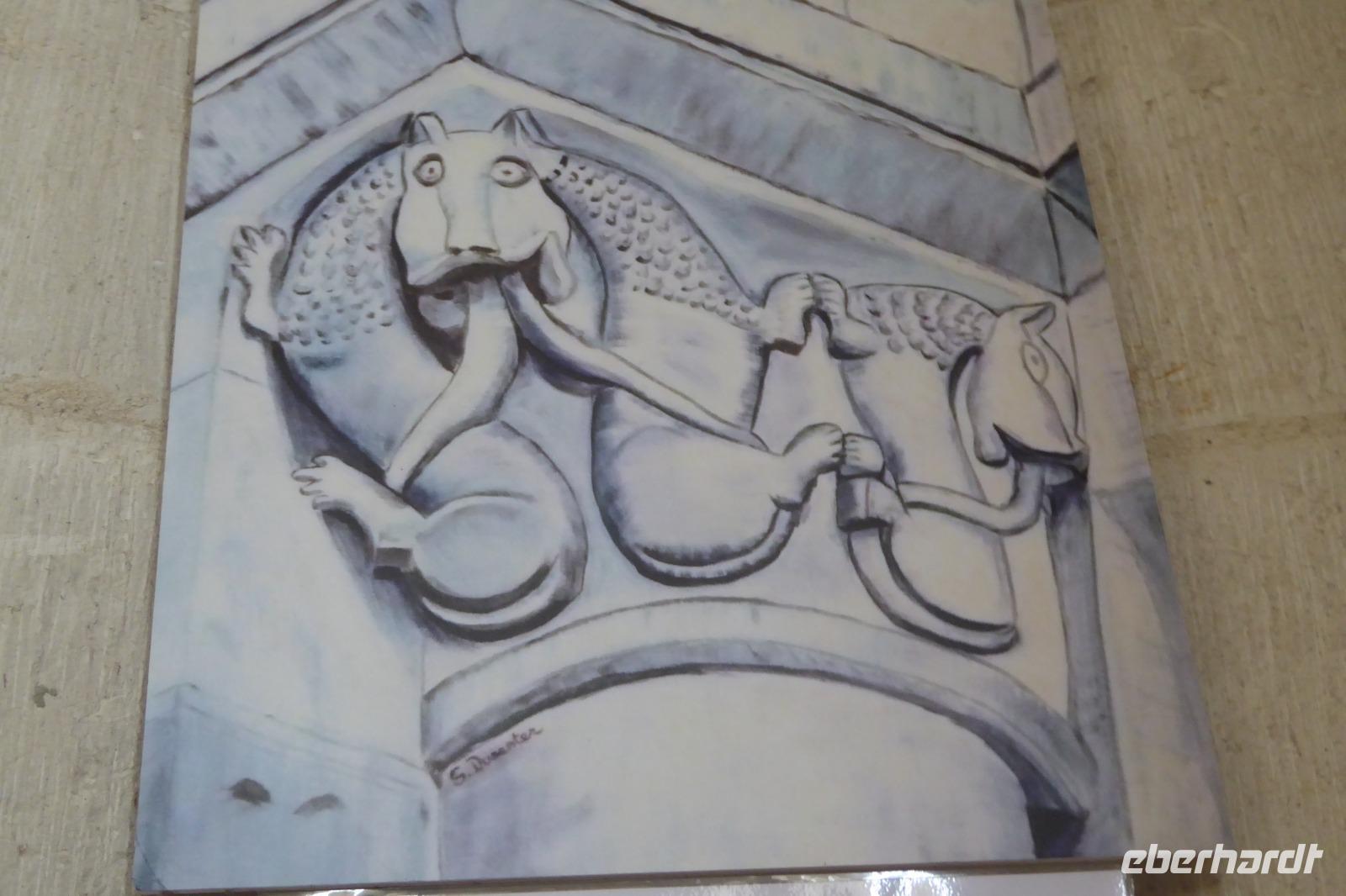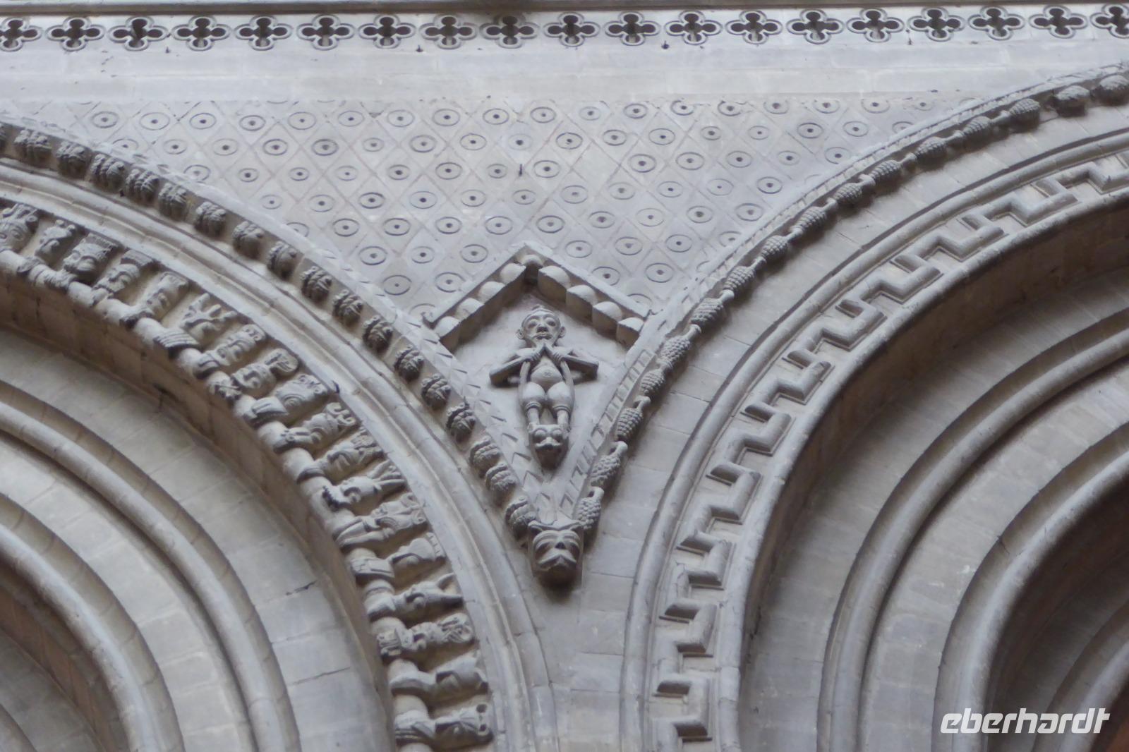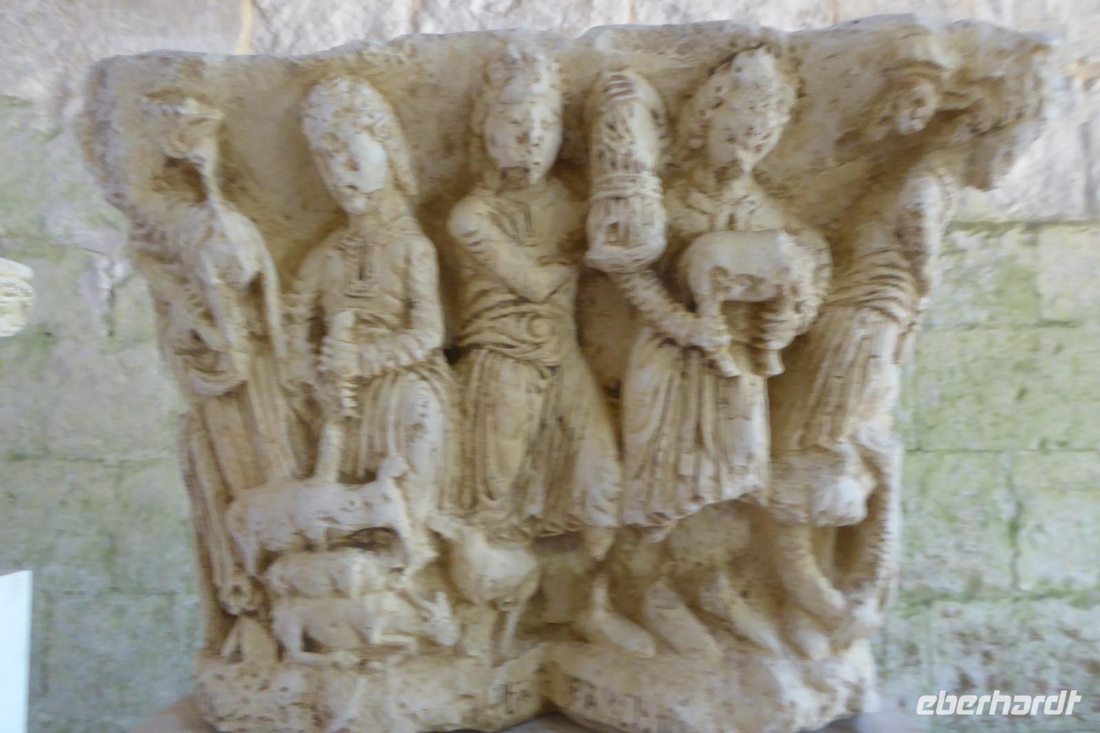 Mit der ganzen Gruppe ging es anschließend nach Saint Martin de Boscherville zu der Abteikirche Saint-Georges, einem gut erhaltenen Beispiel normannischer Romanik mit zwei zierlichen Westtürmen und einem reich gegliederten und ornamentierten Stufenportal. Der Skulpturenschmuck im Inneren, vegetabilische und figürliche Kapitelle sowie die figürlichen Reliefplatten der Querhausemporen sind durch übereifrige Restaurierungsmaßnahmen kaum mehr zu erkennen. Der restaurierte Kapitelsaal aus dem 12./13. Jahrhundert begeisterte uns durch eine außergewöhnlich reich gestaltete dreiteilige Portalzone mit Säulenfiguren und einem bemerkenswerten Rippengewölbe im gut sechs Meter breiten Innenraum.Der angrenzende Park aus dem 17. Jahrhundert mit Gemüse- Kräuter- und Obstgarten liegt malerisch am Hang und wurde in den letzten Jahren des 20. Jahrhunderts rekonstruiert. Wie in biblischen Zeiten konnte auch uns kein Gottesgebot von den Früchten der Bäume abhalten und so labten wir uns in der Hitze des Mittags an herrlich frischen Reineclauden und anderen Steinobstfrüchten!