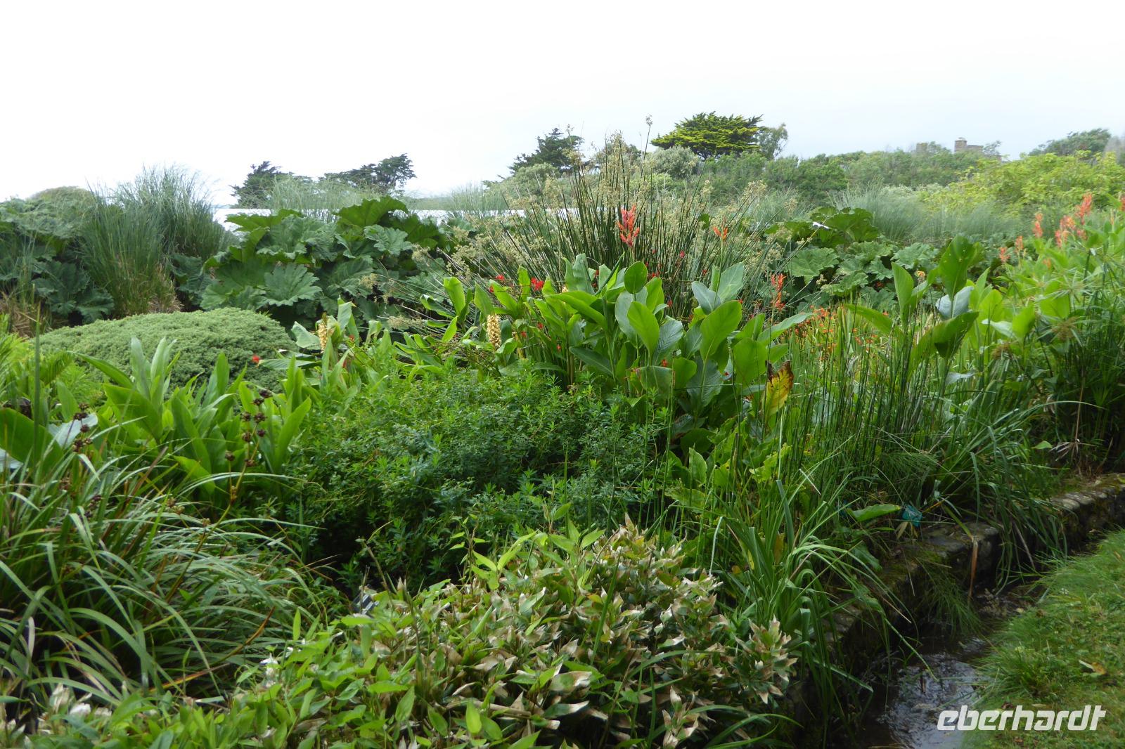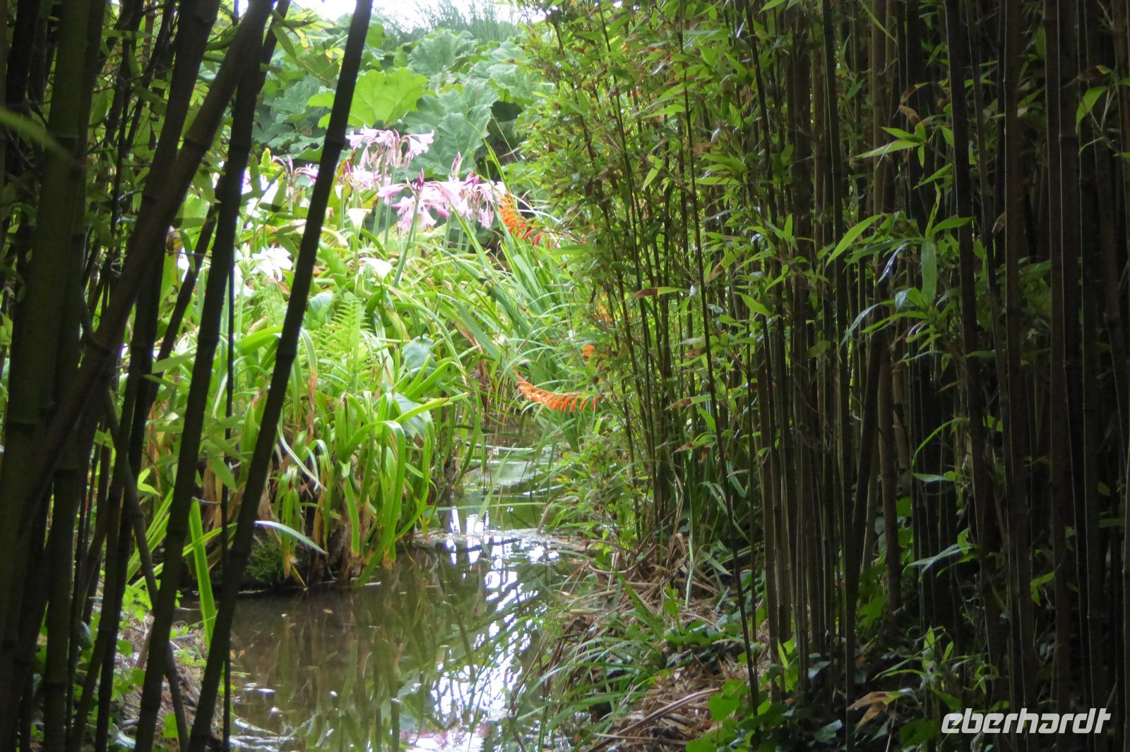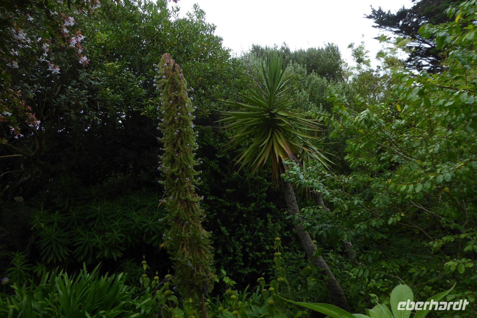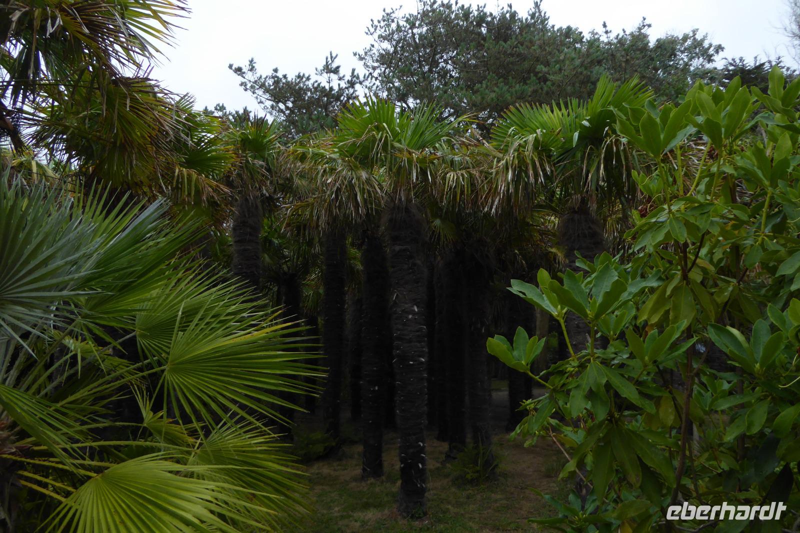 Der nördlichste Palmengarten Frankreichs, direkt am Meer gelegen, profitiert vom milden Klima des Golfstroms auf dem Cotentin. Der Park umgibt das Schloß von Vauville am Rande des pittoresken Dorfes und wurde von Eric und Nicole Pellerin im Jahre 1947 geschaffen. Heute ist er ein außergewöhnlicher botanische Garten von 4 Hektar mit mehr als 900 Sorten Pflanzen, die eine erstaunliche tropische Stimmung erzeugen. Palmen, Eukalyptus, Gingko, Guave, Wollemie und Kampferbaum, Rhododendren, üppige Gunnera und bunte Blühpflanzen, darunter wieder verschiedene Sorten Hortensien. Die beiden Katzen Odette und Eugène begleiteten uns auf unserem Streifzug durch den Park und eine farblich abgestimmte Volontärin erläuterte uns die Besonderheiten der Pflanzen. Mit einem herzlichen Dankeschön verabschiedeten wir uns von ihr, bevor uns ein typischer normannischer Regenguss aus dem Paradies vertrieb.