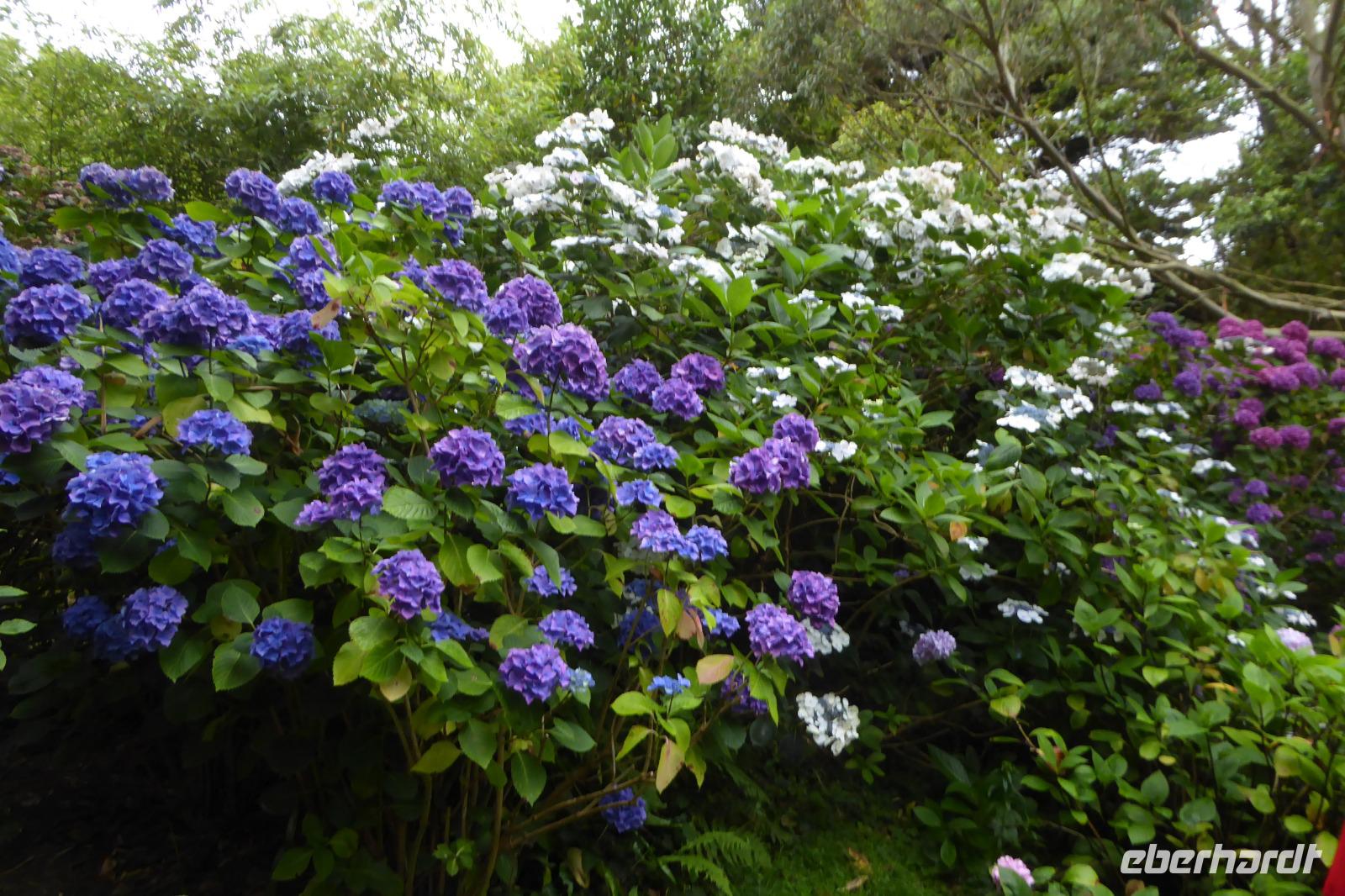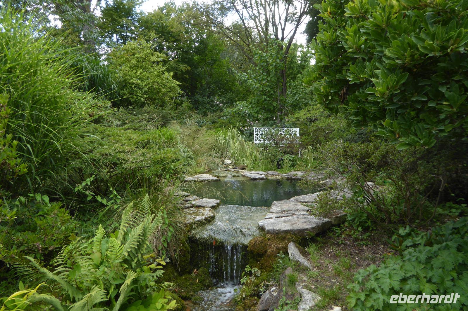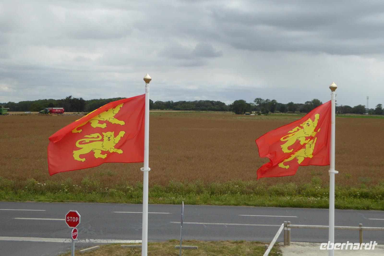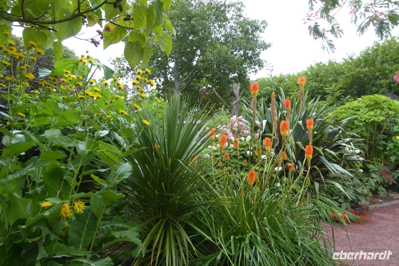 Der nördlichste Palmengarten Frankreichs, direkt am Meer gelegen, profitiert vom milden Klima des Golfstroms auf dem Cotentin. Der Park umgibt das Schloß von Vauville am Rande des pittoresken Dorfes und wurde von Eric und Nicole Pellerin im Jahre 1947 geschaffen. Heute ist er ein außergewöhnlicher botanische Garten von 4 Hektar mit mehr als 900 Sorten Pflanzen, die eine erstaunliche tropische Stimmung erzeugen. Palmen, Eukalyptus, Gingko, Guave, Wollemie und Kampferbaum, Rhododendren, üppige Gunnera und bunte Blühpflanzen, darunter wieder verschiedene Sorten Hortensien. Die beiden Katzen Odette und Eugène begleiteten uns auf unserem Streifzug durch den Park und eine farblich abgestimmte Volontärin erläuterte uns die Besonderheiten der Pflanzen. Mit einem herzlichen Dankeschön verabschiedeten wir uns von ihr, bevor uns ein typischer normannischer Regenguss aus dem Paradies vertrieb.