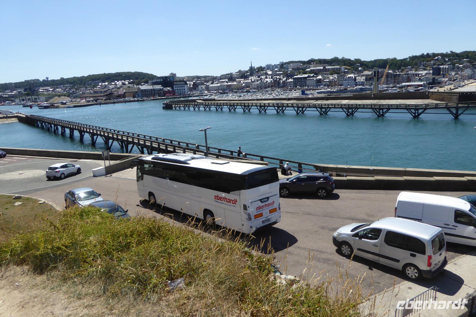 Die Fahrt zu der kleinen Hafenstadt Honfleur führte über die Pont de Normandie, einer 1995 für den Verkehr freigegebenen kostenpflichtigen Schrägseilbrücke, die nicht mit Superlativen geizt! Allein die Länge mit 2141 Metern ist rekordverdächtig und wird nur von der Brücke in Millau getoppt. Bei der Entfernung der Stützen mit 856 Metern liegt sie noch immer an erster Stelle! Die Pylone der Schrägseilbrücke ragen 203 m in den Himmel. Die Brücke über das Seine Ästuar und die Salzwiesen verbindet Le Havre am rechten Ufer im Norden mit Honfleur am linken Ufer im Süden und wir nahmen uns viel Zeit am Morgen das Bauwerk zu erkunden. Eine momentane Fahrbahnsperrung ermöglichte uns fantastische Aufnahmen der Konstruktion.