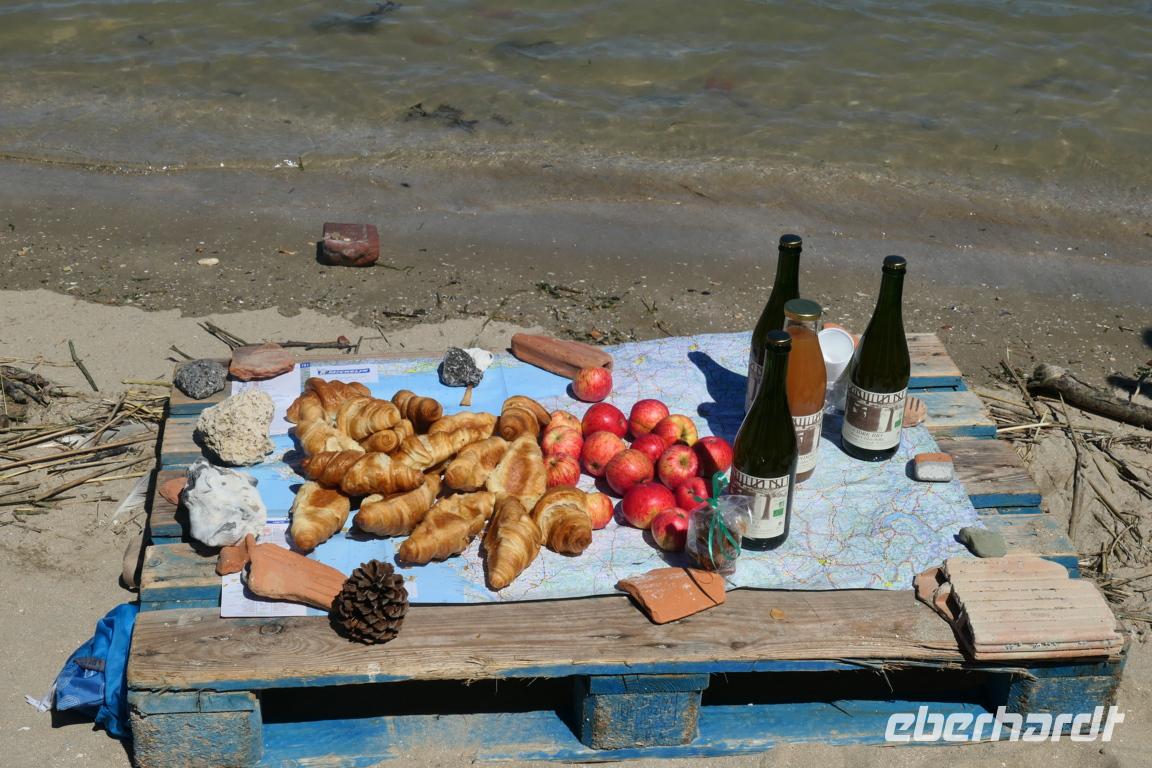 Mondän und großzügig präsentierte sich das Städtchen Deauville, das noch ein Hauch der Jahrhundertwende umwehte. 1911 wurde direkt am Meer das Casino errichtet und mit dem Bau von Luxushotels wurde die Entwicklung von Deauville zum Luxusbadeort weiter vorangetrieben. In den Folgejahren waren namhafte Künstler aller Sparten, Politiker und Geschäftsleute regelmäßig zu Gast: Josephine Baker, Maurice Chevalier, Sacha Guitry, Tristan Bernerd, Gustave Flaubert, André Citroën und Coco Chanel sowie Eugène Boudin, Raoul Dufy, Camille Saint-Saëns, Yves Saint Laurent und Arthur Rubinstein. Die 643 Meter lange Promenade von Deauville wurde zum Laufsteg der Eitelkeiten und prickelnder Champagner floss in Strömen. Dieser Tradition folgend ließen auch wir die Korken knallen und genossen bei einem spontan organisierten Picknick Croissants und prickelnden Cidre aus der Region!