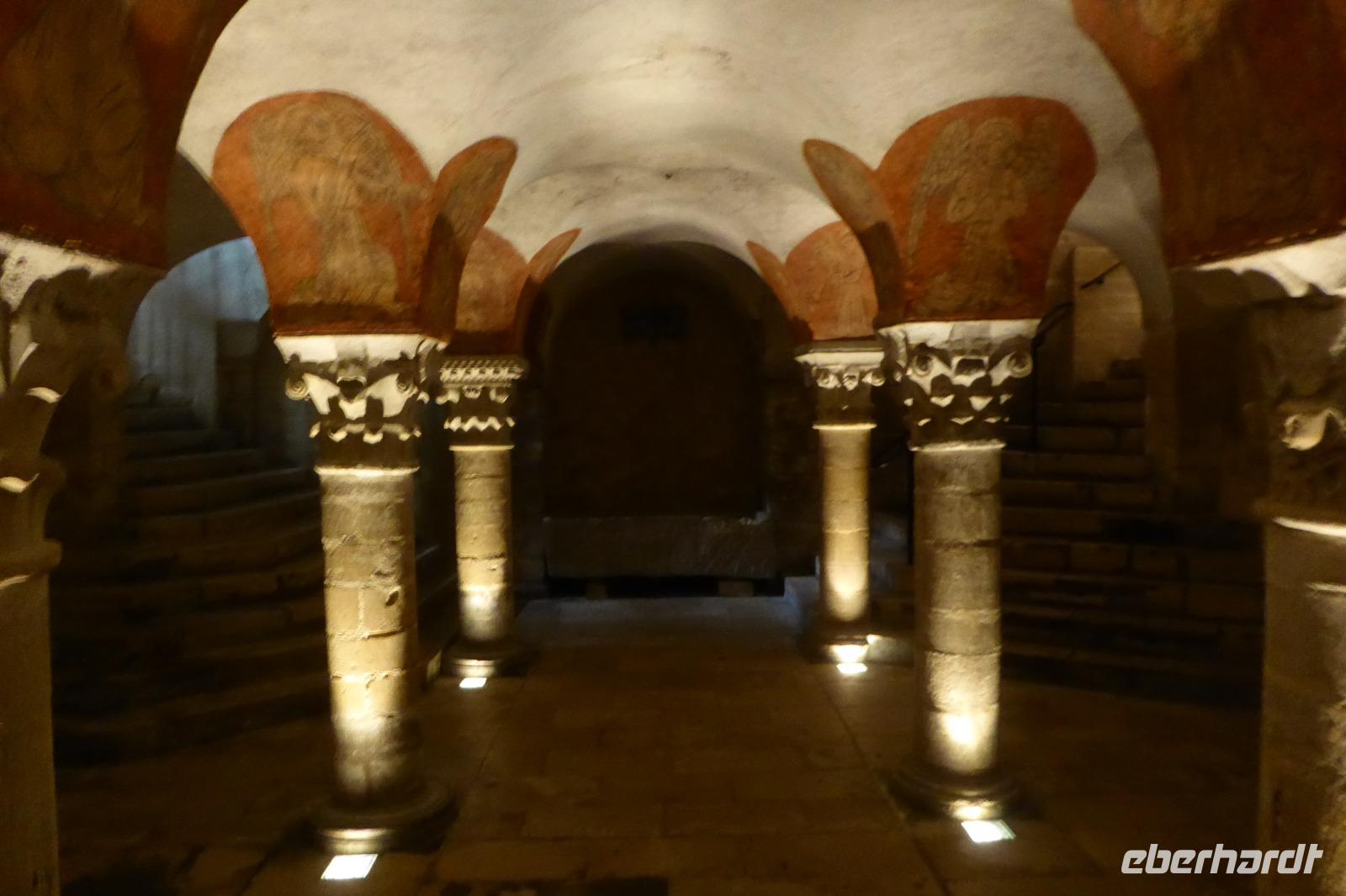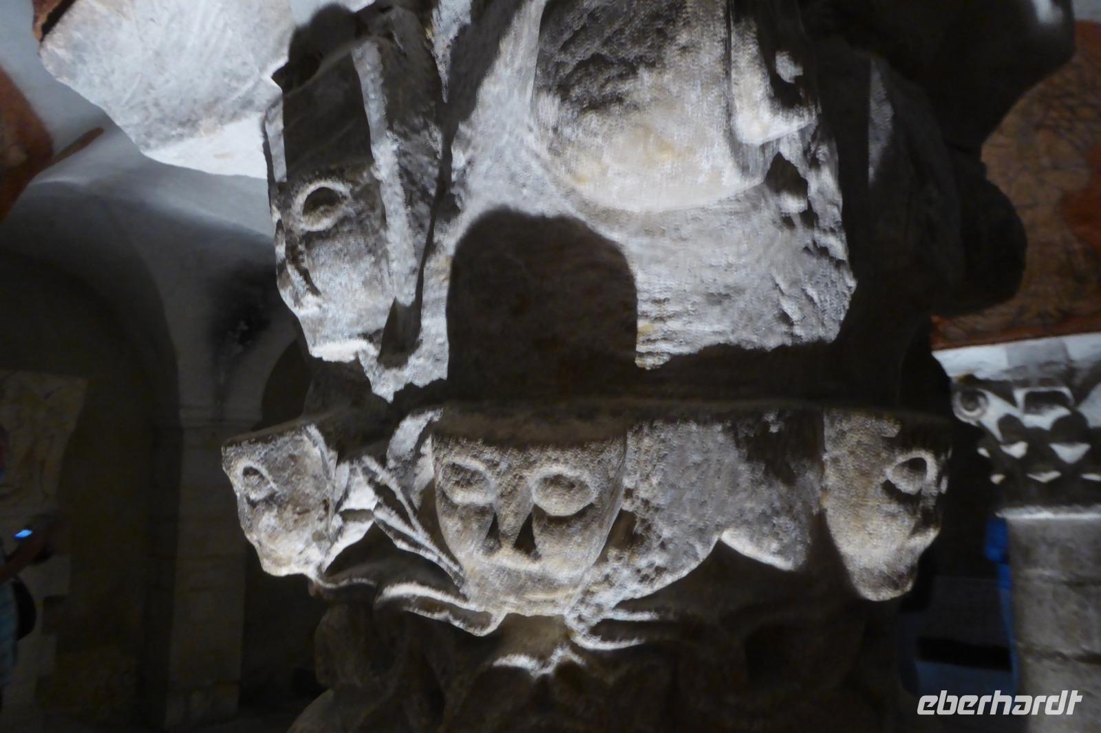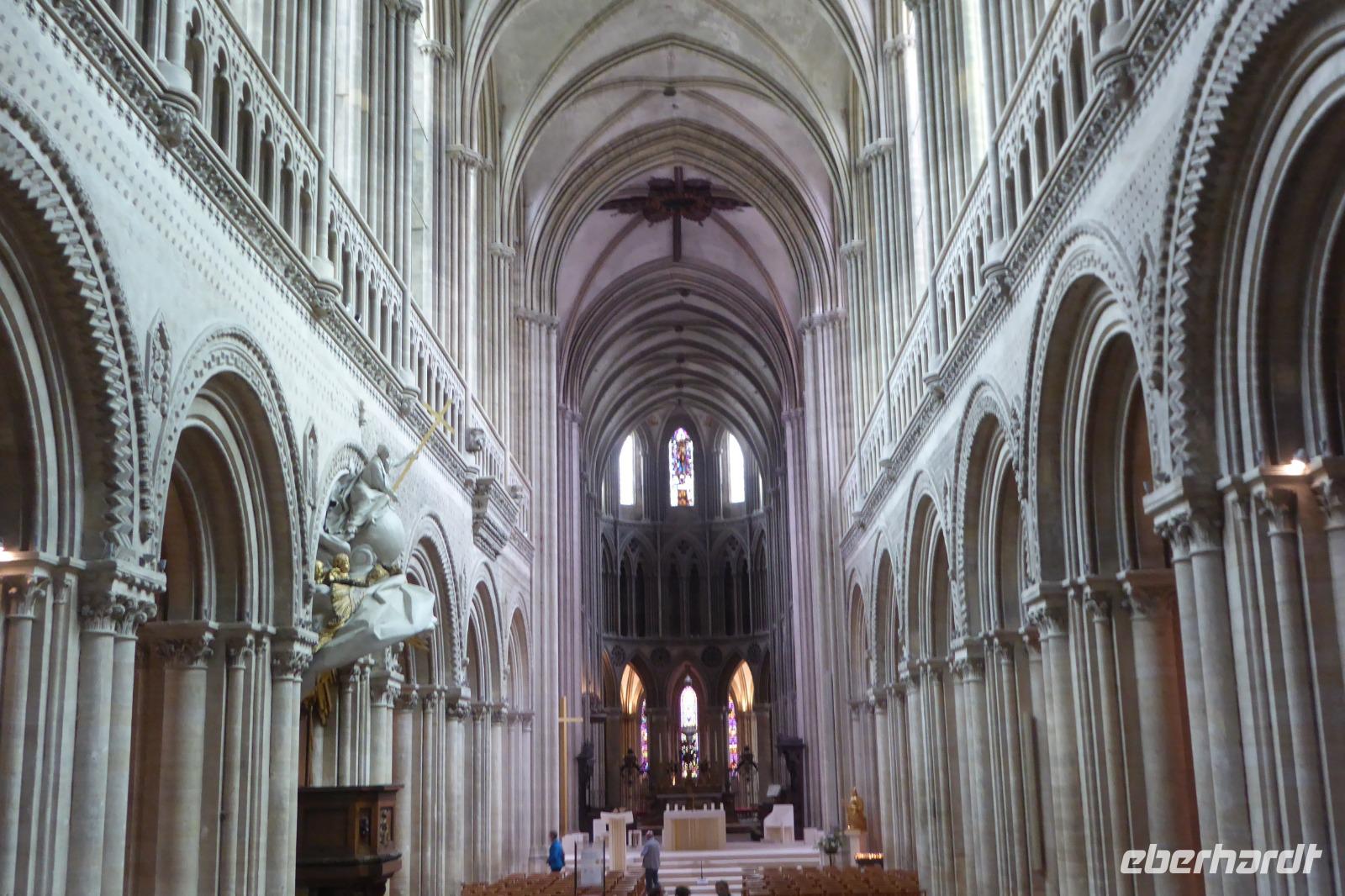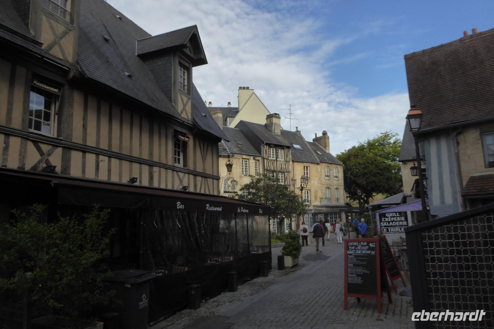 Am nächsten Morgen stand Bayeux auf unserem Programm: Der Wandteppich von Bayeux ist eine Wollstickerei auf Leinen aus der zweiten Hälfte des 11. Jahrhunderts. Auf fast 70 Metern Länge und 50 Zentimetern Höhe zeigt der Wandteppich in 58 Einzelszenen die Eroberung Englands 1066 durch Wilhelm den Eroberer, Herzog der Normandie. Dieses mittelalterliche Meisterwerk wurde vermutlich von seinem Halbbruder, dem Bischof Odo von Bayeux, in Auftrag gegeben, um die neue Kathedrale von Bayeux zu schmücken, die 1077 eingeweiht wurde. Vorbei an einer langen Schlange Wartender durften wir uns, ausgerüstet mit Audioguides, langsam an dem im Halbdunkel präsentierten Kunstwerk mittelalterlicher Handwerkskunst entlang bewegen und bekamen eine detailreiche Beschreibung des Geschehens vor fast 1000 Jahren. Lug, Betrug, Verrat, Mord und Totschlag: Eine Chronik der Ereignisse im Vorgriff auf den Stil moderner Nachrichten. Die Kathedrale wird von einem beeindruckenden Vierungsturm überragt. Die Kapitelle der Krypta überraschen mit der Formenvielfalt der romanischen Steinbildhauer.