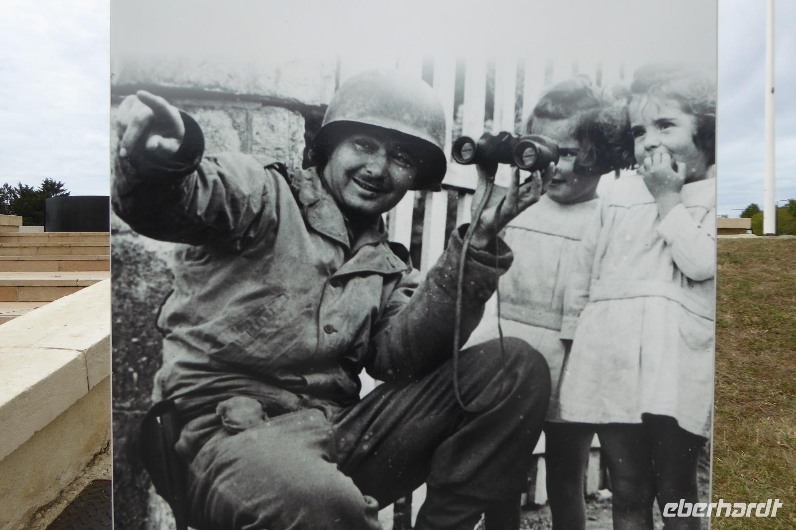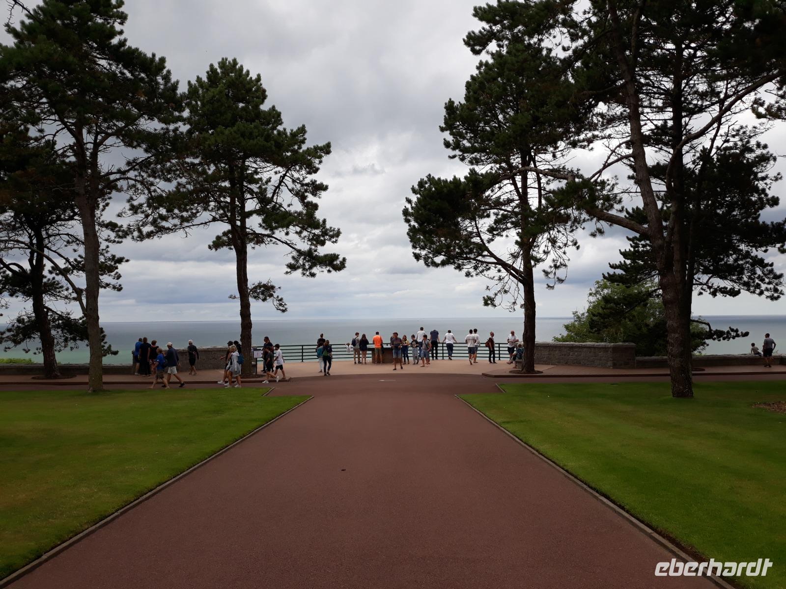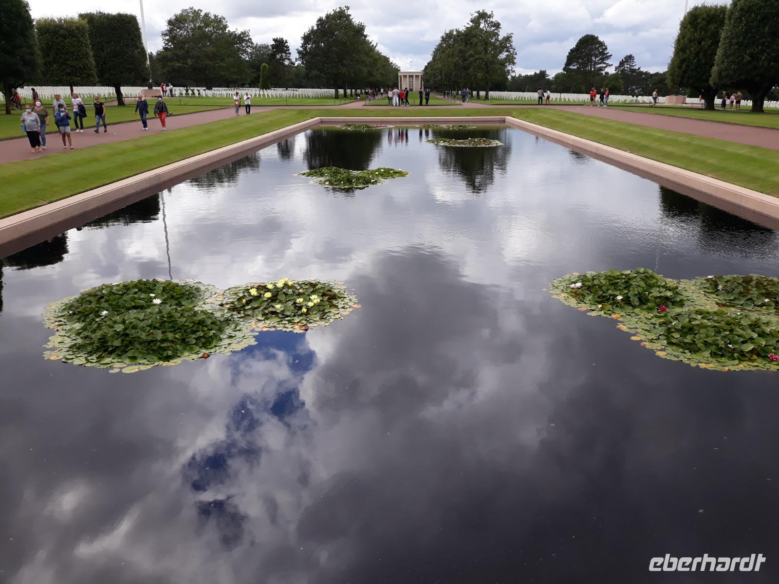 Der amerikanische Soldatenfriedhof in Colleville-sur-Mer ist der berühmteste an den Krieg erinnernde Friedhof in der Normandie. Lange Reihen weißer marmorner Kreuze und Davidsterne symbolisieren die Opfer der Vereinigten Staaten von Amerika, die für die Freiheit gebracht wurden. Der Friedhof befindet sich an einer Stelle, von der man einen eindrucksvollen Blick über den Küstenabschnitt Omaha Beach hat, wo die Amerikaner ihre größten Verluste zu beklagen hatten. Viele Elemente verbinden sich zu einem bleibenden Eindruck: Die halbkreisförmige Säulenreihe, die kunstvolle Statue, das große Becken mit klarem Wasser, und der makellose Park, der die Gräber von 9.387 amerikanischen Soldaten umgibt, die am D-Day und bei den folgenden Gefechten der Schlacht um die Normandie ihr Leben ließen. Mit erschütternden Geschichten aus den Tagen der Besatzung erklärte uns Béatrice, eine junge Volontärin, die besondere Bedeutung des Ortes und appellierte an die besondere Verantwortung jedes Einzelnen für den Frieden.