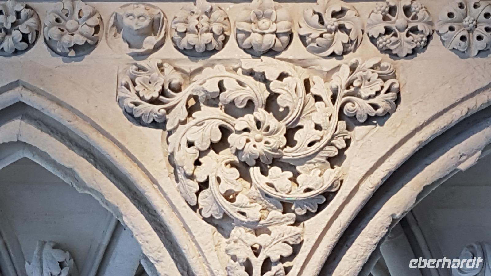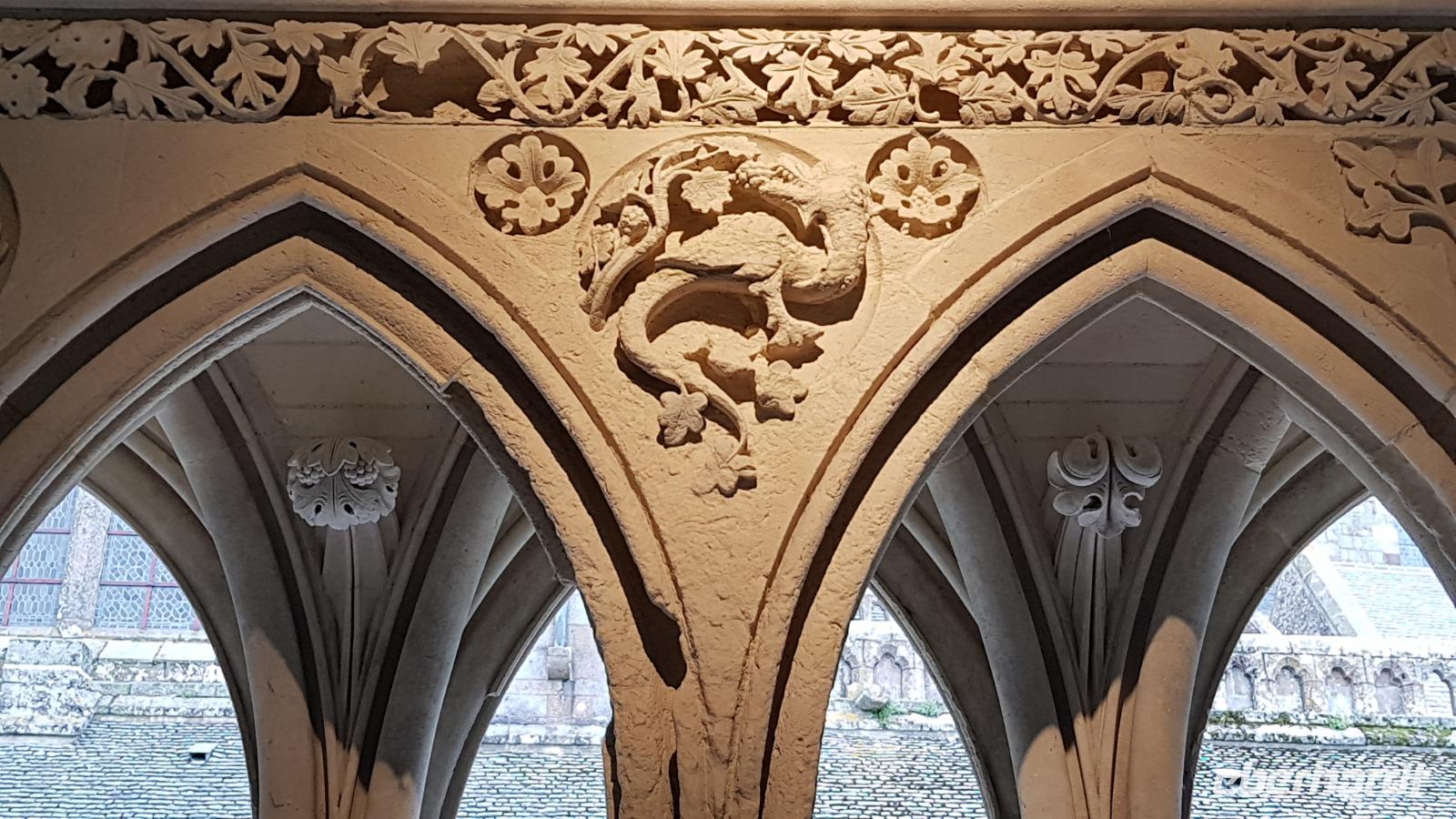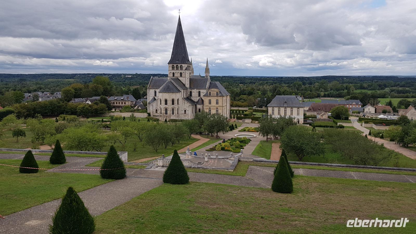 Anschließend fuhren wir nach Saint-Martin-du-Boscherville, wo wir die Klosteranlage von Saint-Georges-de-Boscherville und ihren Abteigarten sehe sollten. Die am rechten Ufer der Seine gelegene Abtei wurde im 11. Jahrhundert von Raoul de Tancarville, dem Kämmerer Wilhelms des Eroberers, als Augustiner-Chorherrenstift angelegt. Sein Sohn gründete 1113 die Benediktinerabtei Saint-Georges, für die bis zur Vollendung im Jahr 1140 die Abteikirche, der Kapitelsaal, der Kreuzgang und die Klostergebäude errichtet wurden. Ihre Blütezeit hatte die Abtei im 13. und 14. Jahrhundert. 1659 übernahmen die Mauriner Mönche die Abtei, die einige der durch die Kriege im 15. und 16. Jahrhundert zerstörten Klostergebäude neu errichteten. Von den Baulichkeiten des 12. Jahrhunderts sind die Abteikirche und der Kapitelsaal vollständig erhalten geblieben. Sie vermittelten uns einen ersten hervorragenden Eindruck von der meisterhaften Qualität der romanischen Architektur und Bauplastik in der Normandie, von dem wir in den folgenden Tagen noch andere beeindruckende Beispiele sehen sollten. Auch seit 1992 rekonstruierte Klostergarten mit seinen regelmäßig angeordneten Obst-, Gemüse, Kräuter- und Blumenbeeten, dem Labyrinth und der Sonnenuhr, der auf den Garten zurückgeht, den die Maurinermönche 1680 angelegt hatten, beeindruckte uns.