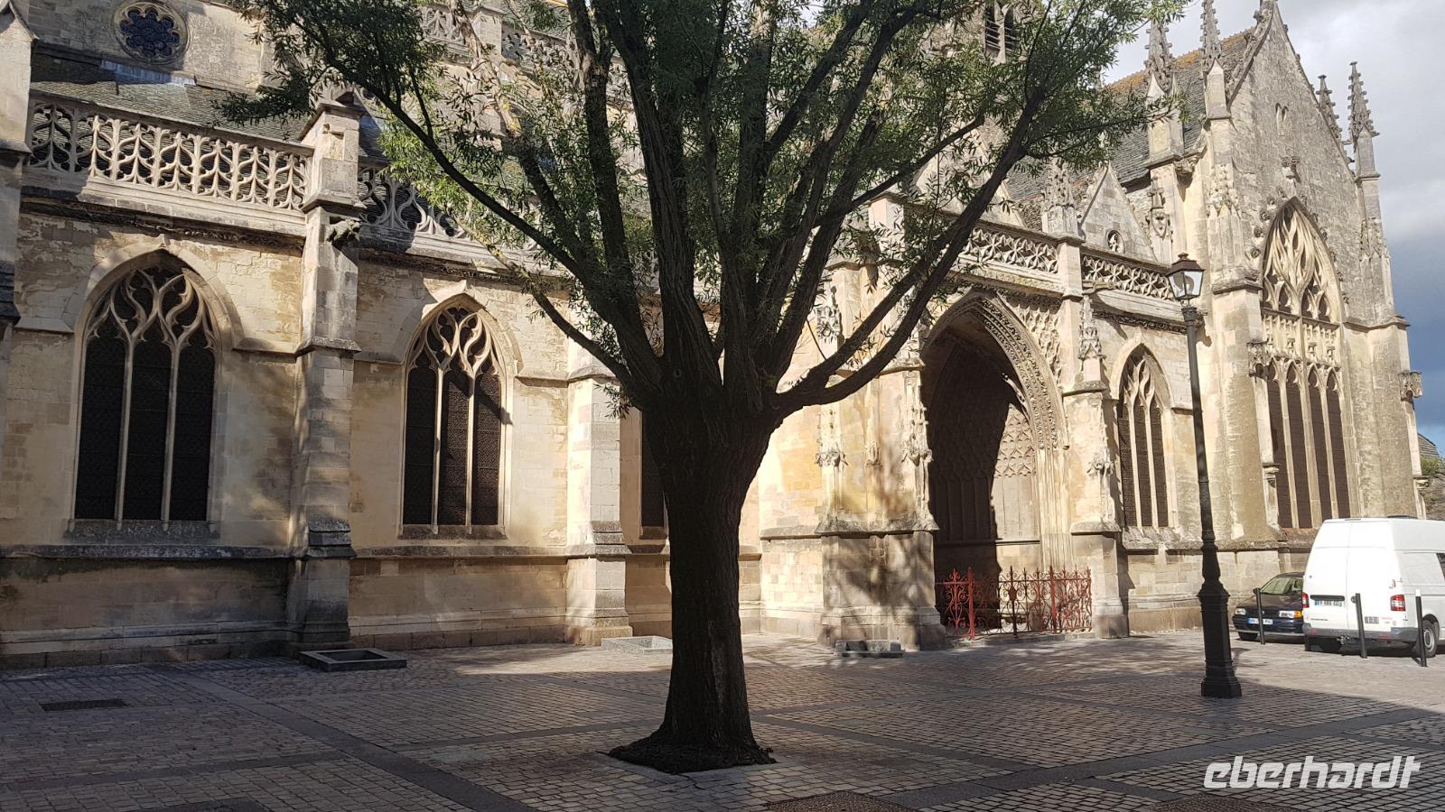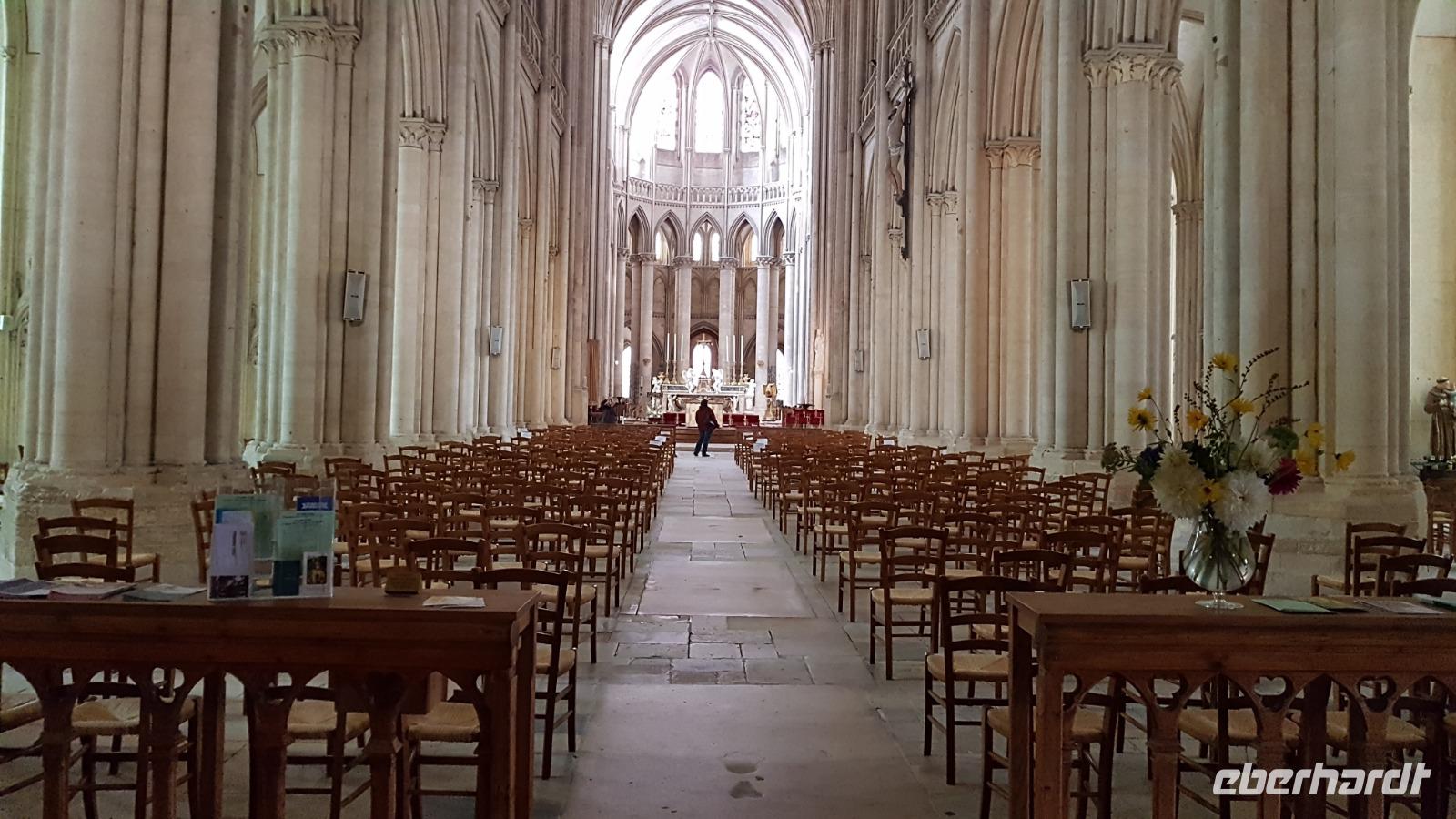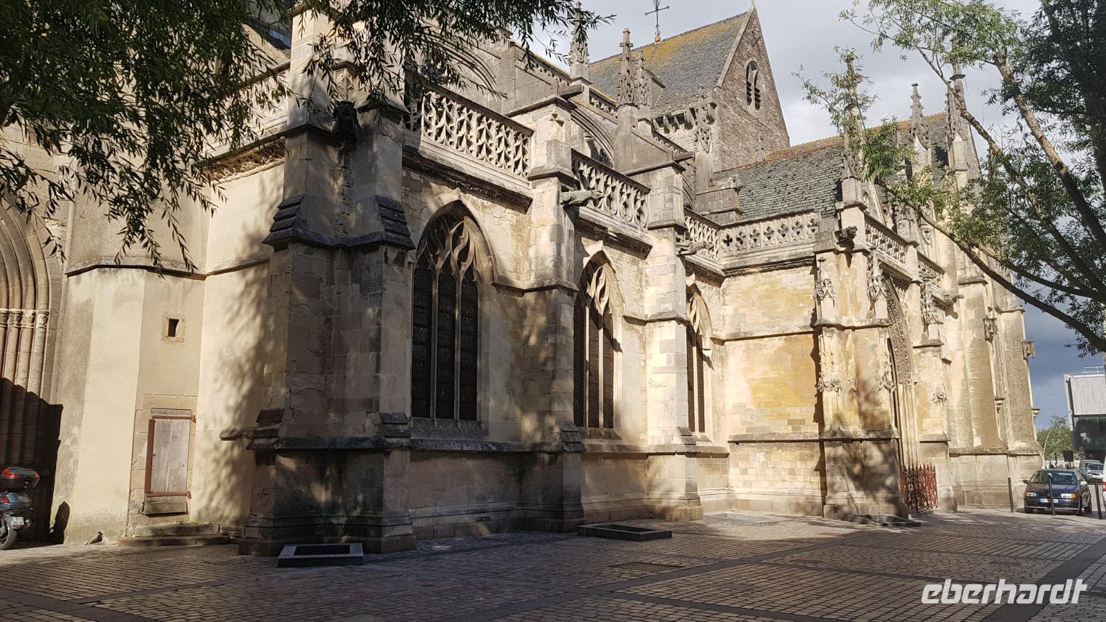 Anschließen spazierten wir durch einige historische Straßen wie die Rue Froide und die Rue Saint-Saveur zur Abteikirche St-Etienne. Als Herzog Wilhelm der Eroberer seine Cousine Mathilde, die Tochter des mächtigen Grafen von Flandern, heiraten wollte, willigte der Papst diesem Ehebund erst zu, nachdem der Normannenherzog versprochen hatte in Caen eine Abtei für Frauen, die Abtei St-Trinité und eine Abtei für Männer, St-Etienne, zu bauen. In der Abteikirche St-Etienne wurde Wilhelm der Eroberer bestattet. Sowohl die reich gegliederte Westfassade wie auch ihre normannisch-romanische Innengestaltung der 1066-1077 errichteten Abteikirche faszinierte uns. Die Klostergebäude wurden Anfang des 18. Jahrhunderts durch Neubauten ersetzt, in denen sich heute das Rathaus von Caen befindet.