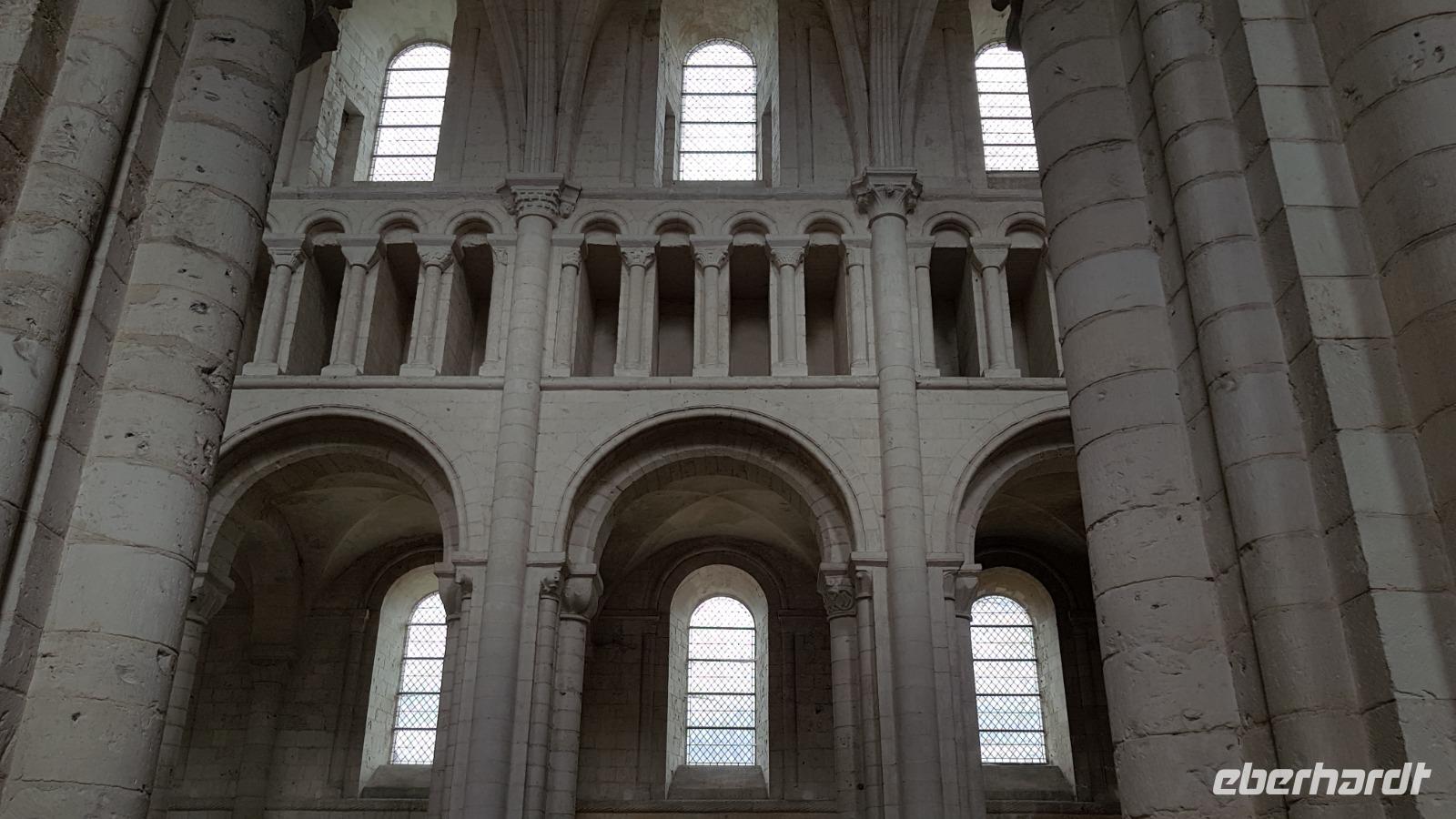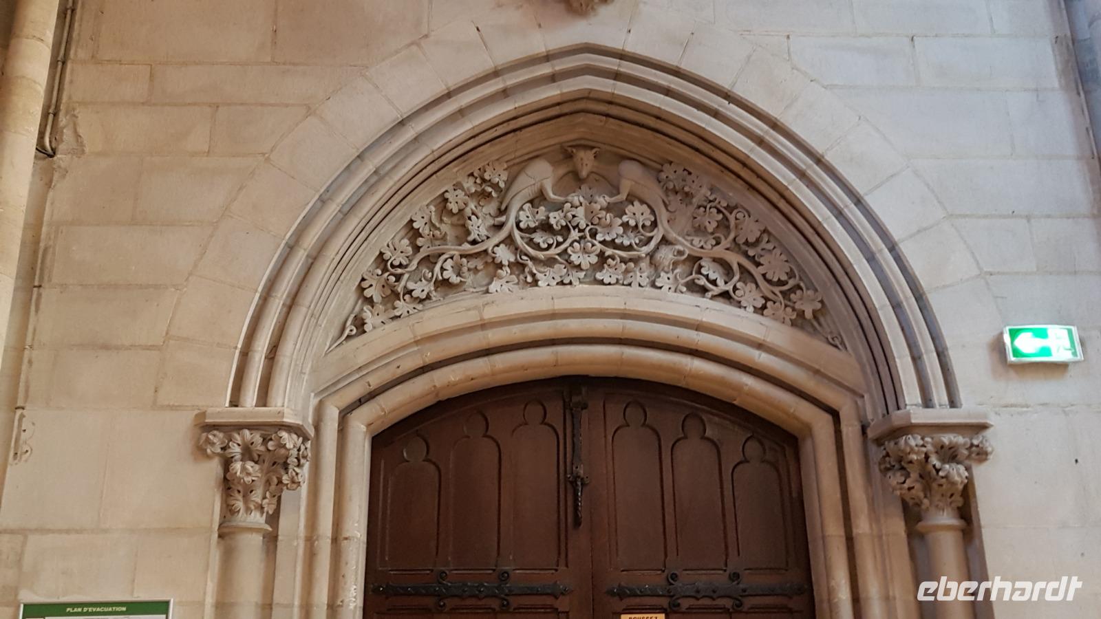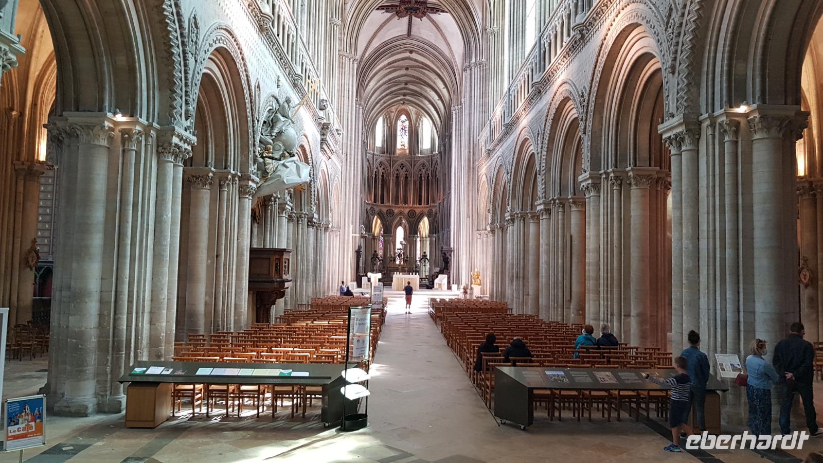 Anschließen spazierten wir durch einige historische Straßen wie die Rue Froide und die Rue Saint-Saveur zur Abteikirche St-Etienne. Als Herzog Wilhelm der Eroberer seine Cousine Mathilde, die Tochter des mächtigen Grafen von Flandern, heiraten wollte, willigte der Papst diesem Ehebund erst zu, nachdem der Normannenherzog versprochen hatte in Caen eine Abtei für Frauen, die Abtei St-Trinité und eine Abtei für Männer, St-Etienne, zu bauen. In der Abteikirche St-Etienne wurde Wilhelm der Eroberer bestattet. Sowohl die reich gegliederte Westfassade wie auch ihre normannisch-romanische Innengestaltung der 1066-1077 errichteten Abteikirche faszinierte uns. Die Klostergebäude wurden Anfang des 18. Jahrhunderts durch Neubauten ersetzt, in denen sich heute das Rathaus von Caen befindet.