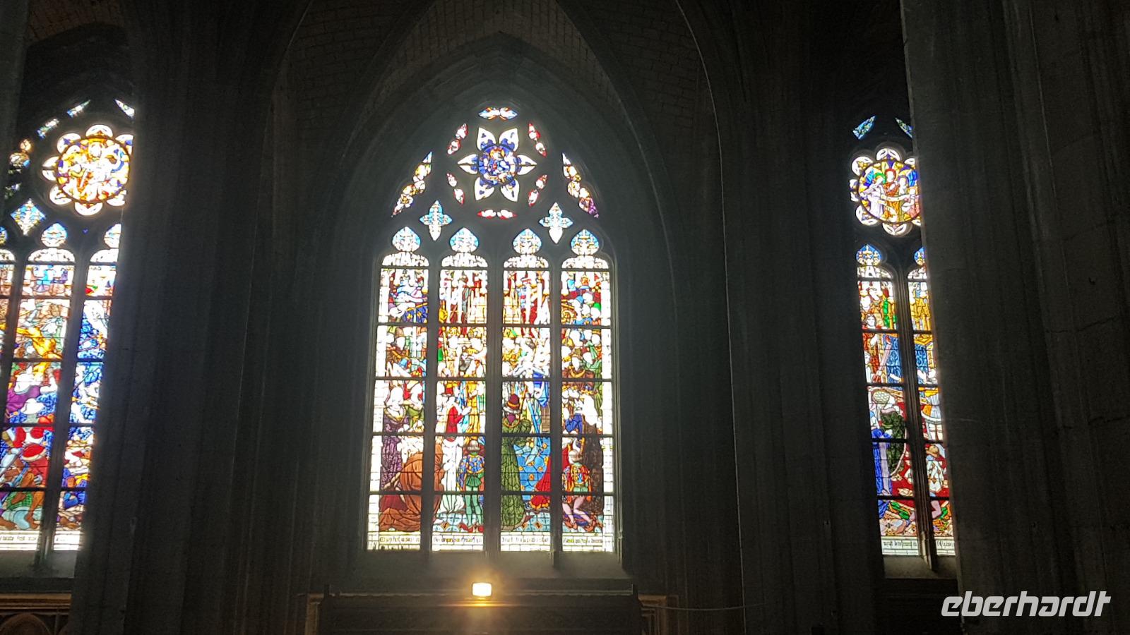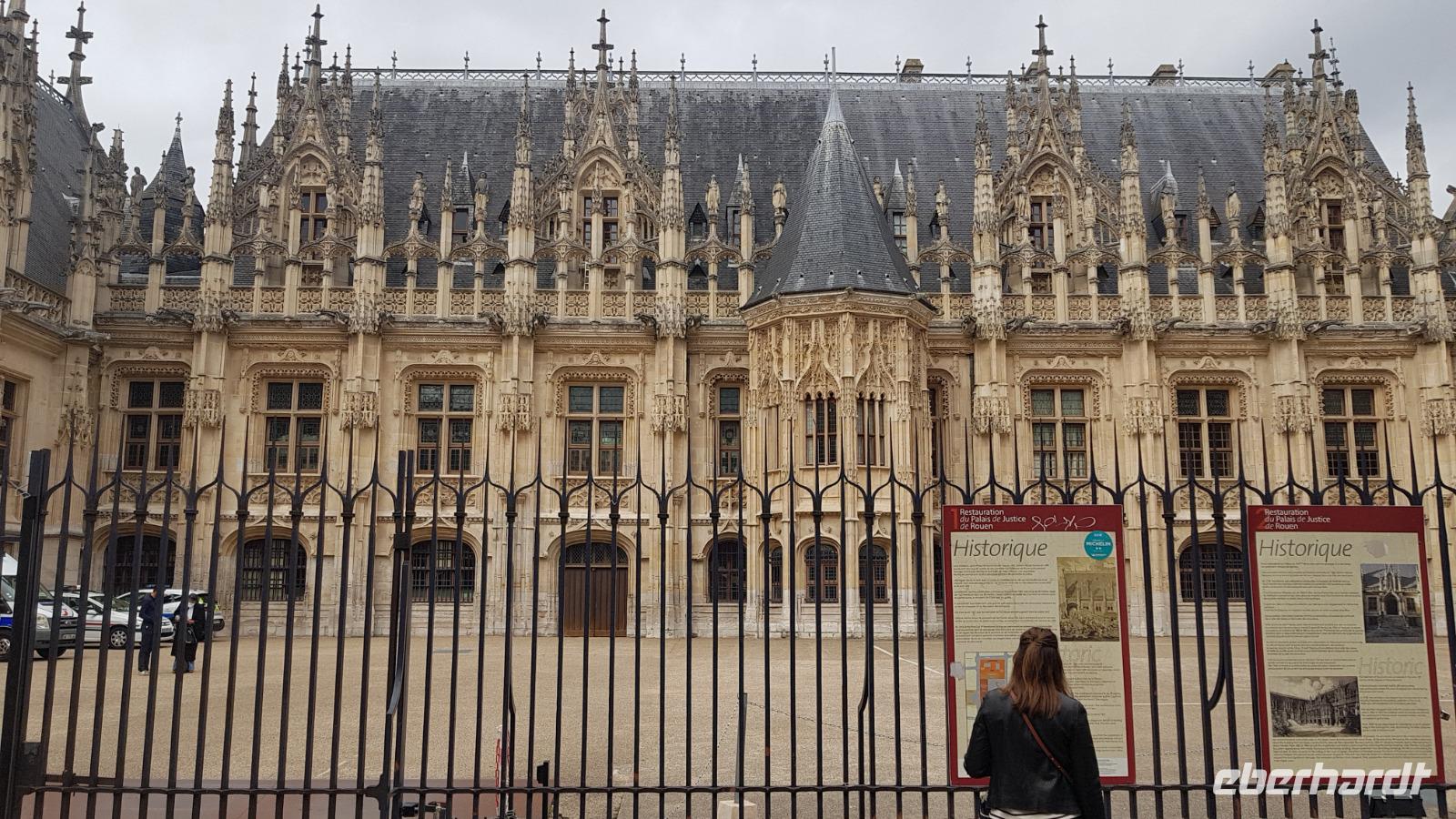Dann ging es in die alte Hauptstadt der Normandie, nach Rouen, die heutige Universitätsstadt und Stadt mit dem größten europäischen Getreidehafen Europas und ca. 2000 erhaltenen Fachwerkbauten, die 80 km von der Seinemündung entfernt liegt. Die alte keltische Siedlung wurde um 100 nach Christus unter dem Namen „Rotomagus" ein Hauptort in der römischen Provinz, in dem Ende des 4. Jahrhunderts der heilige „Saint-Victrice" als erster Bischof Erwähnung fand. Nachdem Rouen im 9. und 10. Jahrhundert mehrfach von den Wikingern aus dem hohen Norden überfallen, geplündert und zerstört worden war, richteten die ersten Herzöge der Normandie Rollo und Wilhelm Langschwert nach dem Vertrag von Saint-Clair-sur-Epte 911 hier ihre Residenz ein. 1204, nach dem Sieg von König Philipp-August über die Normannen, die inzwischen Könige von England geworden waren, wurde Rouen französisch. Im Hundertjährigen Krieg, als Rouen für ca. zwei Generationen englisch war, kam es hier zur Verurteilung und zum Feuertod der Jeanne d'Arc auf dem Marktplatz im Jahr 1431. Während unserer Stadtführung mit Christelle Thibon besuchten wir all die berühmten Sehenswürdigkeiten der Stadt wie die Kathedrale, die Place Saint-Barthélmy mit der Kirche St-Maclou, den heutigen Justizpalast aus dem 15. und frühen 16. Jahrhundert, in dem einst der oberste Gerichtshof der Normandie tagte, den berühmten Bogen mit der großen Uhr in der Rue du Gros-Horologe, den Alten Markt, auf dem ein Kreuz an die Verbrennung von Jeanne d'Arc erinnert und schließlich die daneben 1979 erbaute Kirche Ste-Jeanne-d'Arc mit ihren wunderschönen Glasfenstern.