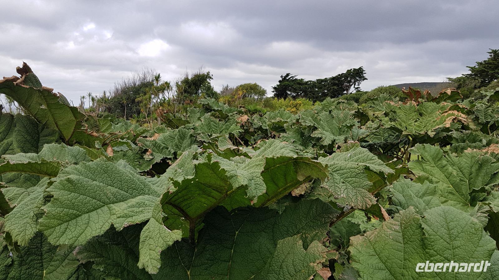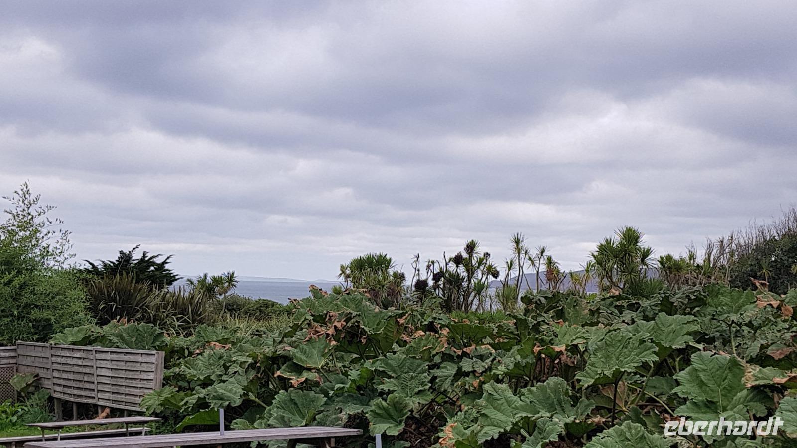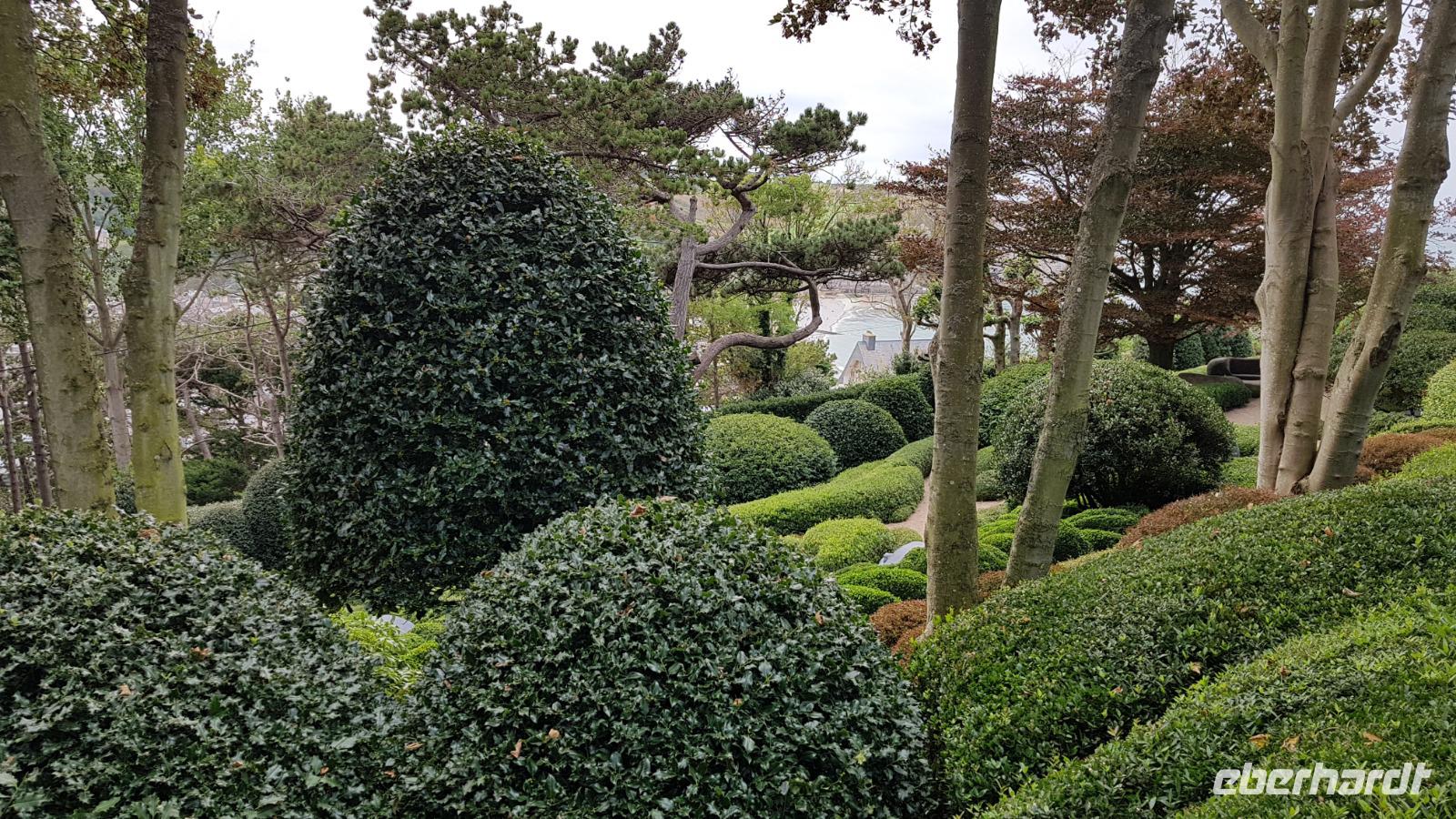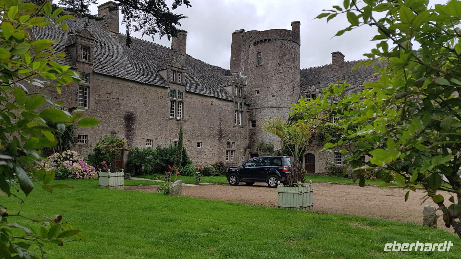 Heute stand gleich am Morgen die Besichtigung eines Gartens auf unserem Programm. Nach dem etwas kargen Frühstück im Hotel fuhren wir zur Südküste der Halbinsel Cotentin, wo wir den Jardin Botanique de Vauville besuchten. Diese heute 35.000 m² umfassende Anlage besteht aus einem Schloss aus der Renaissance-Zeit, das im zweiten Weltkrieg stark beschädigt wurde sowie einer Reihe von subtrobisch anmutenden Gärten. Nach der Restaurierung des Schlosses legte Eric Pellerin 1948 auf dem angrenzenden 8 Hektar großen Land seinen ersten Garten an. In den folgenden Jahrzehnten wuchs der Garten bis 1980 auf 20.000 m² . Begünstigt durch den Golfstrom, der die Temperaturen moderat hält, gedeihen hier hinter den als Windschutz dienenden Bamushainen asiatische und tropische Gewächse, darunter Palmen, Yuccas, Feigen, Zedern, Neuseeländischer Flachs, Australischer Taschenfarn, Sternjasmin, Riesennatternkopf, Kalifornischer Straumon, Mammutblatt - um nur einige der über 600 Pflanzen der südlichen Hemisphäre zu nennen. An warmen Sommertagen fühlt man sich hier wie auf den Kanarischen Inseln, was uns allerdings an diesem sehr kalten Morgen nicht recht gelingen wollte. Der scharfe Wind vom Meer bewirkte jedoch eine derart klare Sicht, dass wir von Vauville aus einige der Kanalinseln sehr gut sehen konnten.
