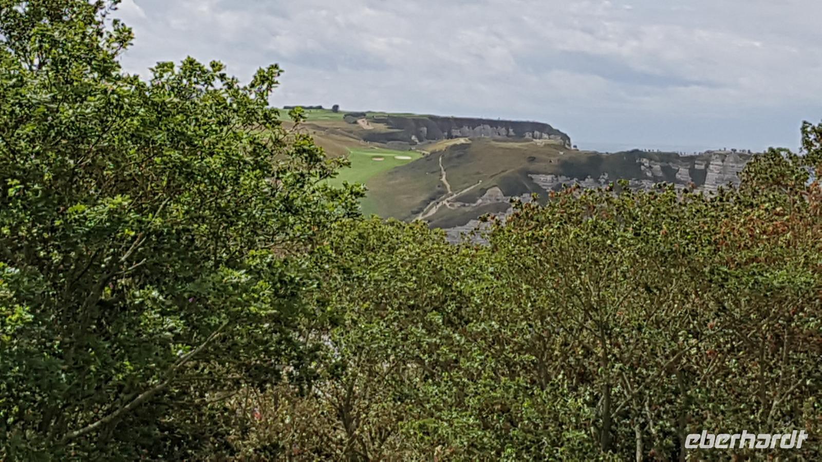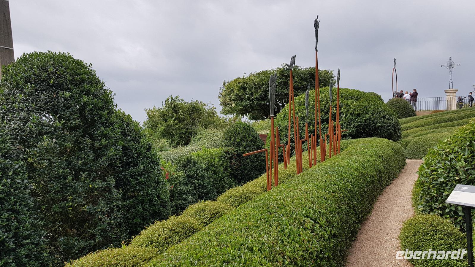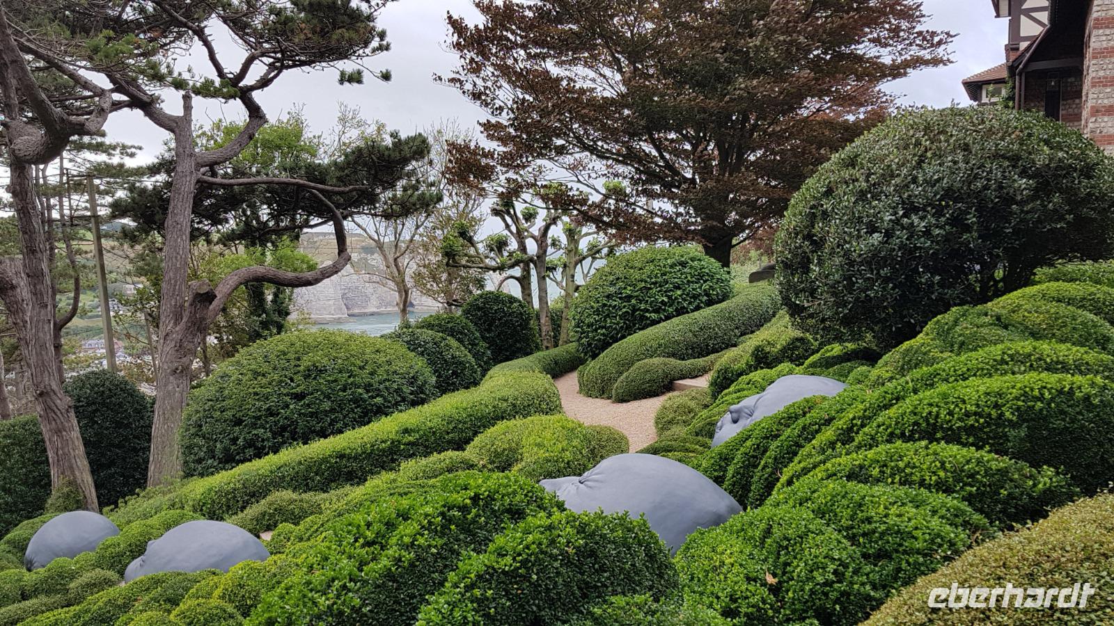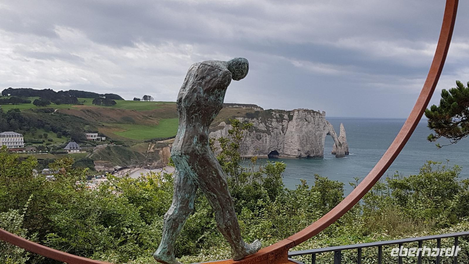 Dann ging es zur Côte d'Albâtre (Alabasterküste) nach Étretat. Zunächst genossen wir den Meerblick von der Promenade, die sich in Étretat von dem Falaise d'Aval mit der Porte d'Aval, einem großen Felsentor, vor dem die mächtige L'Aiguille (Felsnadel) steht, zur Falaise d'Amont erstreckt. Ein faszinierender Anblick, der schon Maler wie Eugène Delacroix, Camille Corot, Gustav Courbet, Eugène Boudin und Claude Monet begeisterte. Später gingen wir hinauf zu den Gärten von Etretat, die oberhalb der Falaise d'Amont liegen. Sie wurden von der seinerzeit berühmten Schauspielerin Madame Thébault angelegt, die sich vom Garten Claude Monets inspirieren ließ. Seine heutige Gestalt mit einzelnen in die Natur einbezogenen Kunstarrangement wie Köpfen, Figuren, Skulpturen und Objekten geht zurück auf den Landschaftsarchitekten Alexander Grivko und sein Team von IL NATURE. Sie geben der Anlage zusammen mit den fantastischen Ausblicken über die Küstenlandschaft eine einzigartige Poesie.
