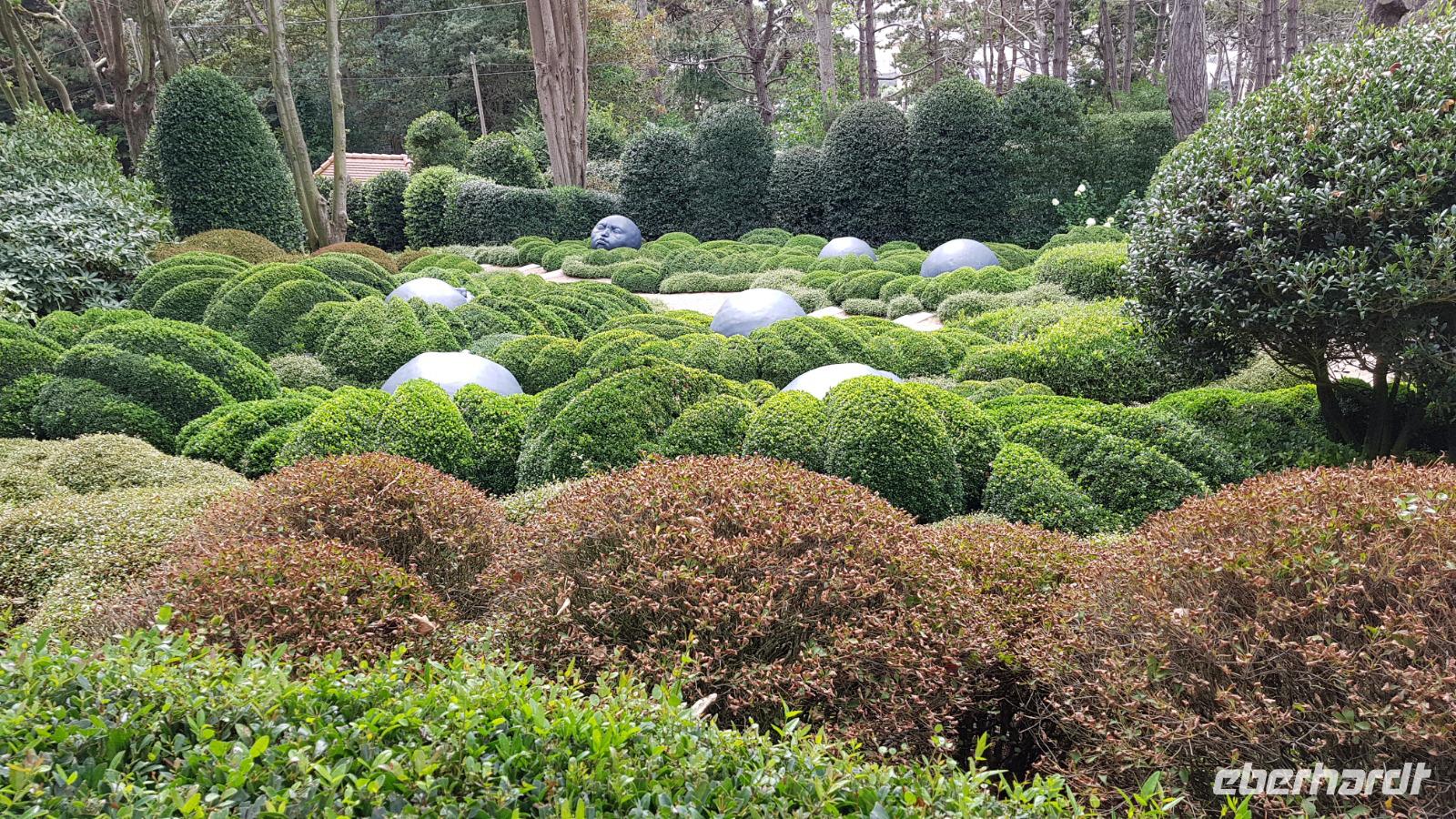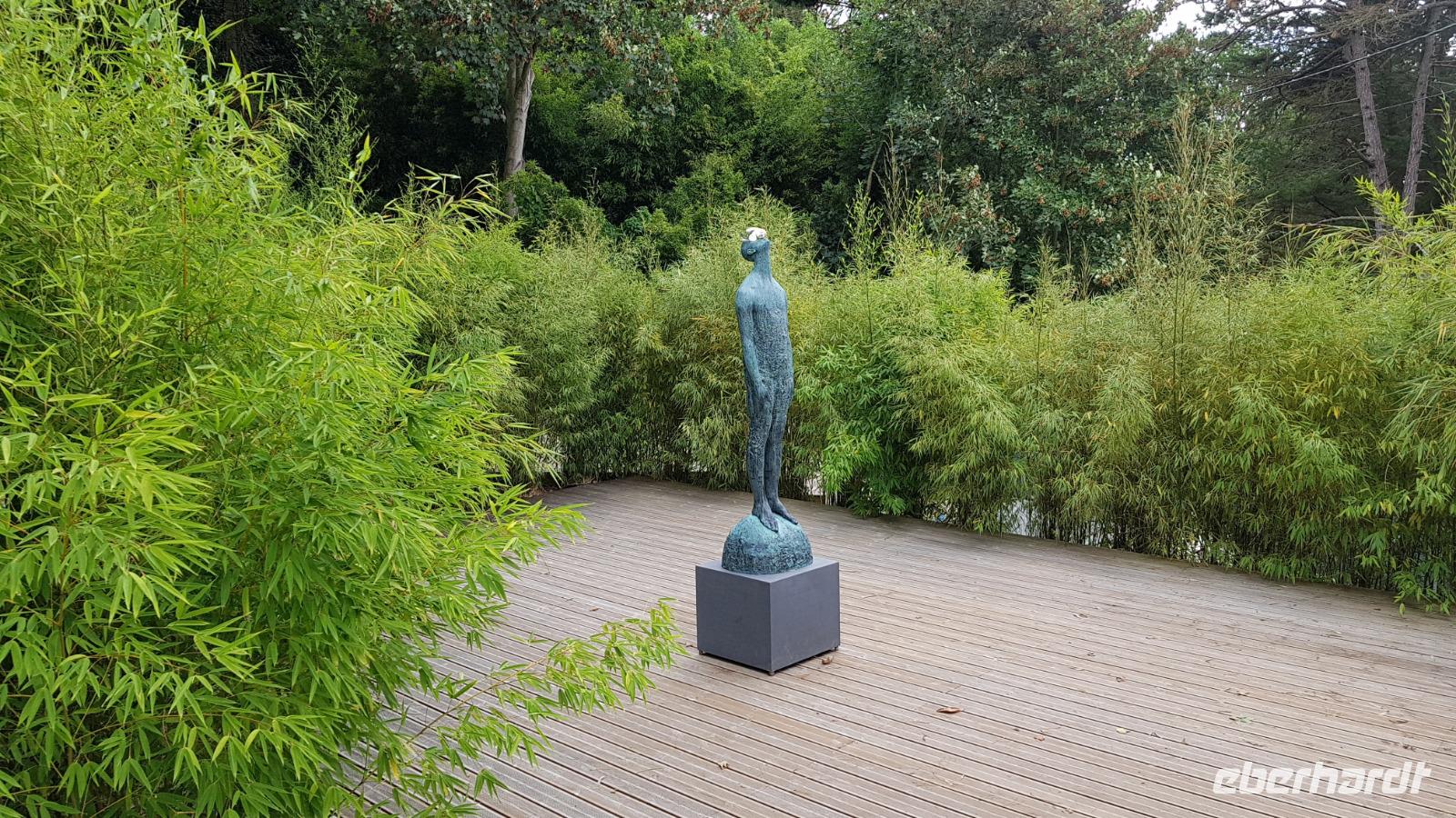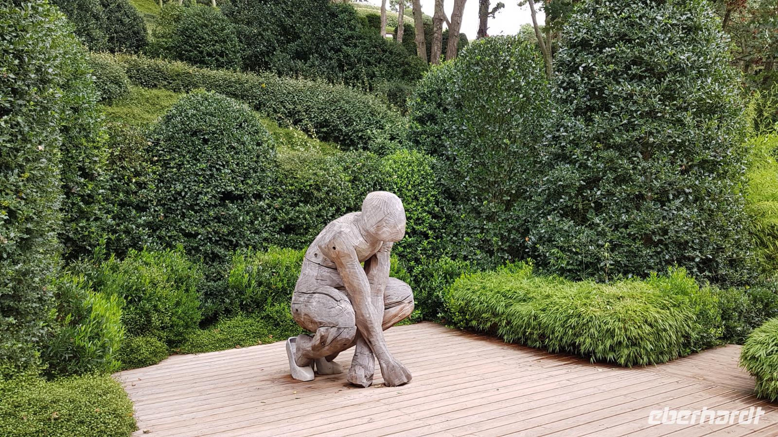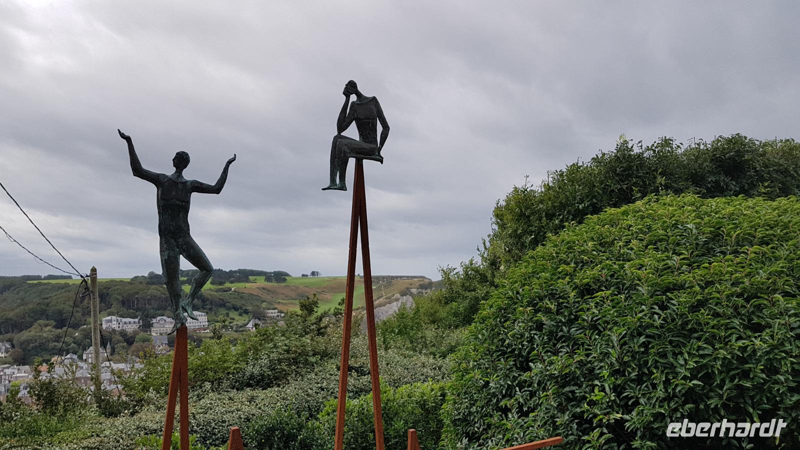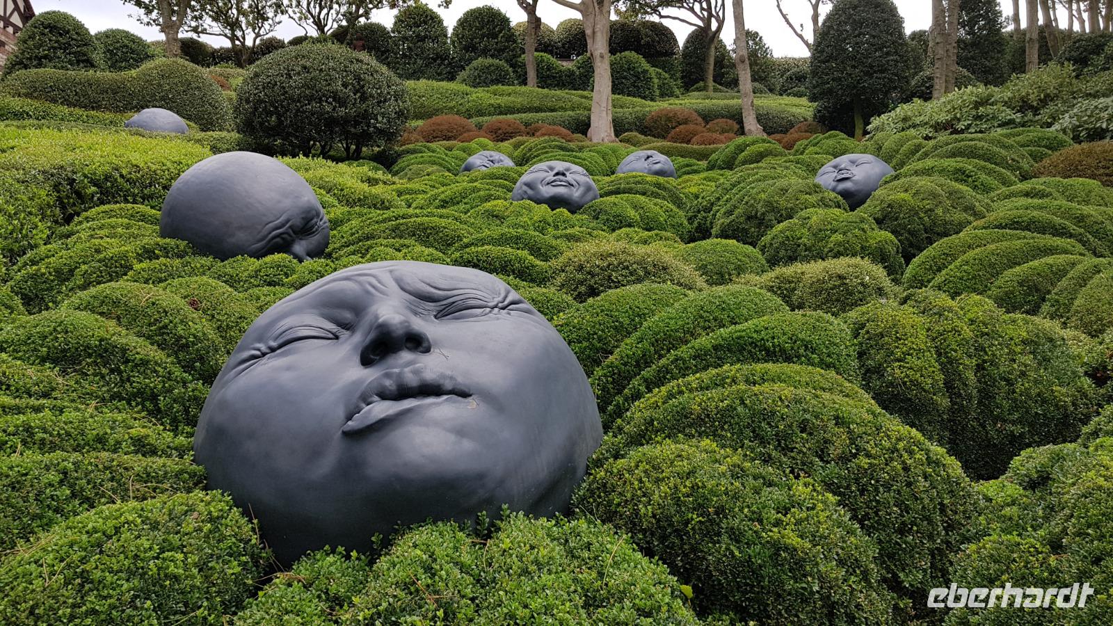 Dann ging es zur Côte d'Albâtre (Alabasterküste) nach Étretat. Zunächst genossen wir den Meerblick von der Promenade, die sich in Étretat von dem Falaise d'Aval mit der Porte d'Aval, einem großen Felsentor, vor dem die mächtige L'Aiguille (Felsnadel) steht, zur Falaise d'Amont erstreckt. Ein faszinierender Anblick, der schon Maler wie Eugène Delacroix, Camille Corot, Gustav Courbet, Eugène Boudin und Claude Monet begeisterte. Später gingen wir hinauf zu den Gärten von Etretat, die oberhalb der Falaise d'Amont liegen. Sie wurden von der seinerzeit berühmten Schauspielerin Madame Thébault angelegt, die sich vom Garten Claude Monets inspirieren ließ. Seine heutige Gestalt mit einzelnen in die Natur einbezogenen Kunstarrangement wie Köpfen, Figuren, Skulpturen und Objekten geht zurück auf den Landschaftsarchitekten Alexander Grivko und sein Team von IL NATURE. Sie geben der Anlage zusammen mit den fantastischen Ausblicken über die Küstenlandschaft eine einzigartige Poesie.