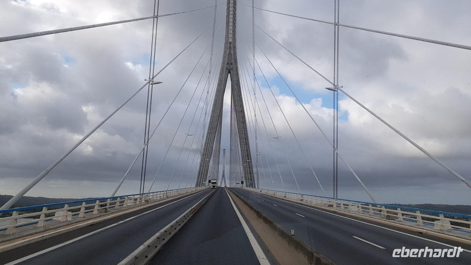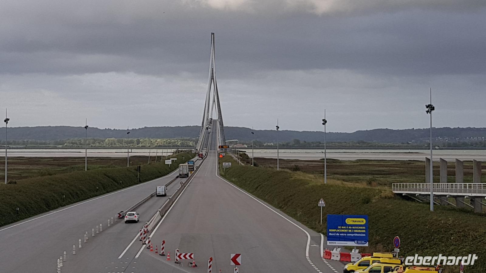 Nach einem entsprechend der Corona-Pandemie-Regeln eingerichteten Frühstücksbuffet im Hotel brachen wir auf, um die Seine zu überqueren. Zuerst legten wir einen Fotostopp bei der berühmten Pont de Normandie ein. Sie wurde 1988 bis 1984 nach Plänen von Michel Virlogeux erbaut und war seinerzeit die Brücke mit der größten Spannweite in Europa. Sie besteht aus einer Vorland- und einer Hauptbrücke und hat eine Gesamtlänge von 2141,25 Metern. Vom Gerüst über der Mautstelle hatten wir einen weiten Blick über die ca. 5 km breite Seinemündung und auf die elegant geformte Brücke. Dann fuhren wir über das Brückenbauwerk und gelangten von der Oberen in die Untere Normandie, die südlich der Seine beginnt.