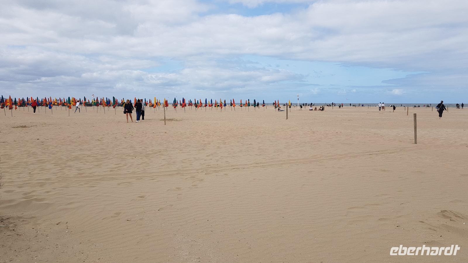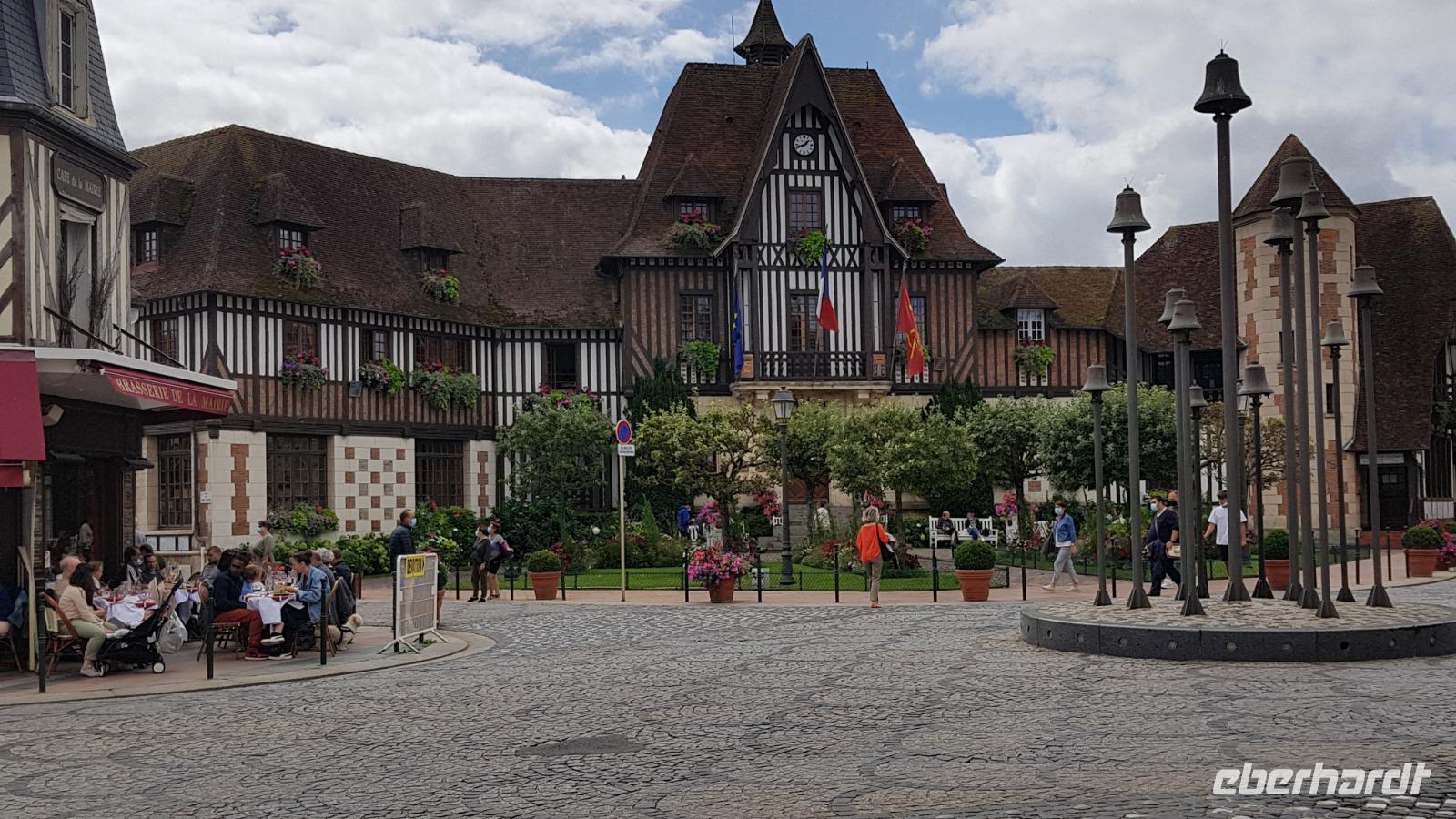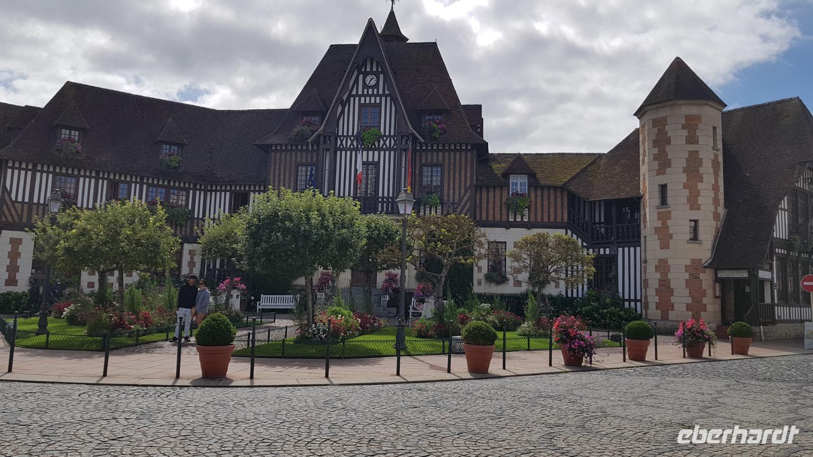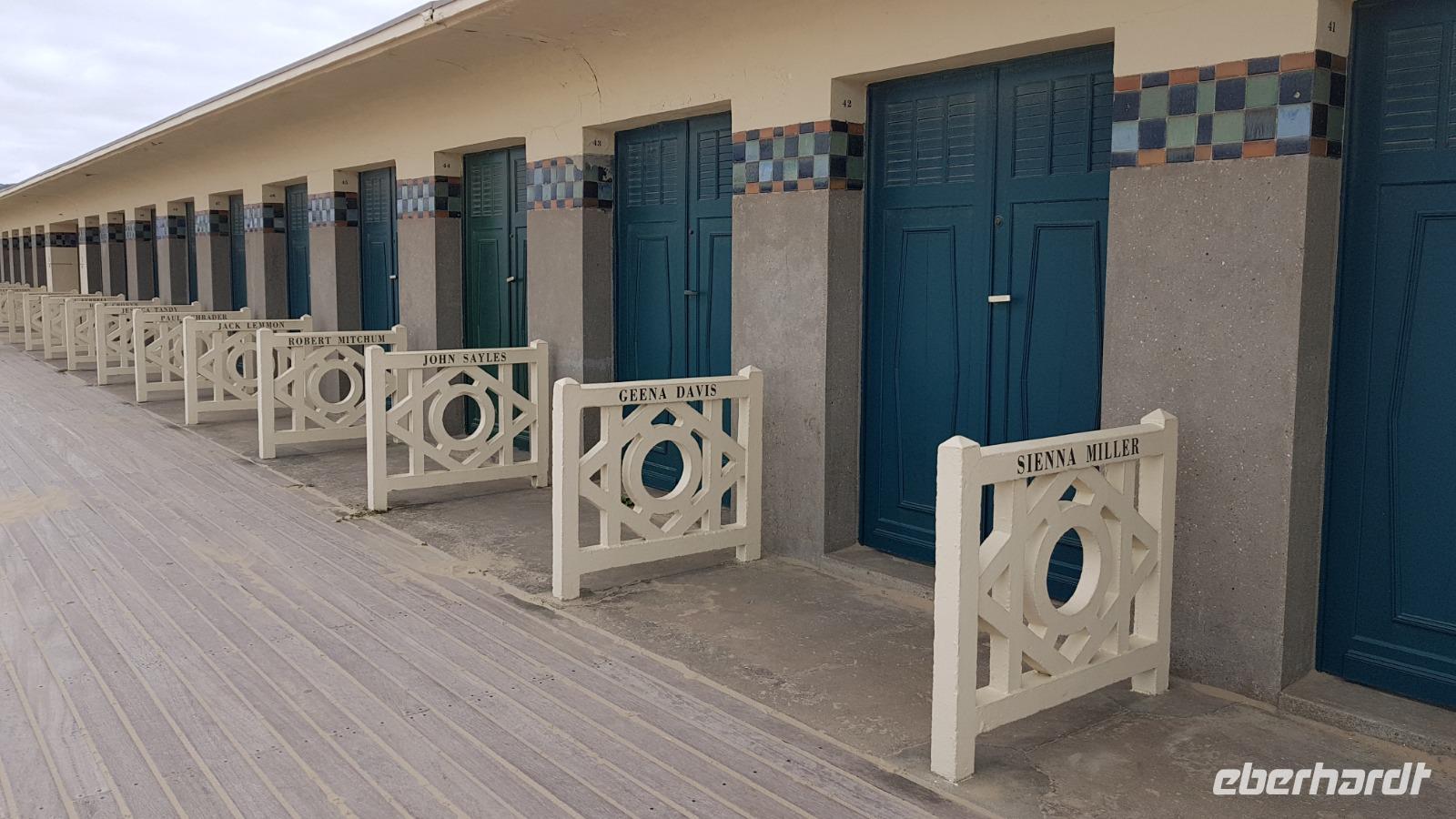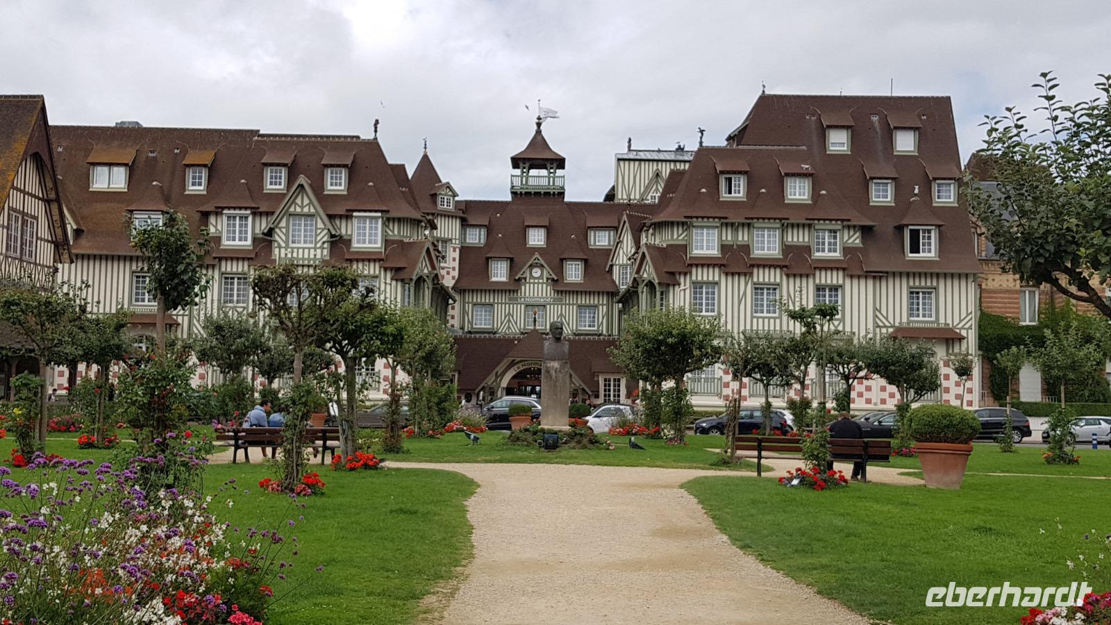 Gegen Mittag fuhren wir an der Côte Fleurie (Blumenküste) entlang nach Deauville. Drei Jahrzehnte nach dem benachbarten Strandbad Trouville, das seit 1830 florierte, begann sich das bisher kleine Küstendorf Deauville Dank der finanziellen Unterstützung des Herzogs von Morny und der Raffinesse des ehemaligen Journalisten Eugéne Cornuche zu einem der elegantesten Seebäder zu entwickeln. In den 1860ger Jahren als sich Kaiser Napoleon III. hin und wieder in Deauville aufhielt, wurden die Hafenbecken und 1864 die Pferderennbahn errichtet. In den folgenden Jahrzehnten entstand die großen Luxushotels wie das Hotel „Normandy" und 1912 wurde das Casino eröffnet. Ein Jahr später ließ sich Coco Chanel in Deauville nieder, wo sie mit Hilfe ihres Geliebten, dem englischen Geschäftsmann Arthur Edward Capel ihre erste Boutique eröffnete. Mit mit jährlichen Großveranstaltungen wie dem „große(n) Hindernislaufen von Deauville", dem „große(n) Springreiten" und dem „große(n) Preis von Clairefontaine" ist Deauville zu einer festen Adresse des internationalen Pferdesports geworden. Alljährlich findet hier ebenfalls das berühmte Festival des „Amerikanischen Films" statt. Am Strand erinnern die Namen auf den Geländern vor den Umkleidekabinen an die Größen die Films, die hier gefeiert wurden.