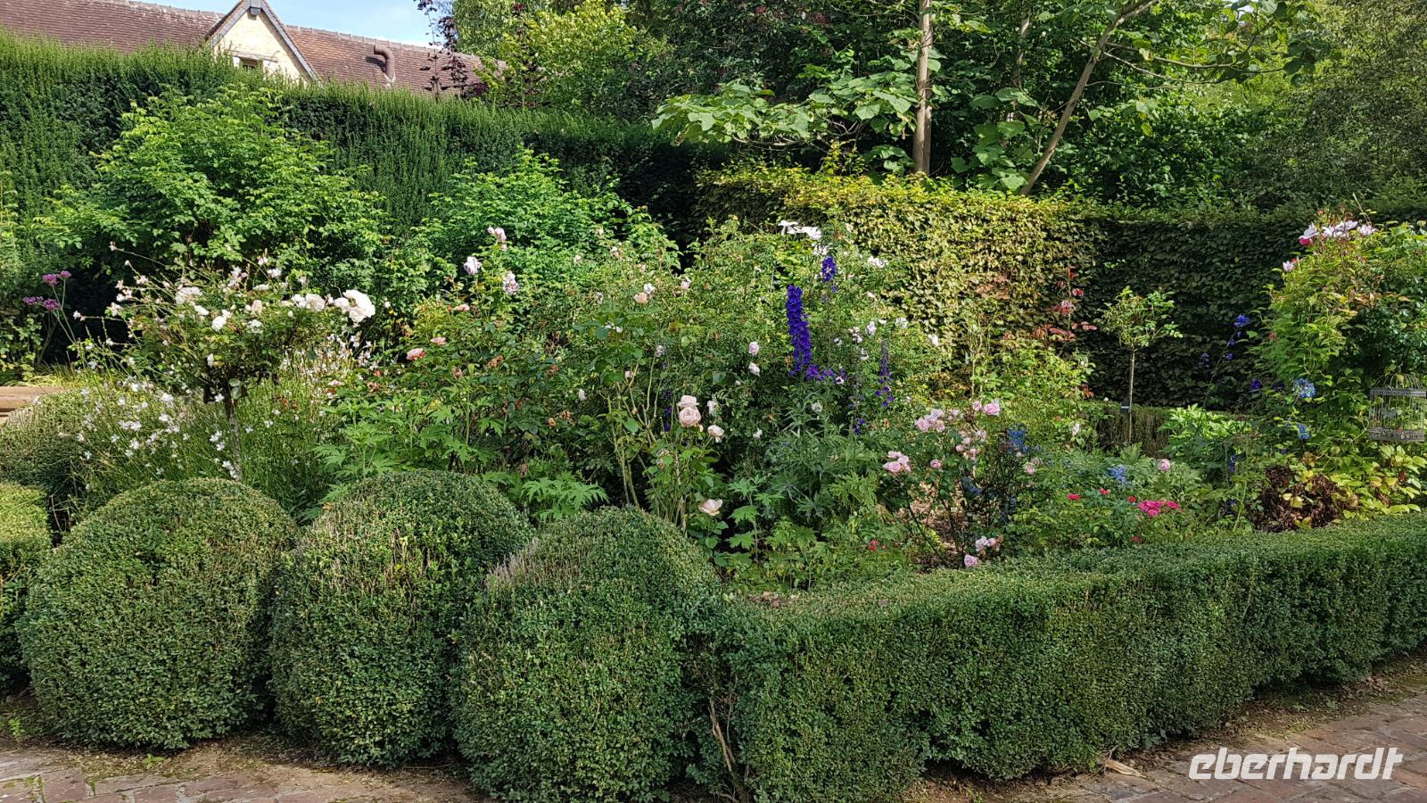 Nach dem Besuch der Abtei ließen wir die weite Bucht vom Mont-St-Michel und die normannische Küste hinter uns und fuhren in den östlichsten Winkel der Normandie, ins Perche. Diese Region befindet sich im Departement Orne und ist für seine mit Hecken umgebenen Weidelandschaften bekannt. Das Perche ist die Heimat der Kaltblut-Pferderasse Percheron, das ursprünglich bei schweren Arbeiten eingesetzt wurde. Heute schätzt man vor allem die hervorragenden Reiteigenschaften des Percheron und bildet es für die „Hohe Schule" aus. Um ein ehemaliges Gestüt der Percherons handelt es sich auch bei dem Jardin François den wir in der Nähe der Gemeinde Préaux-du-Perche besuchten. Dieser Garten wurde 1995 angelegt und hat eine Fläche von 2 Hektar. Kundig geführt durch die Landschaftsarchitektin des Gartens spazierten wir durch Gartenräume wie den Rosengarten, den blauen Garten, den Garten den Baches und probierten abschließend heimischen Apfelsaft und Cidre zu leckeren Keksen.