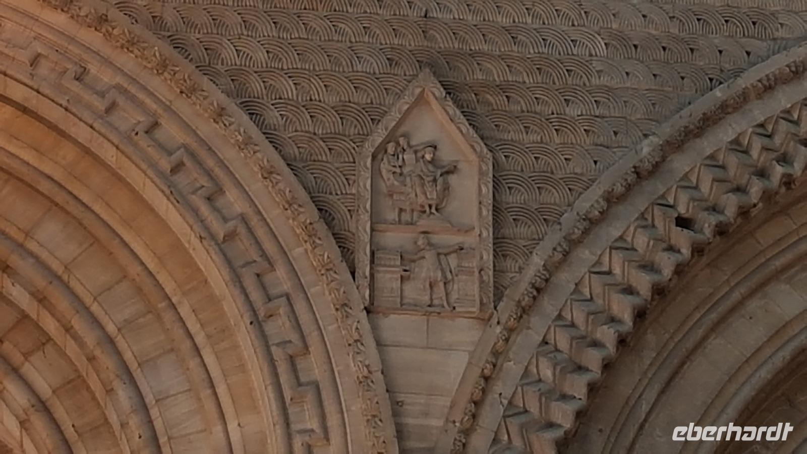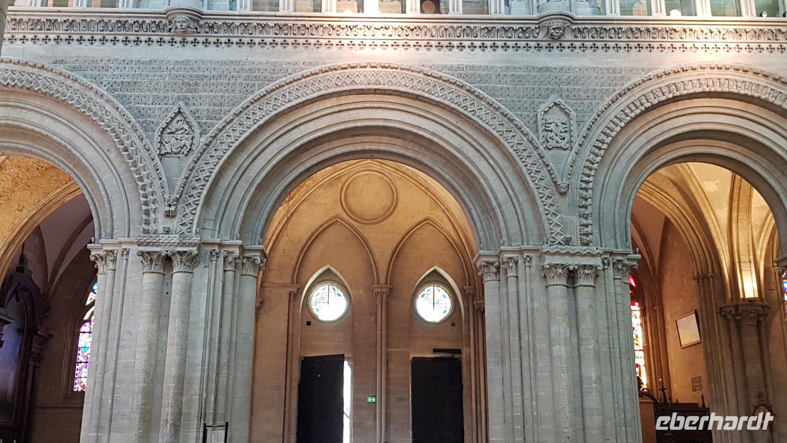 Anschließend besichtigten wir die Kathedrale von Bayeux, die zweifellos zu den schönsten romanisch-normannischen Kirchenbauten gehört. Die Dekorationen des Innenraums sind hier besonders reichhaltig und erstrecken sich auch über die Wände des Hauptschiffs. Diese werde außerdem mit Reliefs geschmückt unter denen sich die berühmte Schwurszene Harolds genau so dargestellt befindet, wie wir sie zuvor auf dem Teppich sahen.