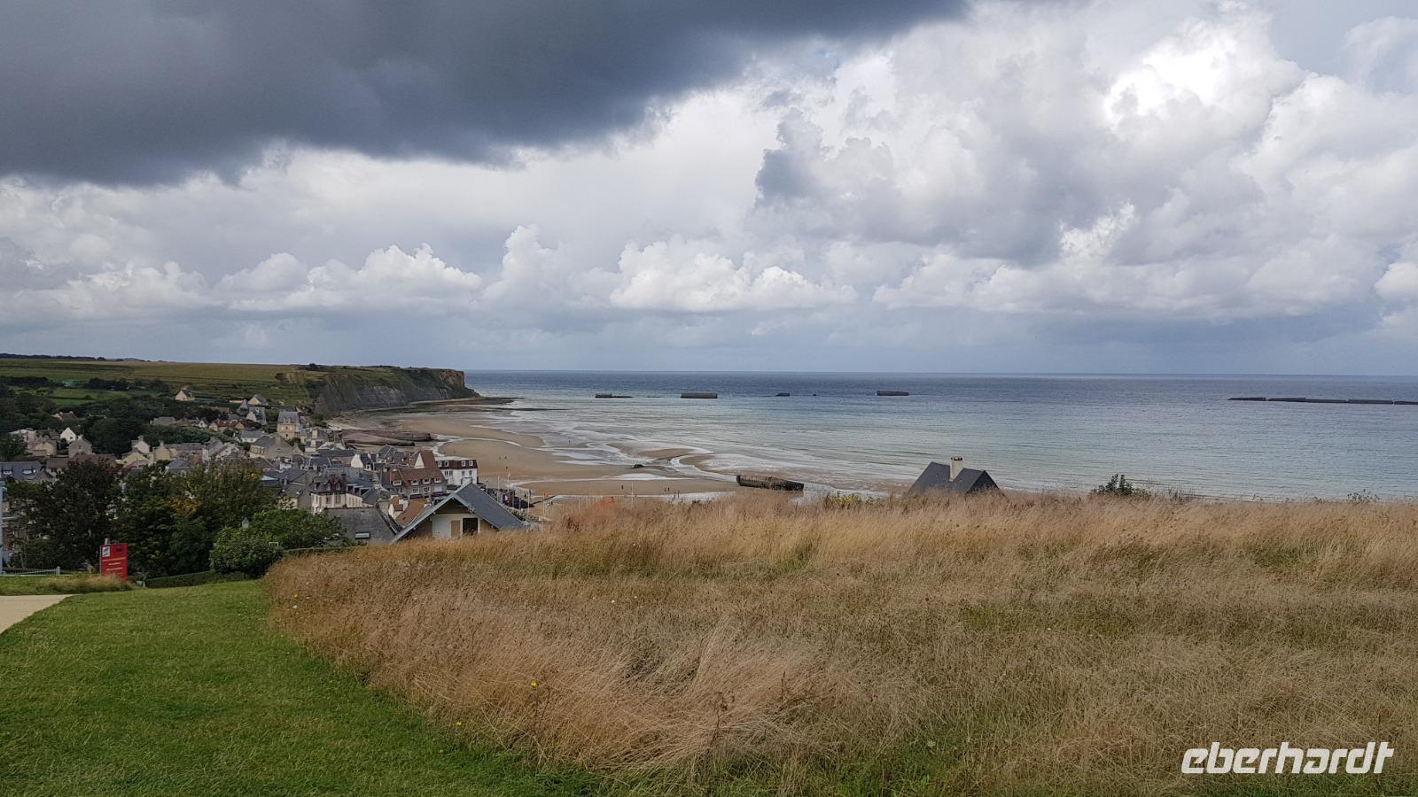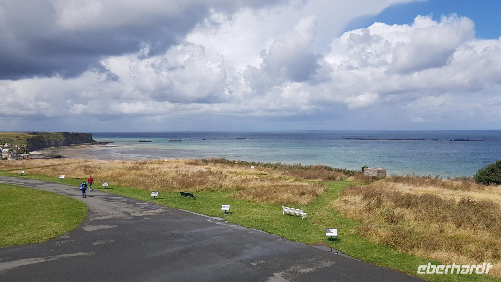 Nach dieser Pause trafen wir uns wieder am Bus, um zur Côte de Nacre (Perlmuttküste) zu fahren. Auf dem Weg zum Amerikanischen Soldatenfriedhof in Colleville-sur-Mer legten wir einen Fotostopp in Arromanches ein. Dieser Ort gehörte im Rahmen der Landungsoperation „Neptun" am 6. Juni 1944 zum Landeabschnitt Gold Beach, der von den Amerikanischen Truppen eingenommen wurde. Nach der Landung wurde hier der erste Hafen für die Alliierten gebaut, über den Truppen und Nachschub an Land gebracht wurden und blieb bis zur Einnahme von Cherbourg in Betrieb.
