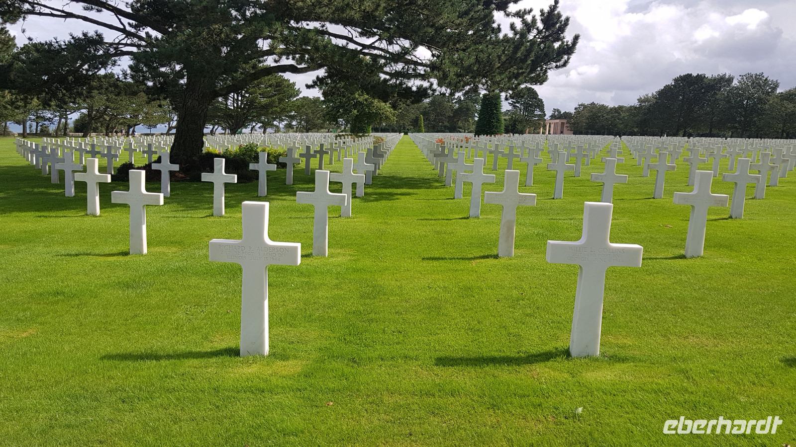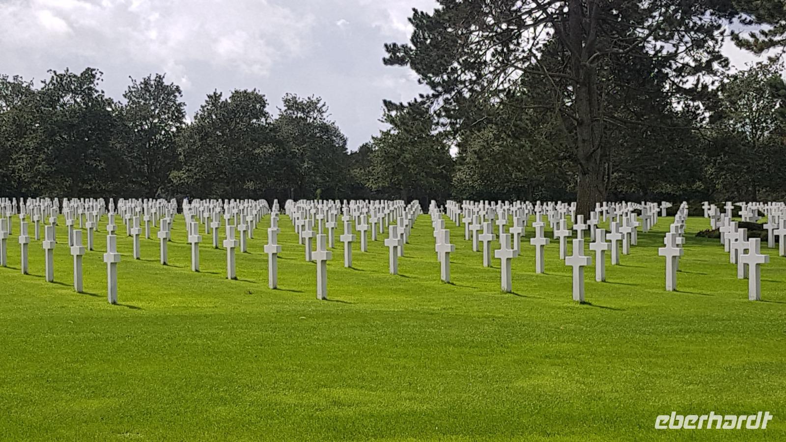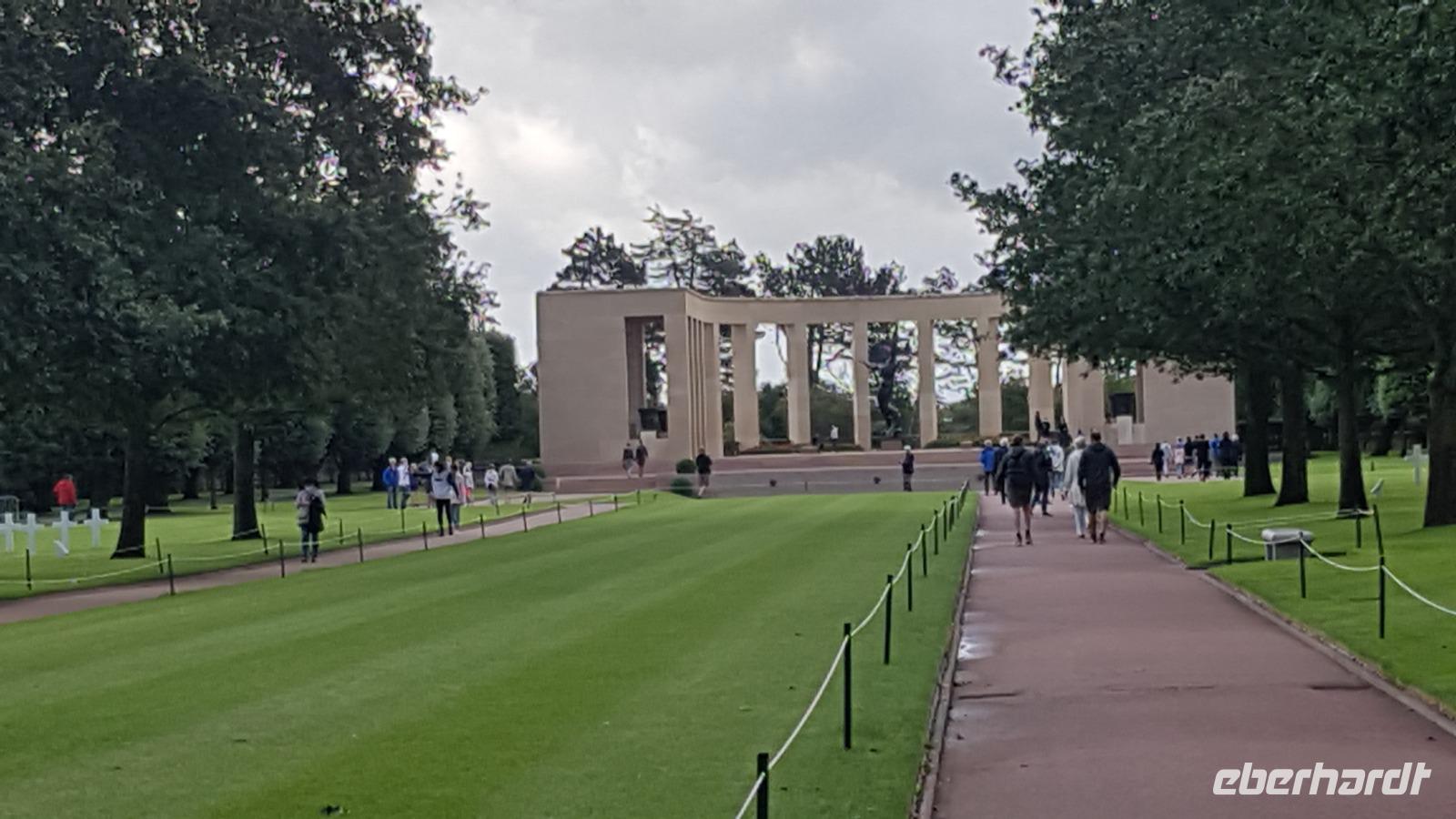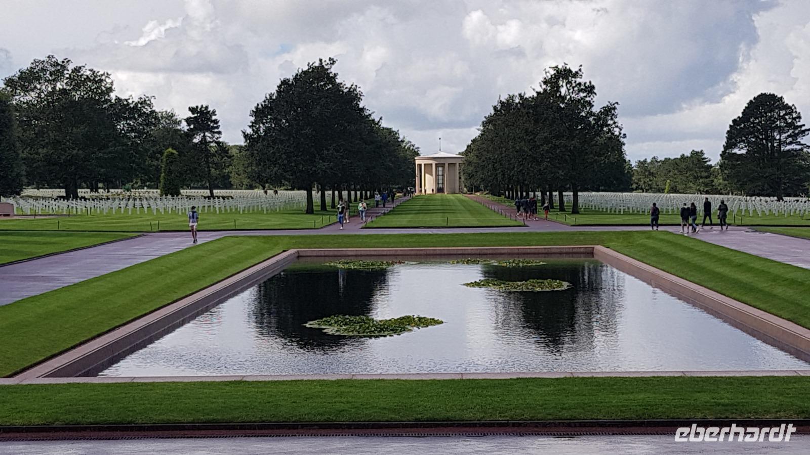 Wenig später erreichten wir den „Normandy American Cemetery" (Amerikanischen Friedhof in der Normandie) von Colleville-sur-Mer, der in dem ebenfalls von Amerkanischen Truppen eroberten Landungsabschnitt Omaha Beach lag. Hier befinden sich 9.386 Gräber und ein Mahnmal für 1.557 Vermisste. Unser Weg führt zwischen dem Strand mit seinem im Sonnenlicht blendend hellen Sand und den weißen Grabkreuzen der Gefallenen bzw. weißen Sternen für die jüdischen Soldaten entlang zu einer kreisförmigen Kapelle sowie zu einer halbkreisförmigen Anlage, an deren Wänden die Pläne der Landungsoperation der Alliierten dargestellt sind. In dieser beeindruckenden Anlage beginnt der Film „Der Soldat James Ryan" von Steven Spielberg aus dem Jahr 1998.