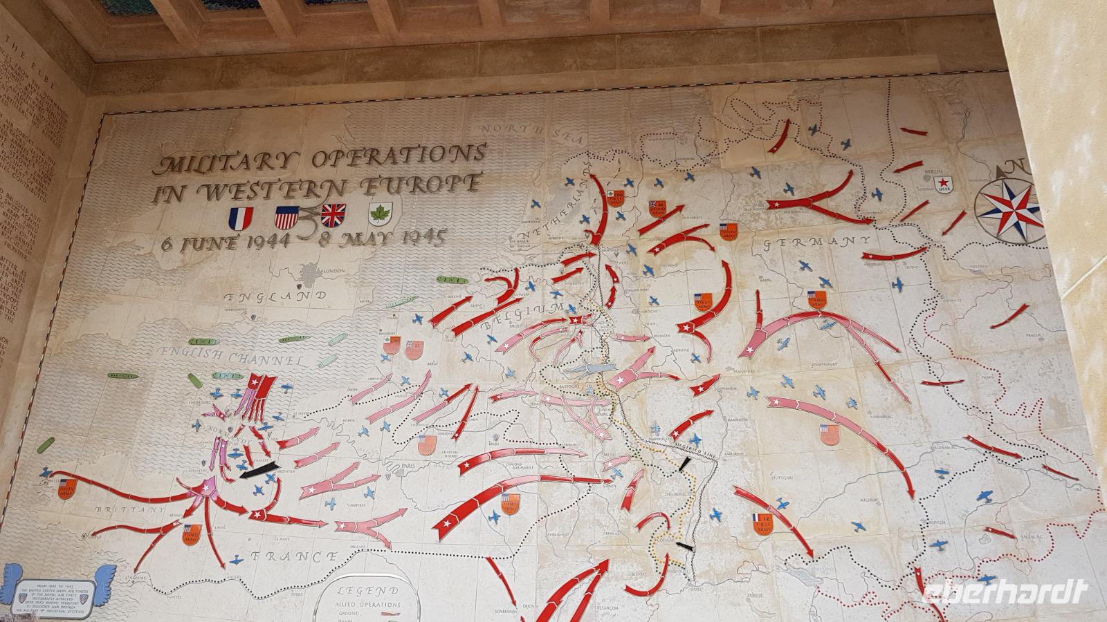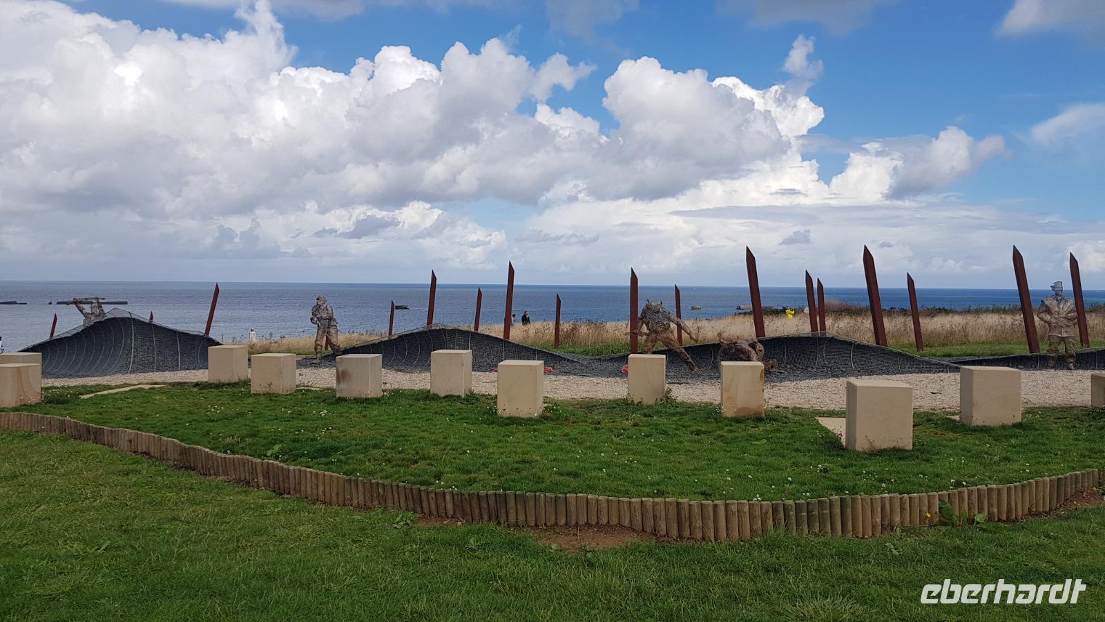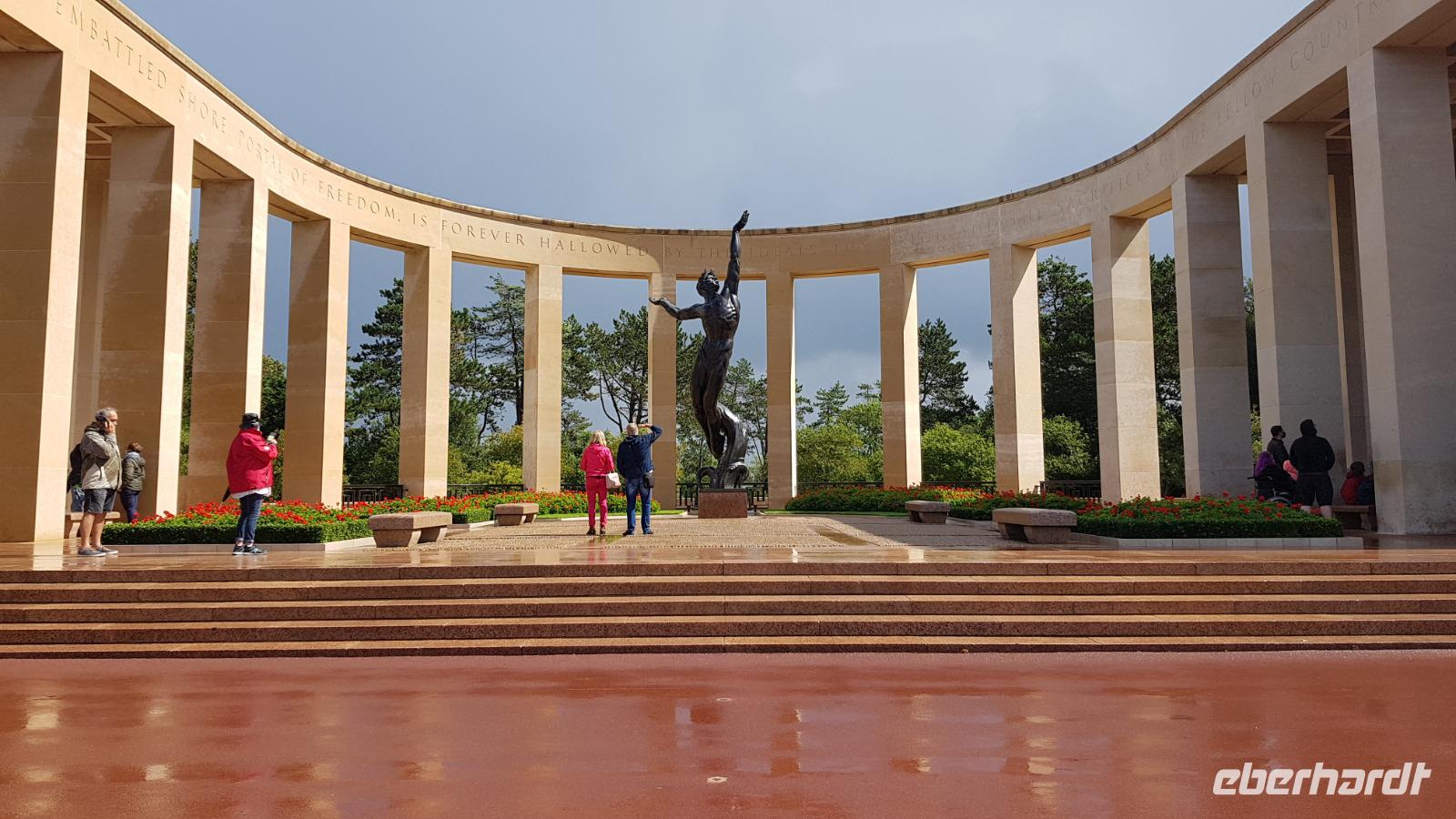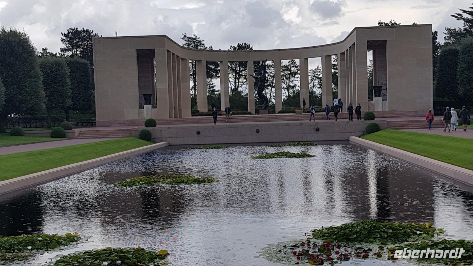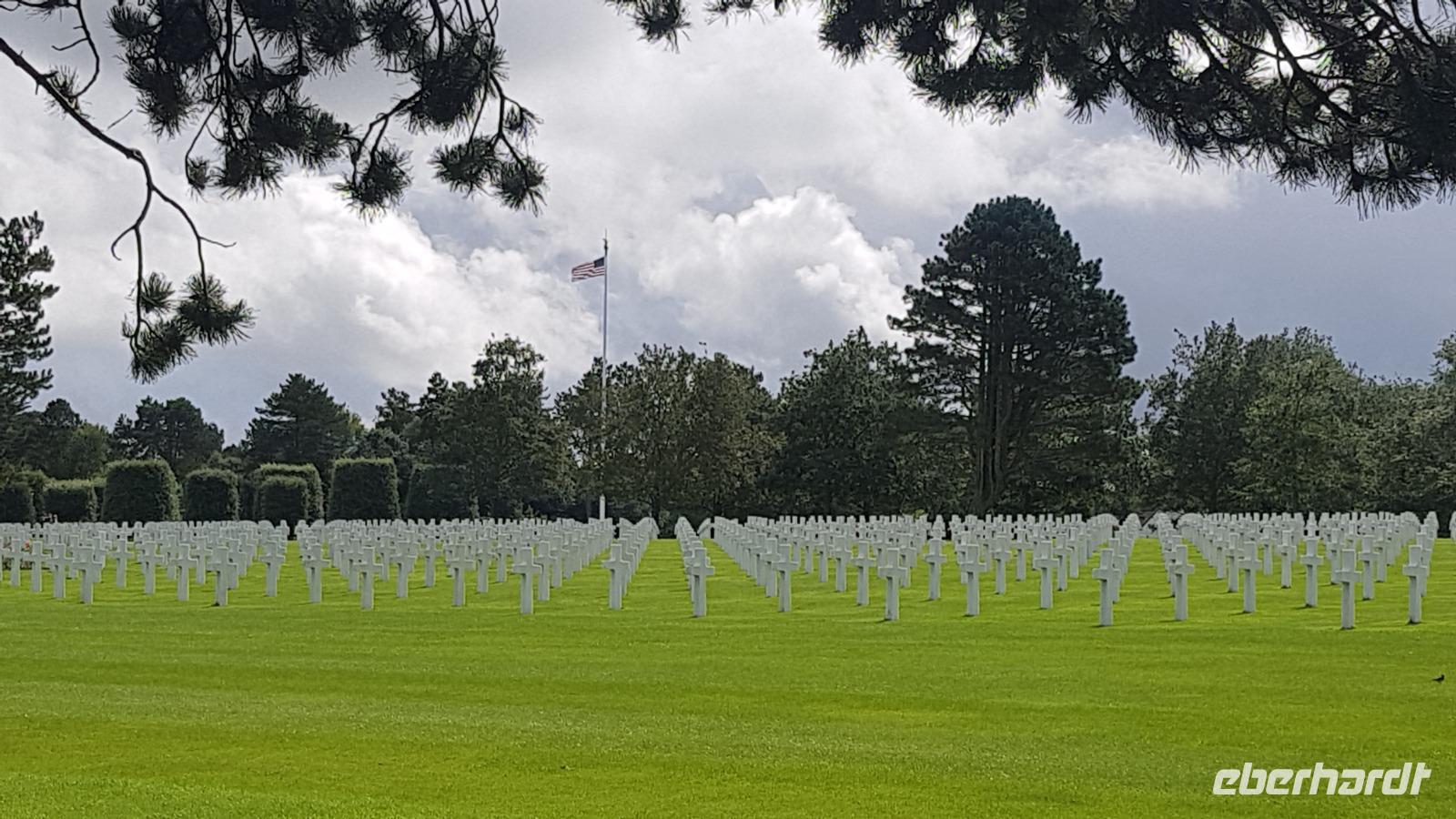 Wenig später erreichten wir den „Normandy American Cemetery" (Amerikanischen Friedhof in der Normandie) von Colleville-sur-Mer, der in dem ebenfalls von Amerkanischen Truppen eroberten Landungsabschnitt Omaha Beach lag. Hier befinden sich 9.386 Gräber und ein Mahnmal für 1.557 Vermisste. Unser Weg führt zwischen dem Strand mit seinem im Sonnenlicht blendend hellen Sand und den weißen Grabkreuzen der Gefallenen bzw. weißen Sternen für die jüdischen Soldaten entlang zu einer kreisförmigen Kapelle sowie zu einer halbkreisförmigen Anlage, an deren Wänden die Pläne der Landungsoperation der Alliierten dargestellt sind. In dieser beeindruckenden Anlage beginnt der Film „Der Soldat James Ryan" von Steven Spielberg aus dem Jahr 1998.