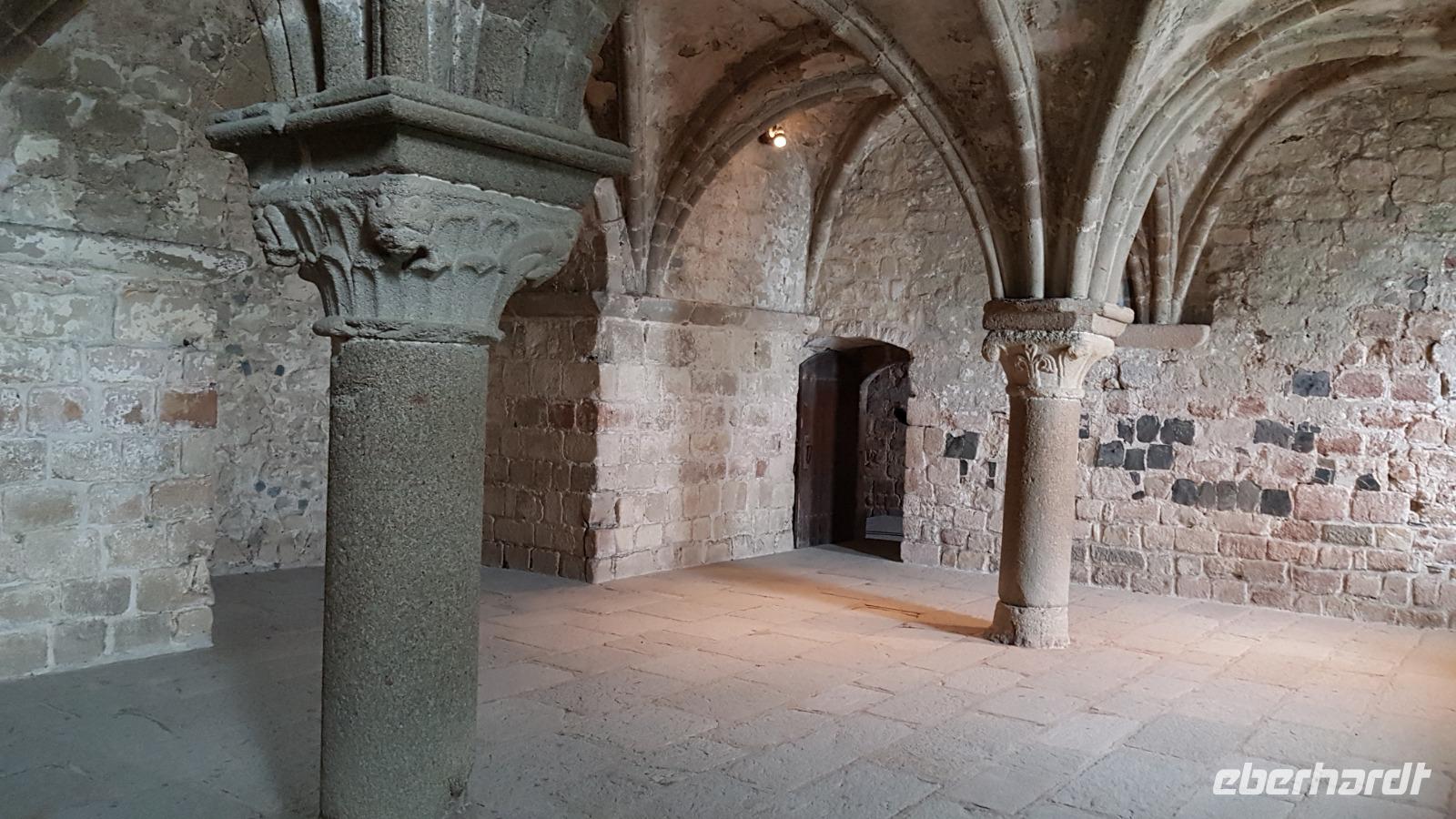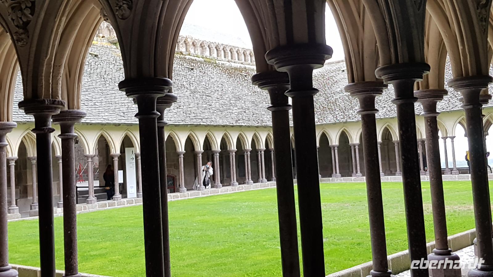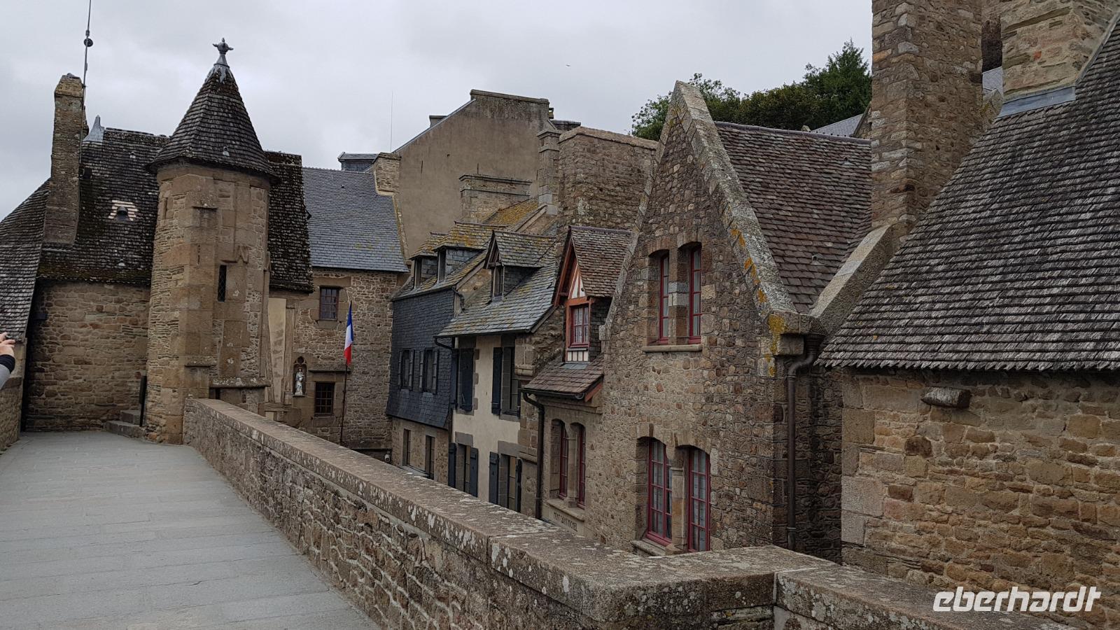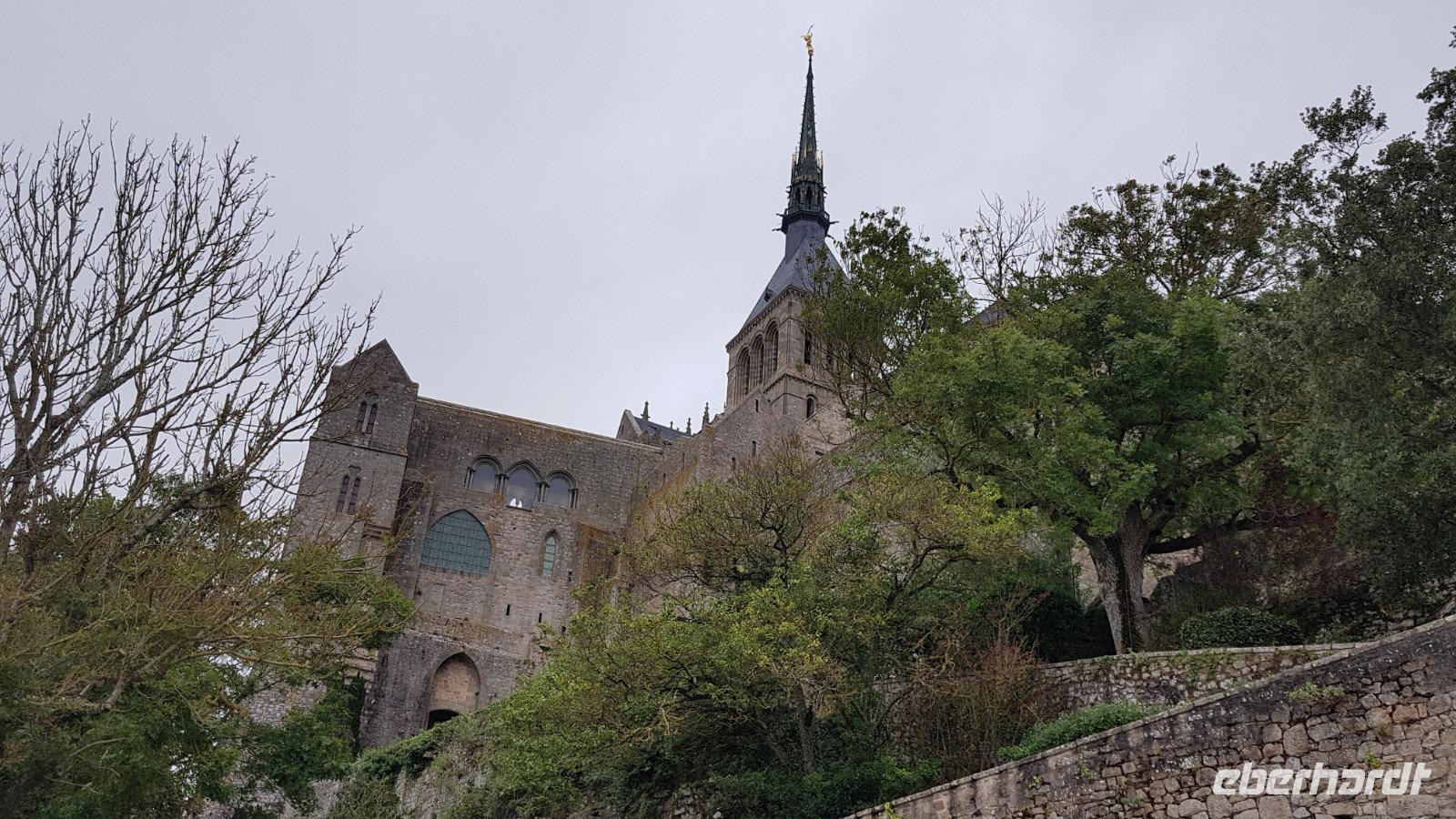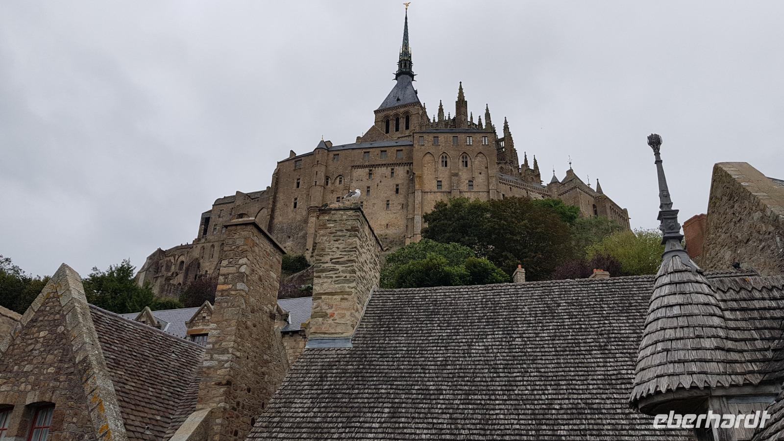 Nach dem Frühstück im Hotel luden wir die Koffer in unseren Bus und gingen zur Stadtion des Shuttles, das uns über die neu erbaute Stelzenbrücke zum Mont-St-Michel fahren sollte. Von der Porte du Roi (Eingangsportal des Königs) aus begannen wir unseren Aufstieg zur Abtei, der über immer steiler ansteigende Straßen schließlich zu einer Reihe von Treppen führen sollte. Während wir dann an der langen Treppe vor dem Abteieingang warten mussten, bekamen wir Flyer, in denen wir die Geschichte des Mont-St-Michel nachlesen und uns über den Besuch der Abtei informieren konnten, durch die wir gleich ausgerüstet mit Audioguides wandern würden. Der Mont-St-Michel ist der größte erhaltene Baukomplex des Europäischen Mittelalters. Schon im Jahr 708 wurde eine erste Kirche auf dem Inselberg erbaut. Mitte des 10. Jahrhunderts ließen sich hier Benediktinermönche nieder, die im Jahr 1017 mit dem Bau der Klosteranlage begannen. Die französischen Könige und mächtige Herzöge finanzierten den Bau der Abtei, die erst 1520 fertiggestellt war. Schon im 12. Jahrhundert war der Mont-St-Michel Ziel vieler Pilgerströme, darunter vor allem im späten Mittelalter auch Kinderwallfahrten. Während der französischen Revolution verließen die Benediktiner das Kloster, das ab 1790 als Gefängnis genutzt wurde. Als mit dem von Victor Hugo ausgehenden neuen Interesse an der Kultur des Mittelalters auch der Mont-St-Michel wieder neu gesehen wurde, erfolgte 1863 die Schließung des Gefängnisses und die Restaurierung der Abtei. 1966, ein Jahrtausend nachdem sich die ersten Mönche auf dem Inselberg nieder gelassen hatten, bezogen erneut Ordensleute die Abtei. Es ist heute die Gemeinschaft der Schwestern und Brüder von Jerusalem. Der Mont-St-Michel ist UNESCO-Weltkulturerbe und gilt als eine der bekanntesten und meistbesuchten Sehenswürdigkeiten der Welt.