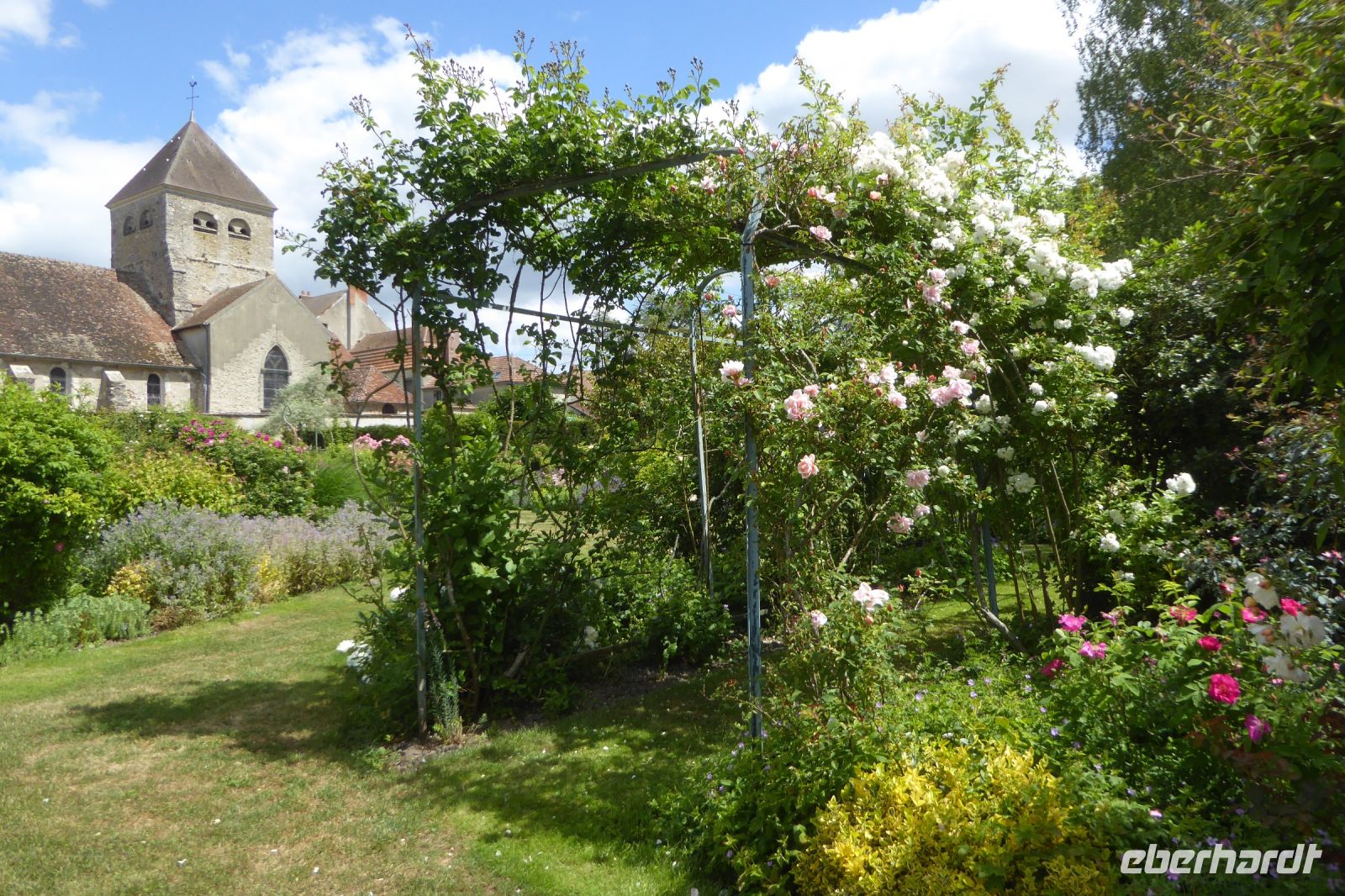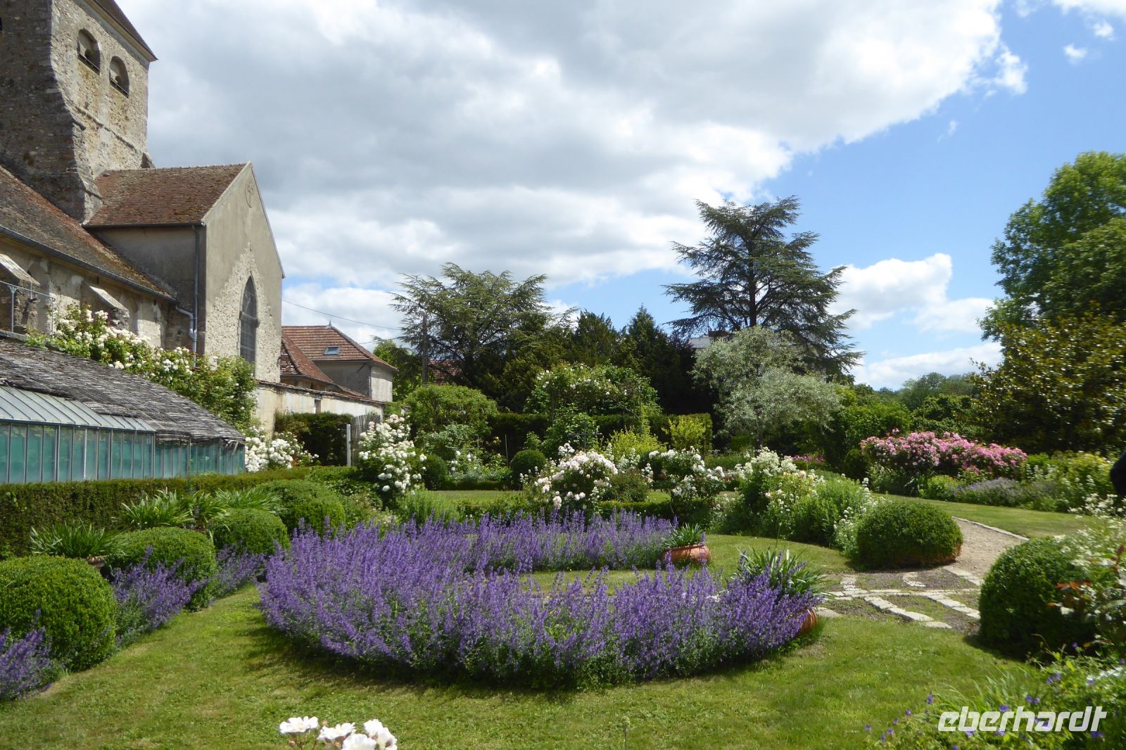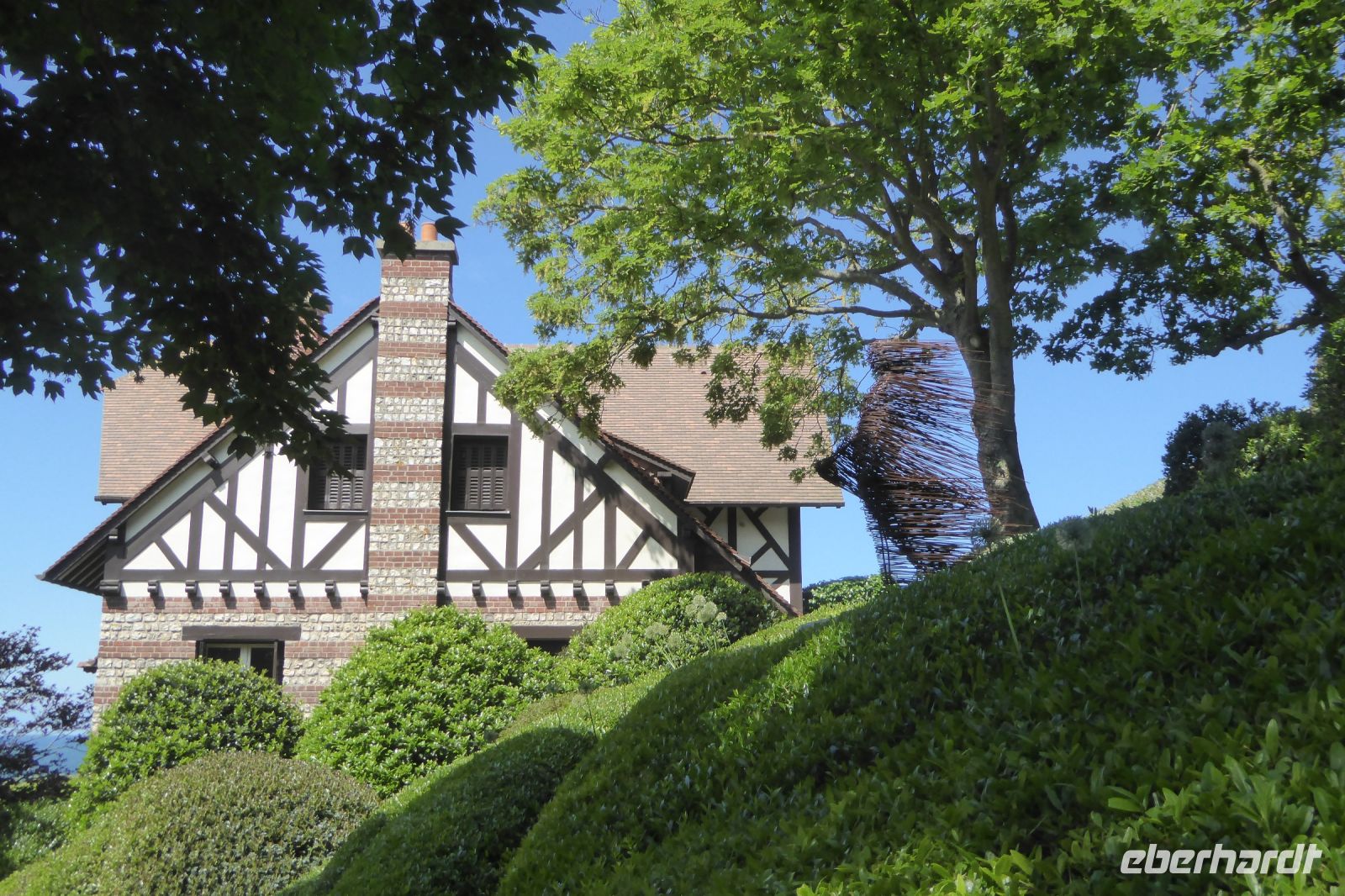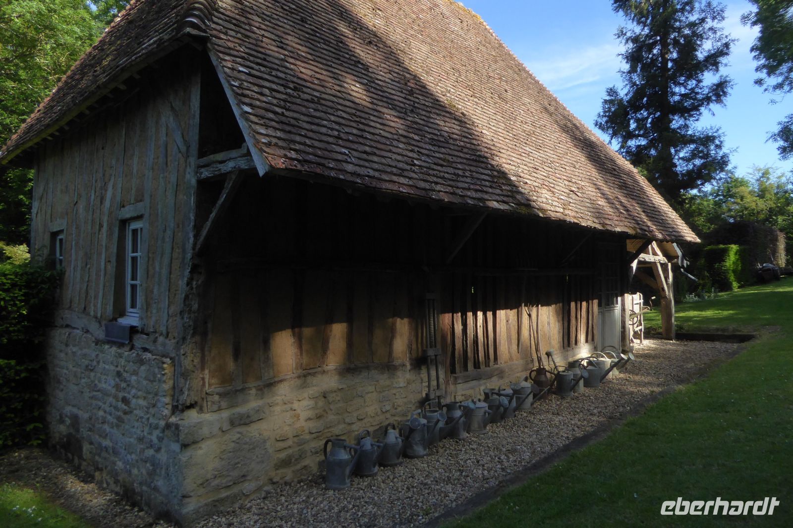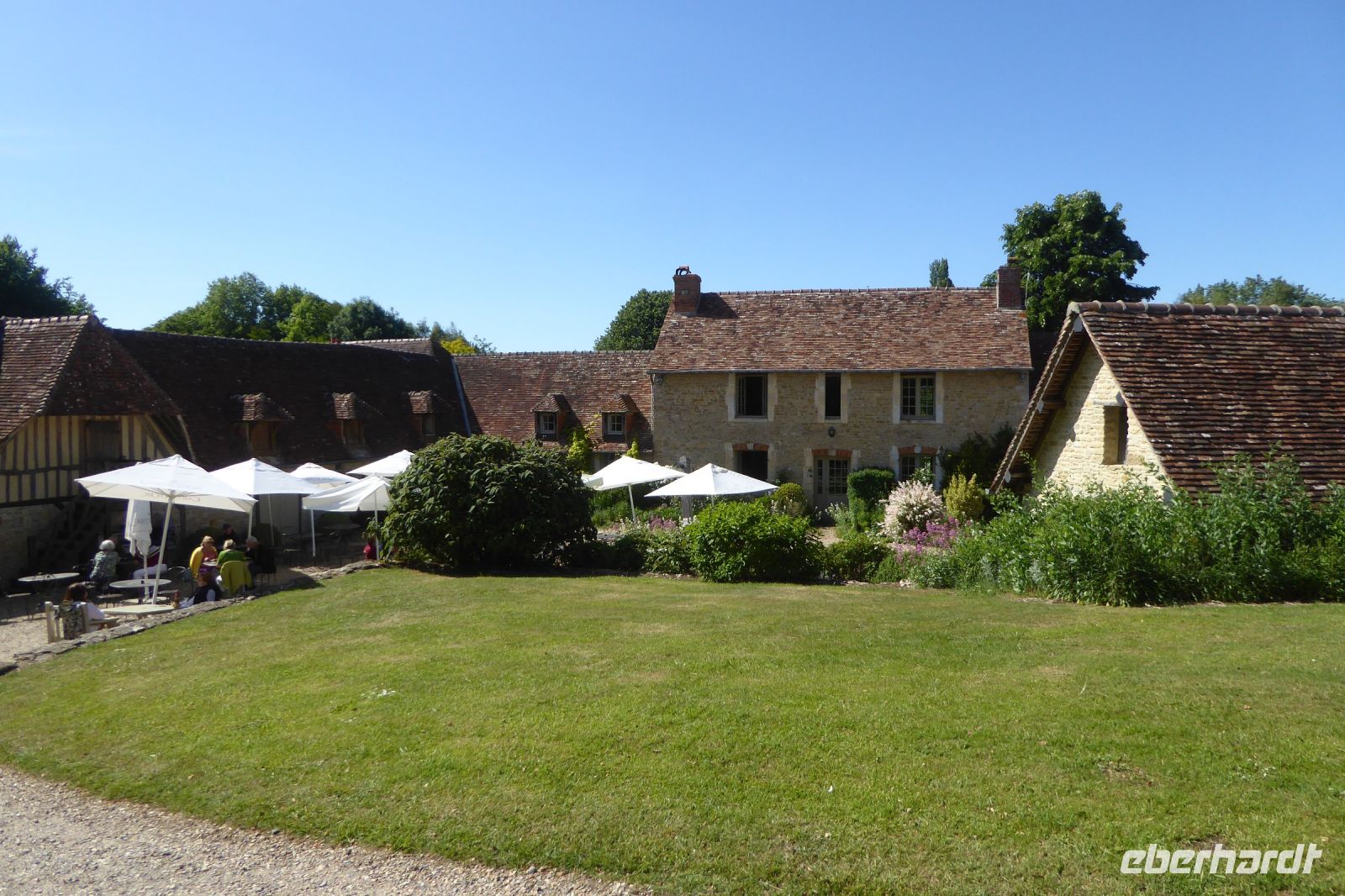 Auf Apfelwiesen weidende Kühe sind ein typisches Bild für das Pays d'Auge, einem Landstrich in der Normandie. Cidre, Calvados und Camembert gehören deshalb ebenso dazu wie die landestypischen Fachwerkhäuser. Über die eigenwillige Streckenführung unseres Fahrers Jens Fritsch gelangten wir auf engen Nebenstraßen nach Cambremer. Auf dem vier Hektar großen gepflegten Gartengelände von Armelle und Jacques Noppe findet man einige alten Gebäude, die Monsieur Noppe vor dem Verfall gerettet und in seinem Garten wieder aufgebaut hat. Liebevoll eingerichtet mit alten Handwerksgeräten erzählen sie heute vom Leben der Menschen früherer Generationen. Der Landschaftsarchitektin Chantal Lejard-Gasson oblag die Planung des Gartens mit seinen verschiedene Themengärten: ein Sonnengarten, ein Mondgarten, der Garten der Düfte, der Engel, des Teufels, ein Purpurgarten und einige mehr. Und immer wieder die üppig blühenden beeindruckend duftenden Rosen! Der Rasen lud zum barfuß laufen ein und jeder Besucher findet hier sein ruhiges Plätzchen.