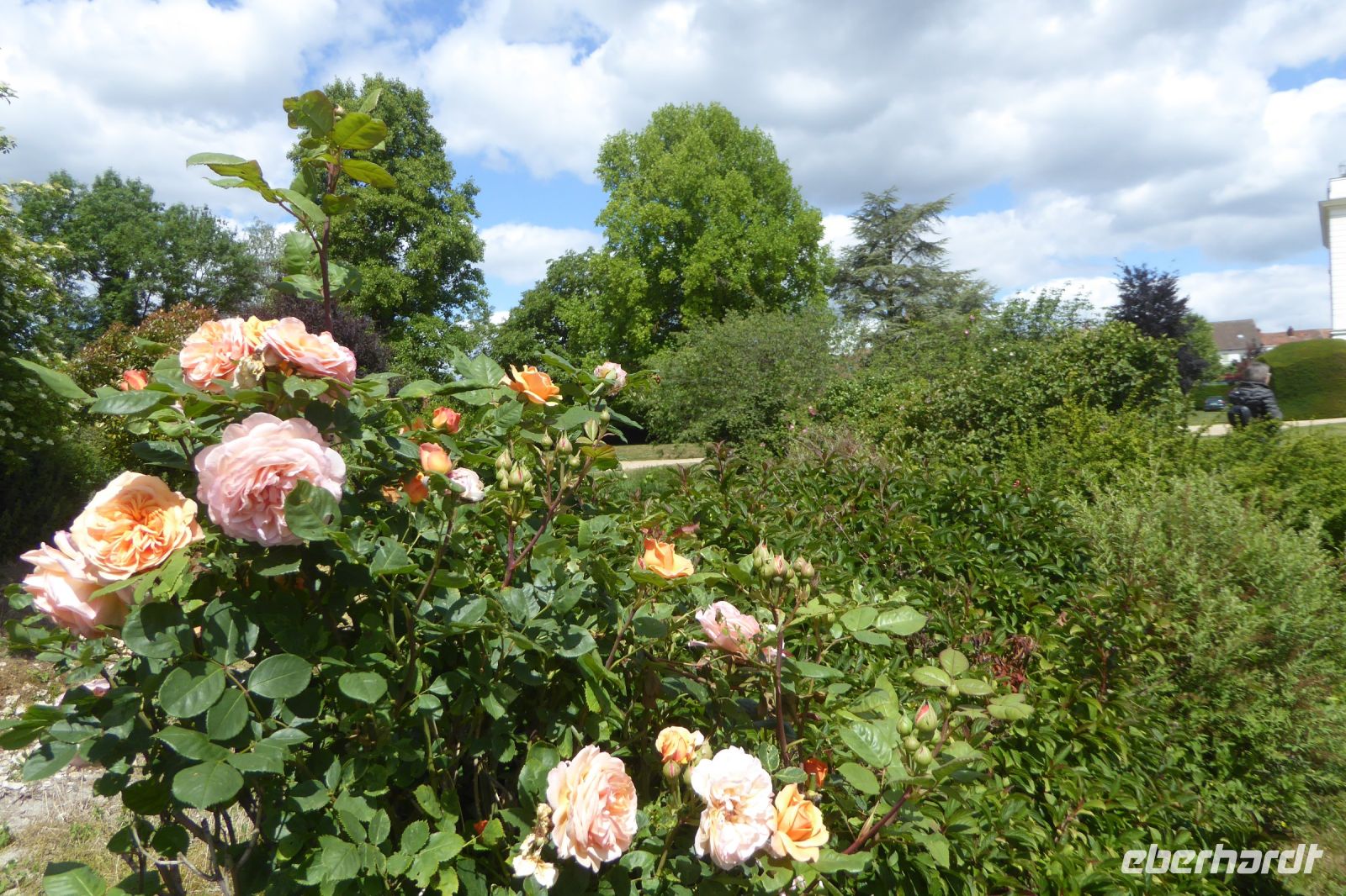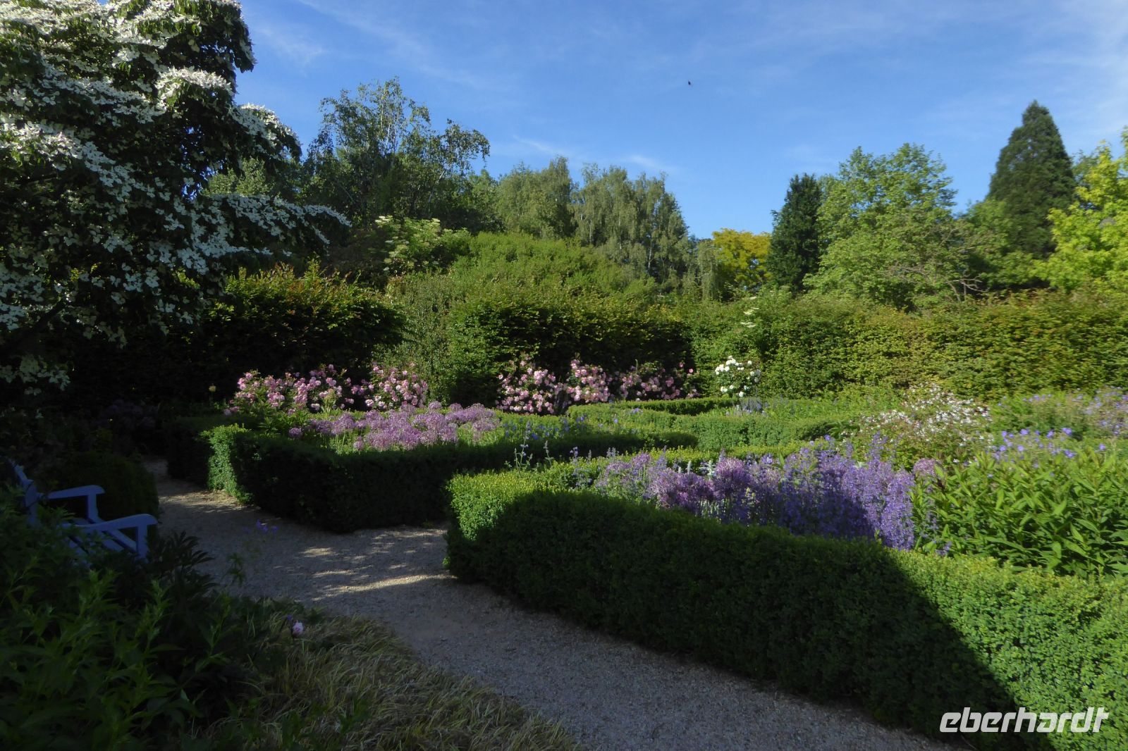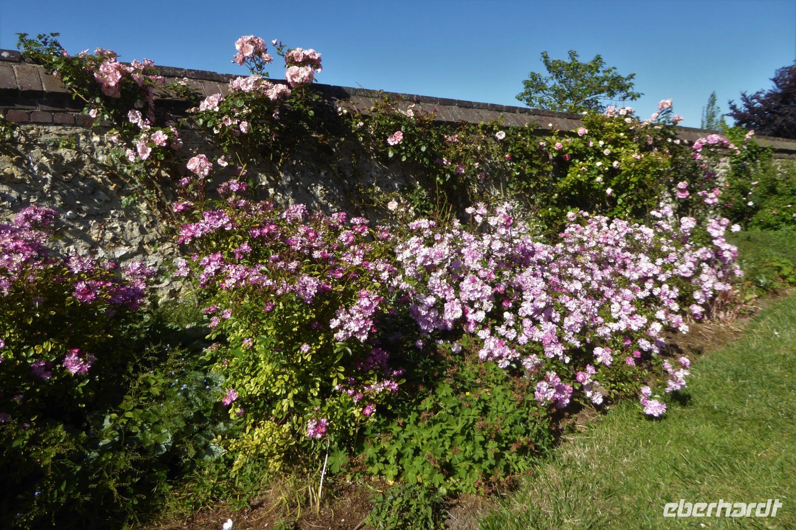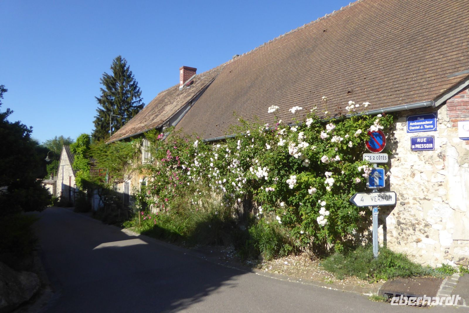 Auf Apfelwiesen weidende Kühe sind ein typisches Bild für das Pays d'Auge, einem Landstrich in der Normandie. Cidre, Calvados und Camembert gehören deshalb ebenso dazu wie die landestypischen Fachwerkhäuser. Über die eigenwillige Streckenführung unseres Fahrers Jens Fritsch gelangten wir auf engen Nebenstraßen nach Cambremer. Auf dem vier Hektar großen gepflegten Gartengelände von Armelle und Jacques Noppe findet man einige alten Gebäude, die Monsieur Noppe vor dem Verfall gerettet und in seinem Garten wieder aufgebaut hat. Liebevoll eingerichtet mit alten Handwerksgeräten erzählen sie heute vom Leben der Menschen früherer Generationen. Der Landschaftsarchitektin Chantal Lejard-Gasson oblag die Planung des Gartens mit seinen verschiedene Themengärten: ein Sonnengarten, ein Mondgarten, der Garten der Düfte, der Engel, des Teufels, ein Purpurgarten und einige mehr. Und immer wieder die üppig blühenden beeindruckend duftenden Rosen! Der Rasen lud zum barfuß laufen ein und jeder Besucher findet hier sein ruhiges Plätzchen.