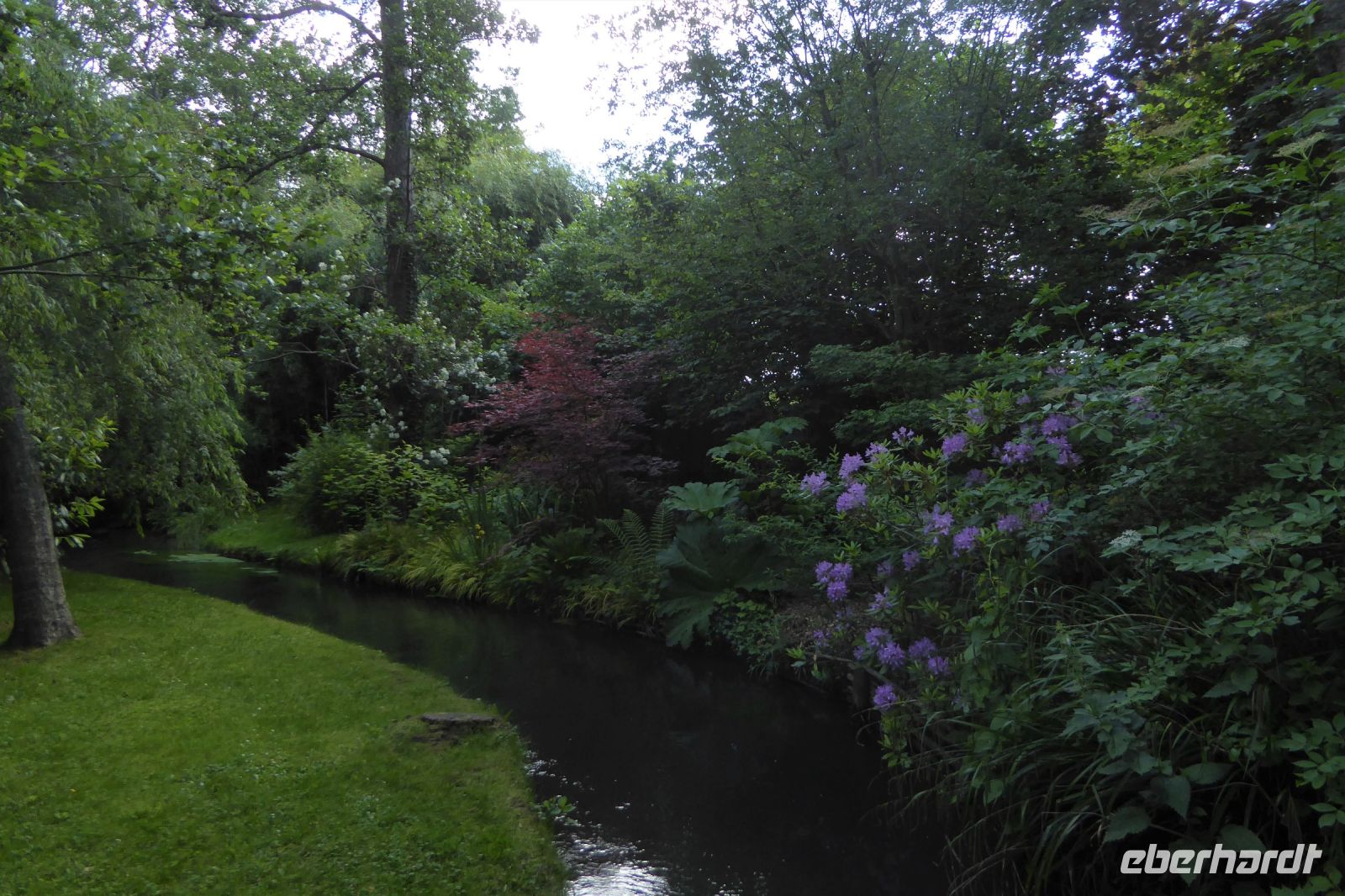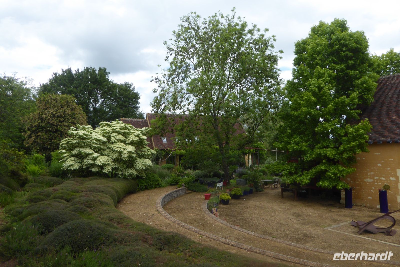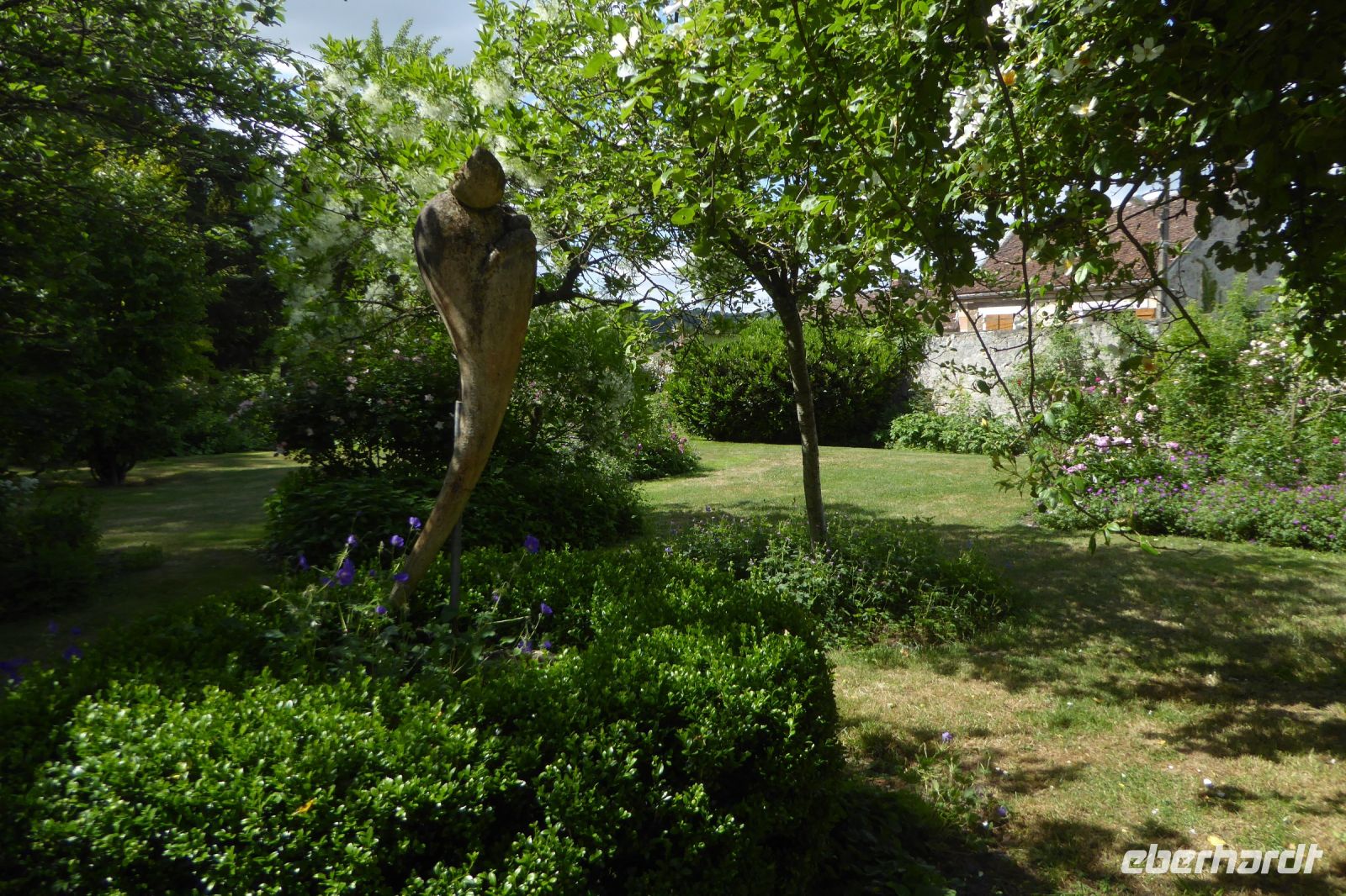 Wir verabschiedeten uns vom Meer und fuhren wieder auf engen kurvigen Nebenstraßen gut 200 Kilometer ostwärts in den Süden der Normandie ins Département Orne. Normannische Hecken- und Weidelandschaft, sanfte Hügel, grüne Wiesen mit Apfelbäumen, Herrenhäuser und edle Pferde prägen diesen Teil der Normandie. Der Garten Francois liegt südöstlich des größten zusammenhängenden Waldgebietes der Normandie, dem Forêt de Bellême im Regionalen Naturpark Perche. Der Garten ist eine kleine friedliche Naturoase mit herrlichen Blumen, blühenden Stauden, duftenden Rosen und aromatischen Kräutern. Wir bewunderten seltene Eschenarten, einen Erdbeerbaum, den Blumenhartriegel und den Sieben-Söhne-des- Himmels- Strauch, Heidekraut in unterschiedlichsten Arten, Azaleen und Rhododendren, die leider von einer die Blüten zerstörenden Krankheit befallen waren. Die Regenschauer der vergangenen Tage hatten dem Rosengarten schwer zugesetzt, tausende Blütenblätter lagen auf dem Boden. Ein plätschernder Bachlauf säumt das Haus und Klavierklänge umschmeicheln das Ohr. Der Patron Francois persönlich führte uns durch sein Paradies und bewirtete uns mit selbstgemachtem Cidre, Apfelsaft und Hefegebäck.