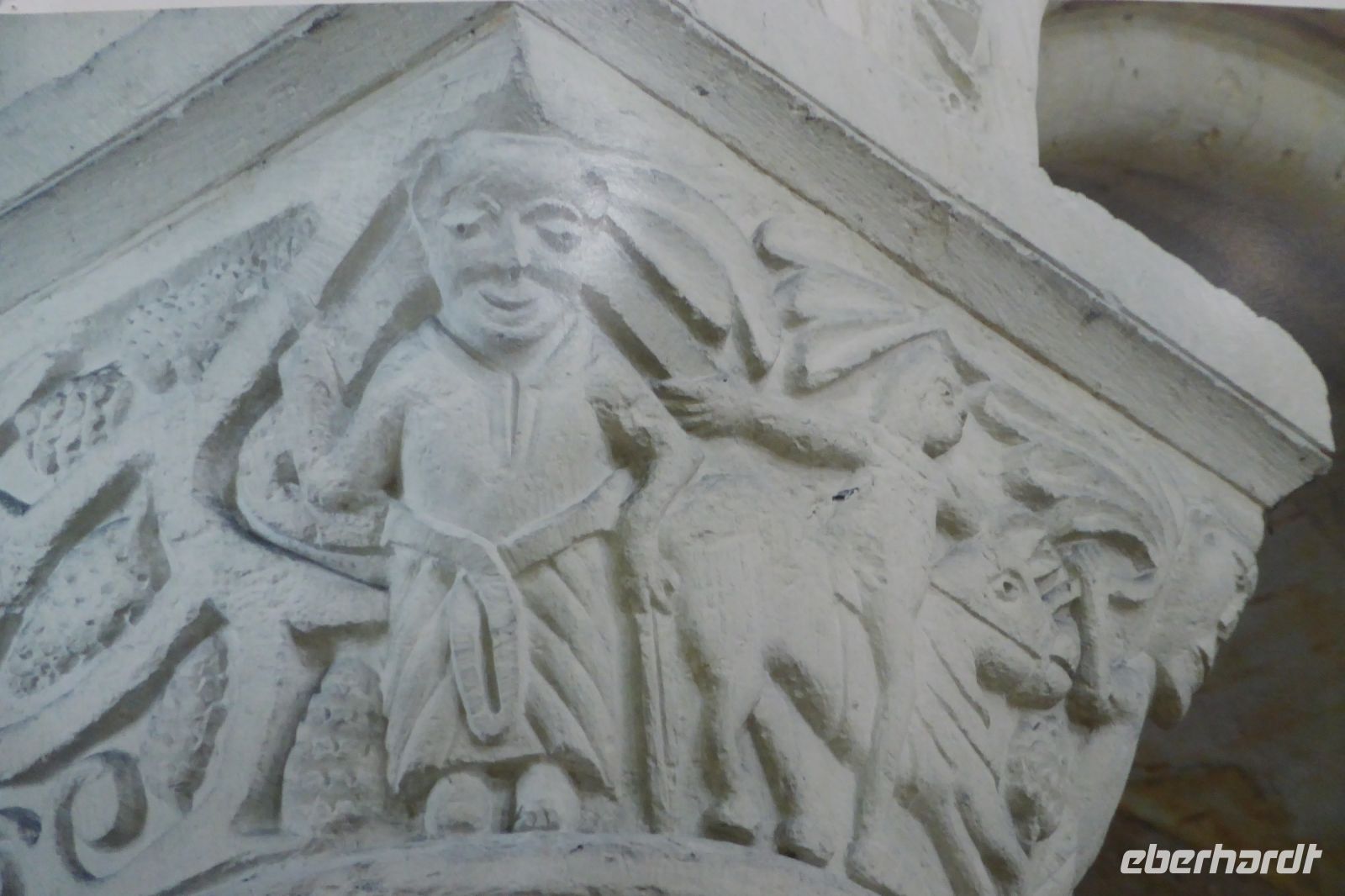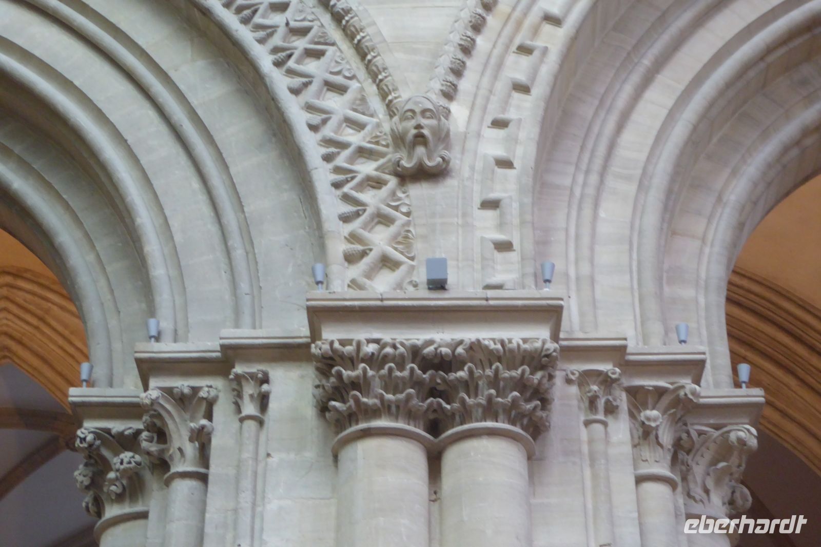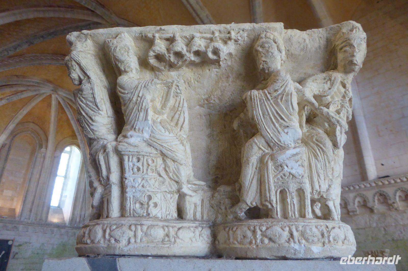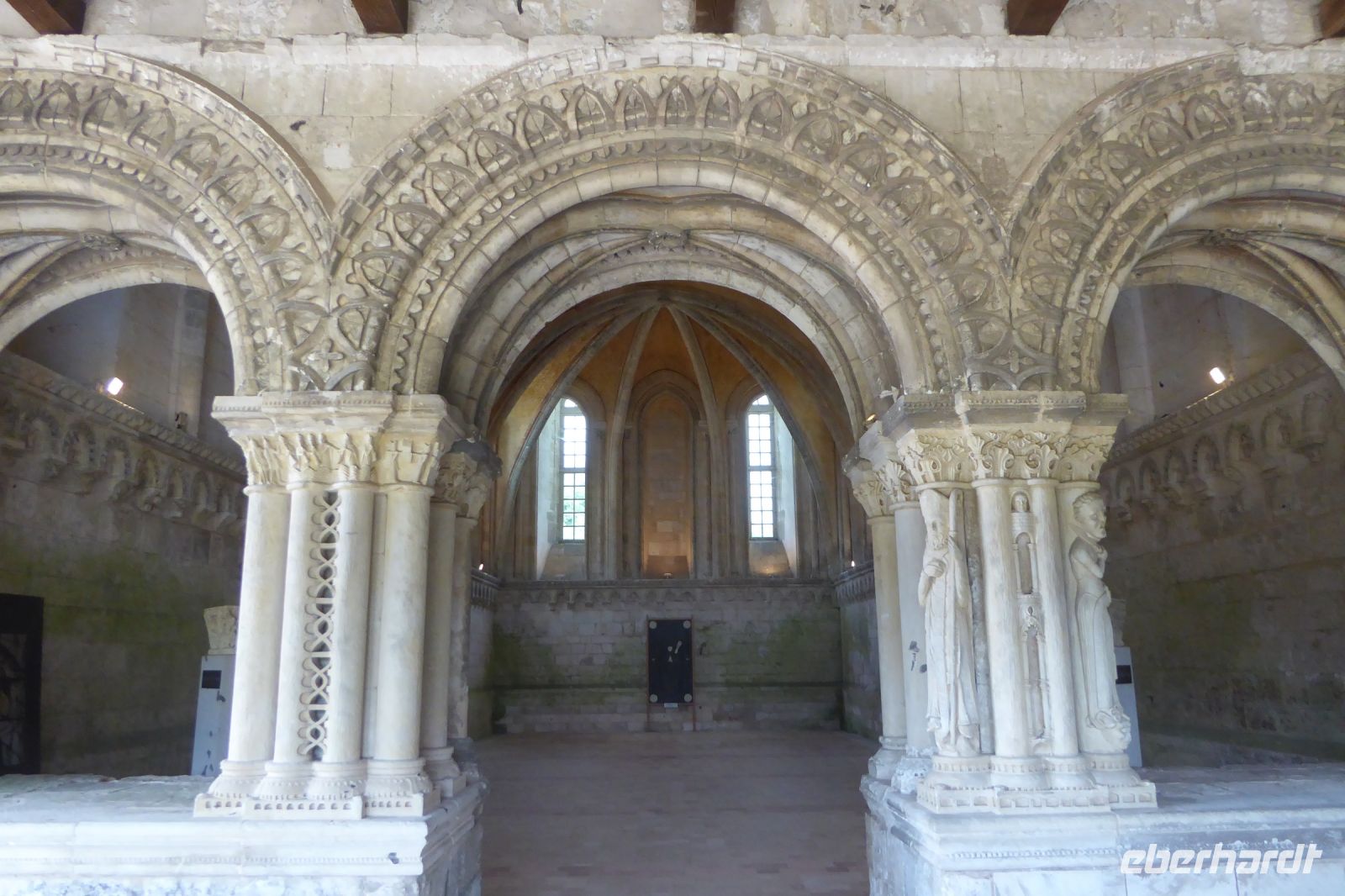Anschließend stand ein Besuch in Saint Martin de Boscherville auf dem Programm. Die Abteikirche Saint-Georges, ist ein gut erhaltenes Beispiel normannischer Romanik, mit zwei zierlichen Westtürmen und einem reich gegliederten und ornamentierten Stufenportal. Der Skulpturenschmuck im Inneren, reich dekorierte Kapitelle sowie die figürlichen Reliefplatten der Querhausemporen, sind durch übereifrige Restaurierungsmaßnahmen leider kaum mehr zu erkennen. Der ehemalige Kapitelsaal aus dem 12./13. Jahrhundert begeisterte uns durch eine außergewöhnlich reich gestaltete dreiteilige Portalzone mit Säulenfiguren und einem bemerkenswerten Rippengewölbe im gut sechs Meter breiten Innenraum.