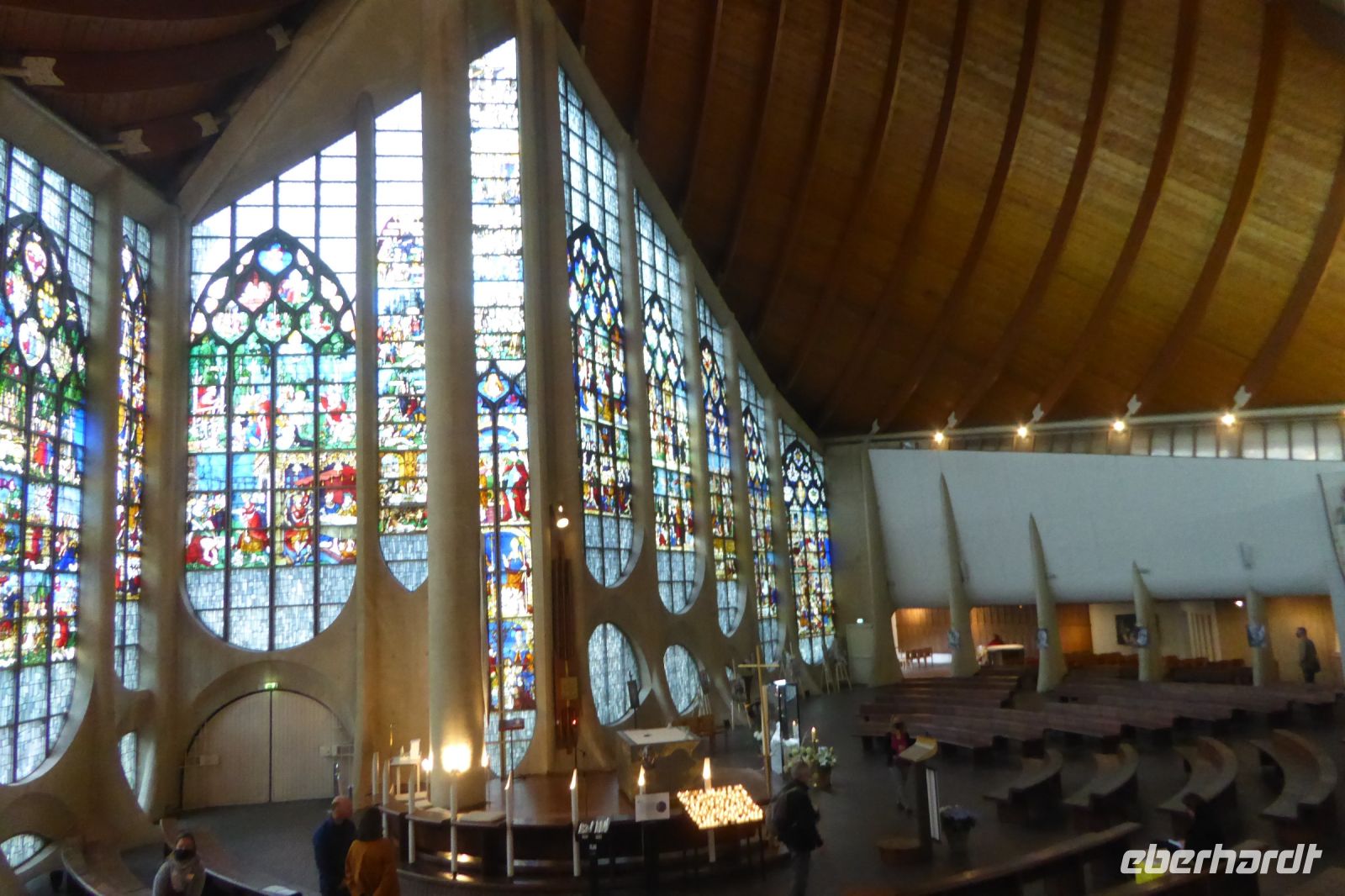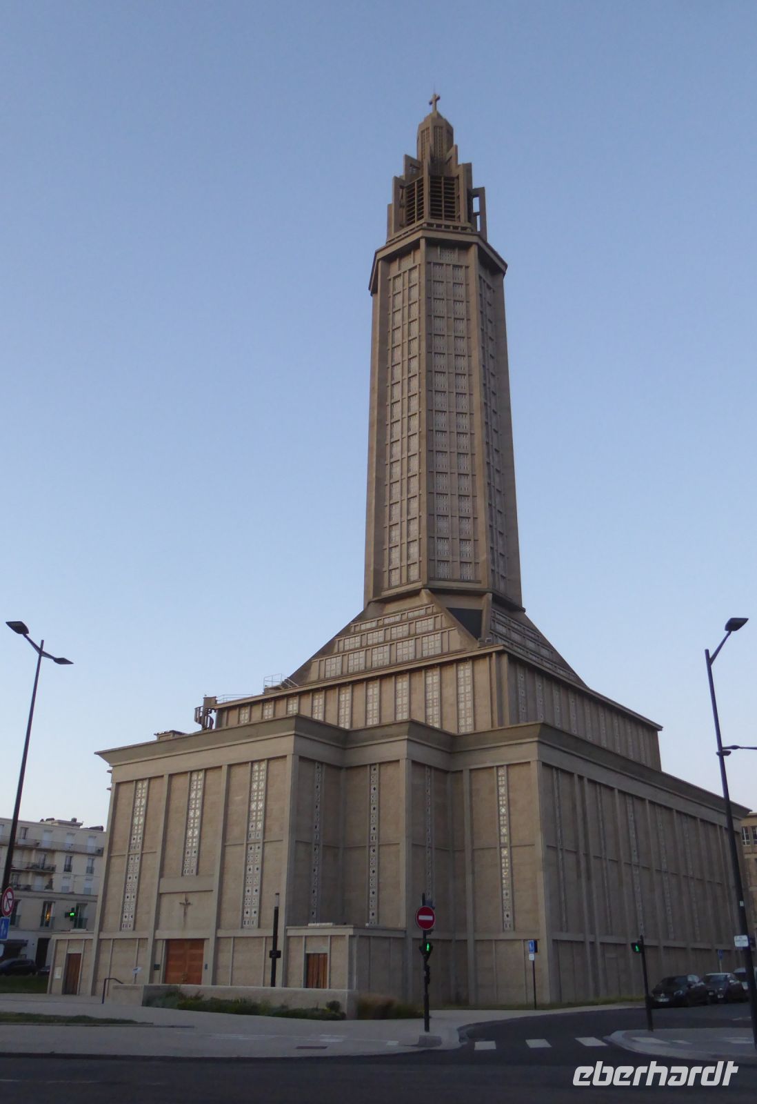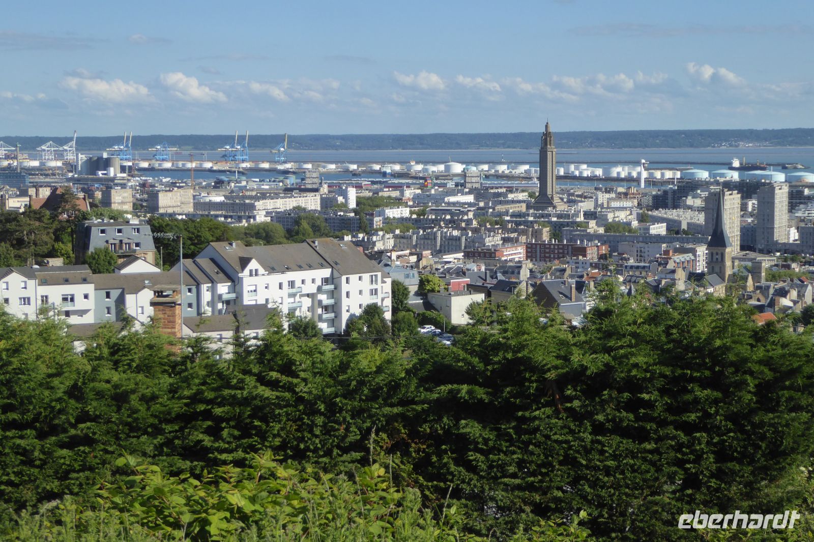 Am späten Nachmittag erreichten wir Le Havre und fuhren zu den hoch über der Stadt gelegenen Jardins suspendus, die sich in einem Fort aus dem 19. Jahrhundert befinden. Auf den vier Eckbastionen sind vor 14 Jahren beeindruckende Themengärten entstanden, das Erbe französischer Seefahrer und früher Botaniker, die aus aller Welt unbekannte Pflanzen nach Frankreich brachten: Douglasien aus Nordamerika, Araucarien aus Chile, Manukabäume aus Australien und immer wieder die längst in der Normandie heimischen Hortensien, die einst aus Japan ihren Weg nach Frankreich fanden. Und wieder überraschte uns ein herrlicher Rosengarten mit seinen bunten wohlriechenden Pflanzen. Eine stattliche rote Grandflorarose ist nach Victor Hugo benannt, daneben steht ein etwas mickriges Exemplar einer Edelrose, die nach dem berühmten französischen Komiker Louis de Funès benannt wurde. Am Abend genossen wir von unserem Hotel aus den Blick über das Hafenbecken und auf das 1972 von Oscar Niemeyer gebaute Kulturzentrum, Le Volcan, und den 102 Meter hohen Kirchturm der Betonkirche St. Joseph. Diese wurde, wie der Großteil der im Zweiten Weltkrieg komplett zerstörten Stadt Le Havre, in den fünfziger Jahren von dem belgischen Architekten August Perret errichtet.