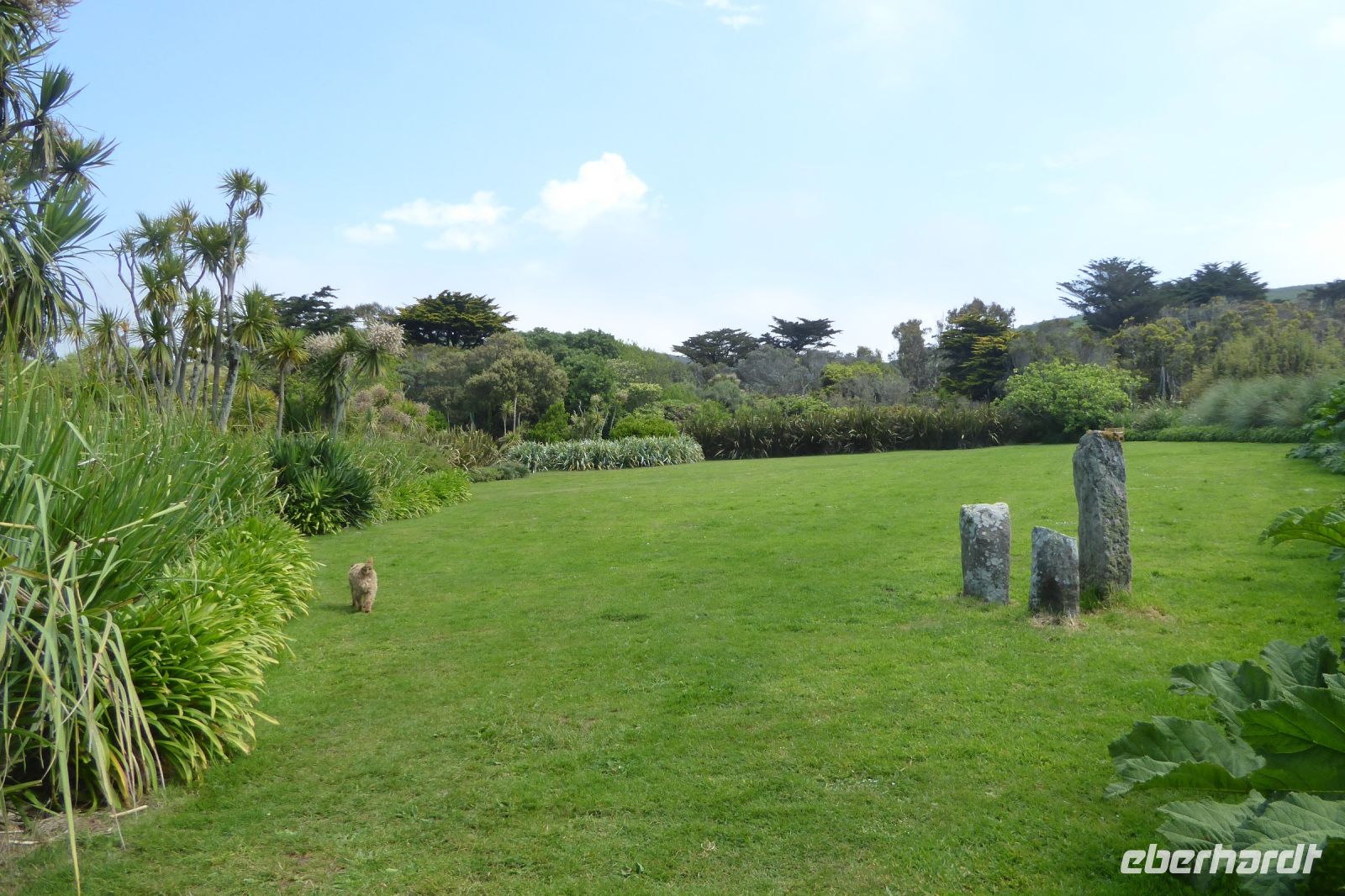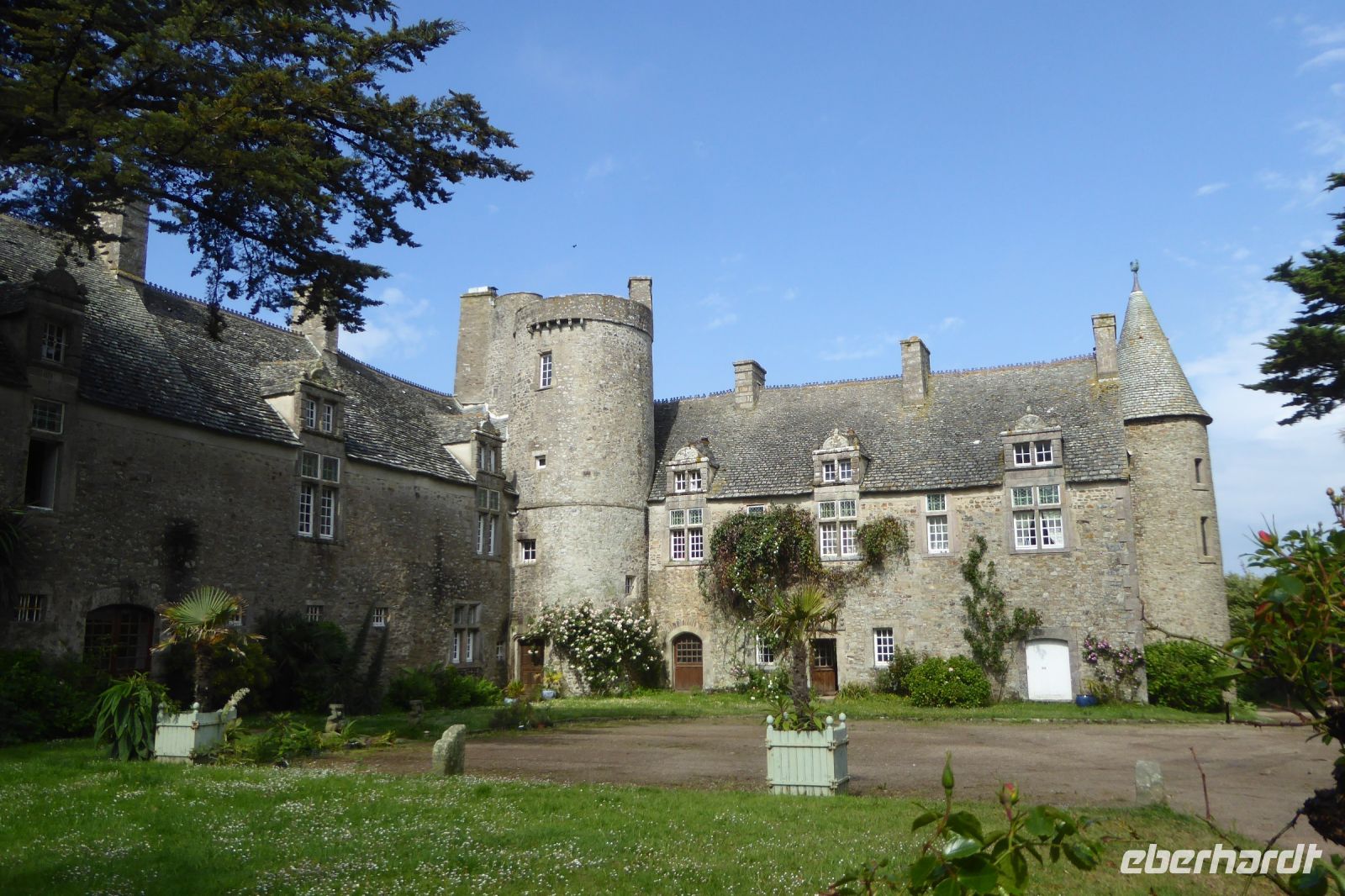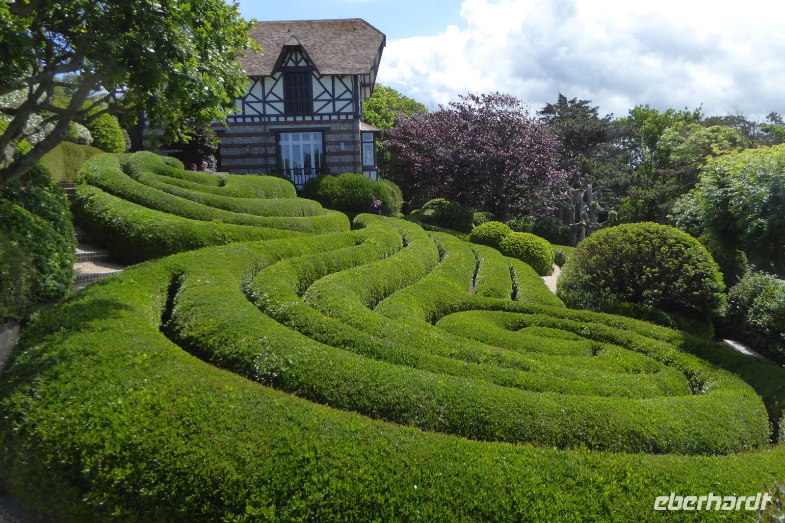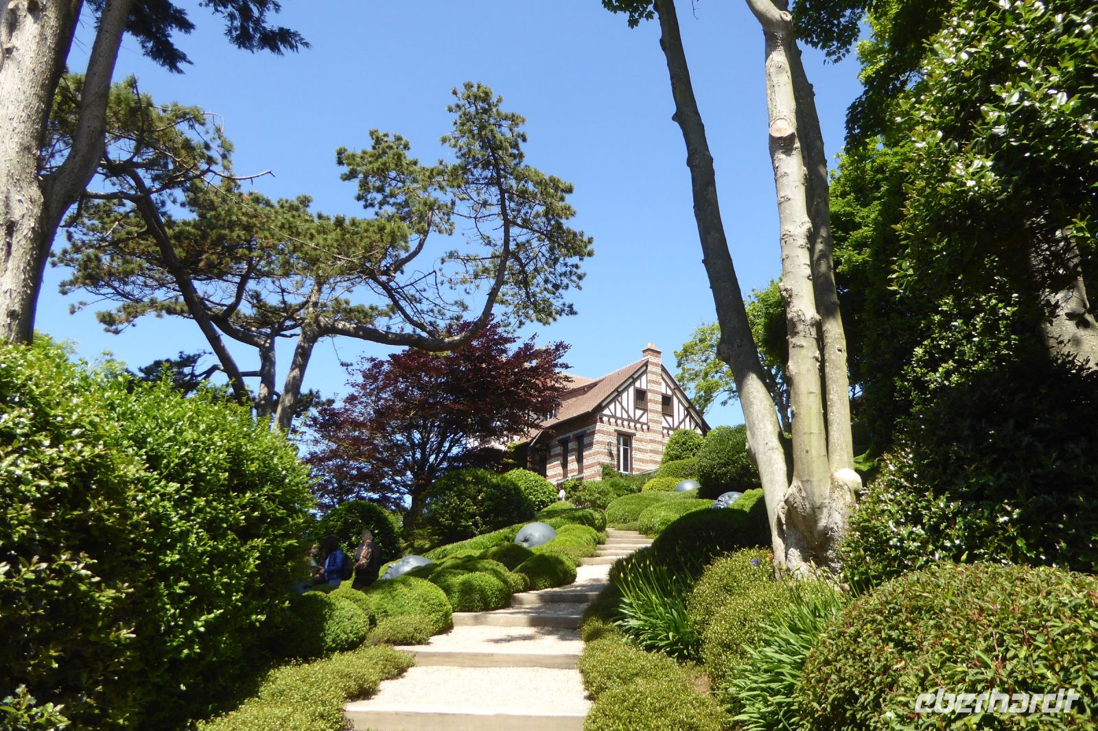 Der nördlichste Palmengarten Frankreichs, direkt am Meer gelegen, profitiert vom milden Klima des Golfstrom, der die Halbinsel Cotentin umspült. Der Park umgibt ein repräsentatives Herrenhausaus dem 17. Jahrhundert und liegt am Rande des pittoresken Dorfes Vauville. Er wurde von Eric und Nicole Pellerin im Jahre 1948 geschaffen. Heute ist er ein außergewöhnlicher botanische Garten von 4 Hektar Größe mit mehr als 900 Pflanzenarten, die hier im Norden Frankreichs eine erstaunliche tropische Stimmung erzeugen. Versiert erläuterte uns Eric Pellerin, der Enkel des Gründers die Vielzahl der Pflanzen und die Besonderheiten der Gartenanlage. Palmen, Eukalyptus, Gingko, Guave, Wollemie, Erdbeer- und Kampferbaum, Rhododendren, leider schon fast verblüht, Azaleen, üppige Gunnera und bunte Blühpflanzen, darunter eine eigene Art Hortensien, die nach seinem Großvater benannt wurde. Der Terrier Odette folgte seinem Herrn auf Schritt und Tritt und begleitet uns auf unserem Streifzug durch den Park, der noch vor 70 Jahren eine einfache Viehweide war.