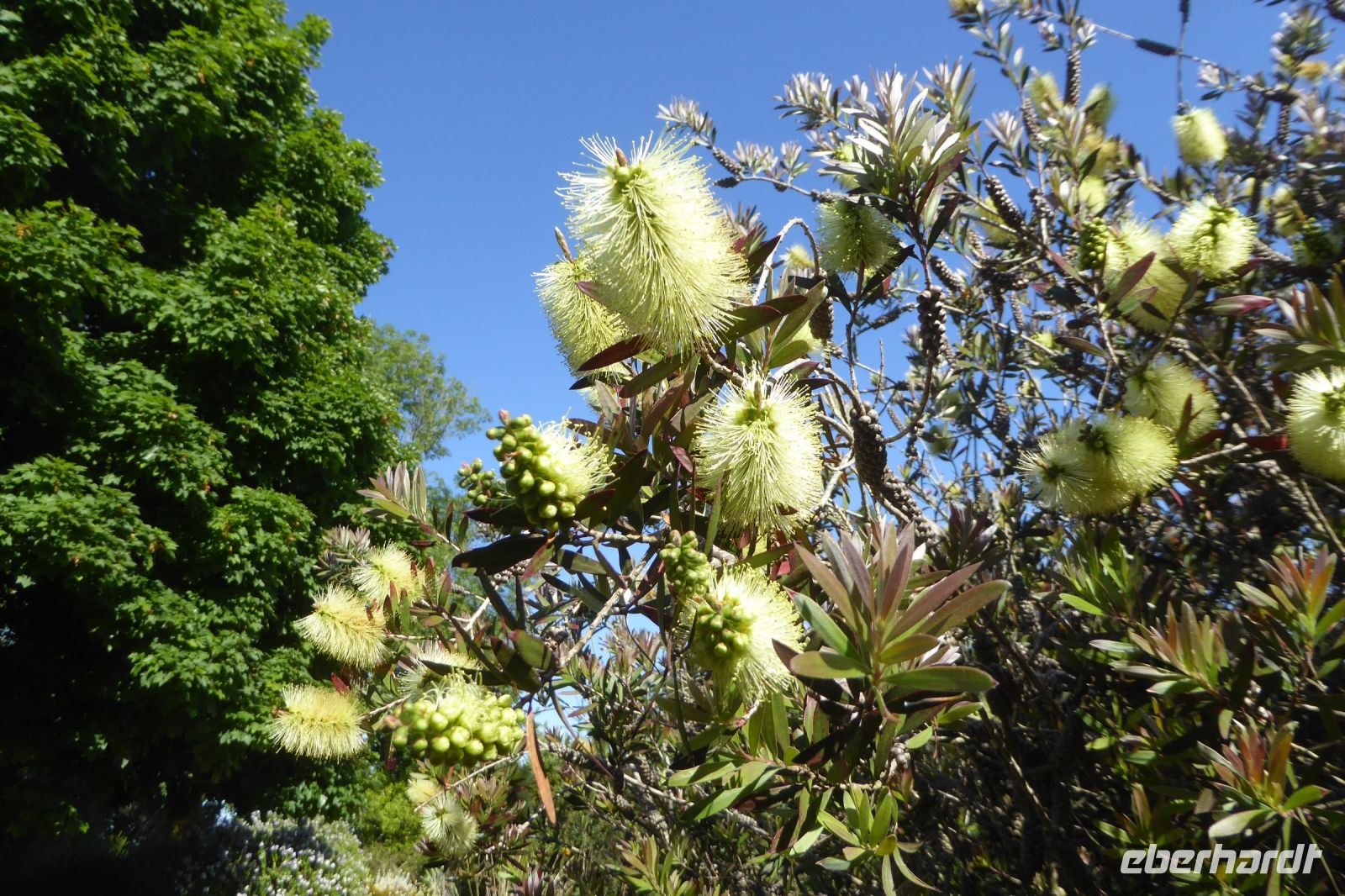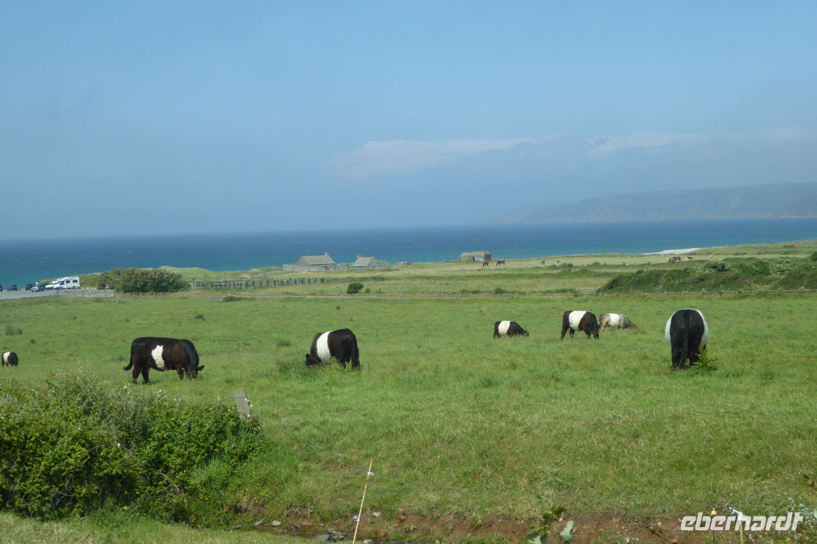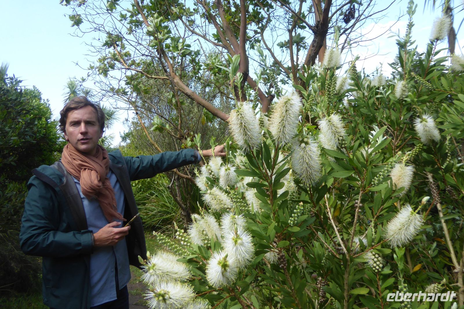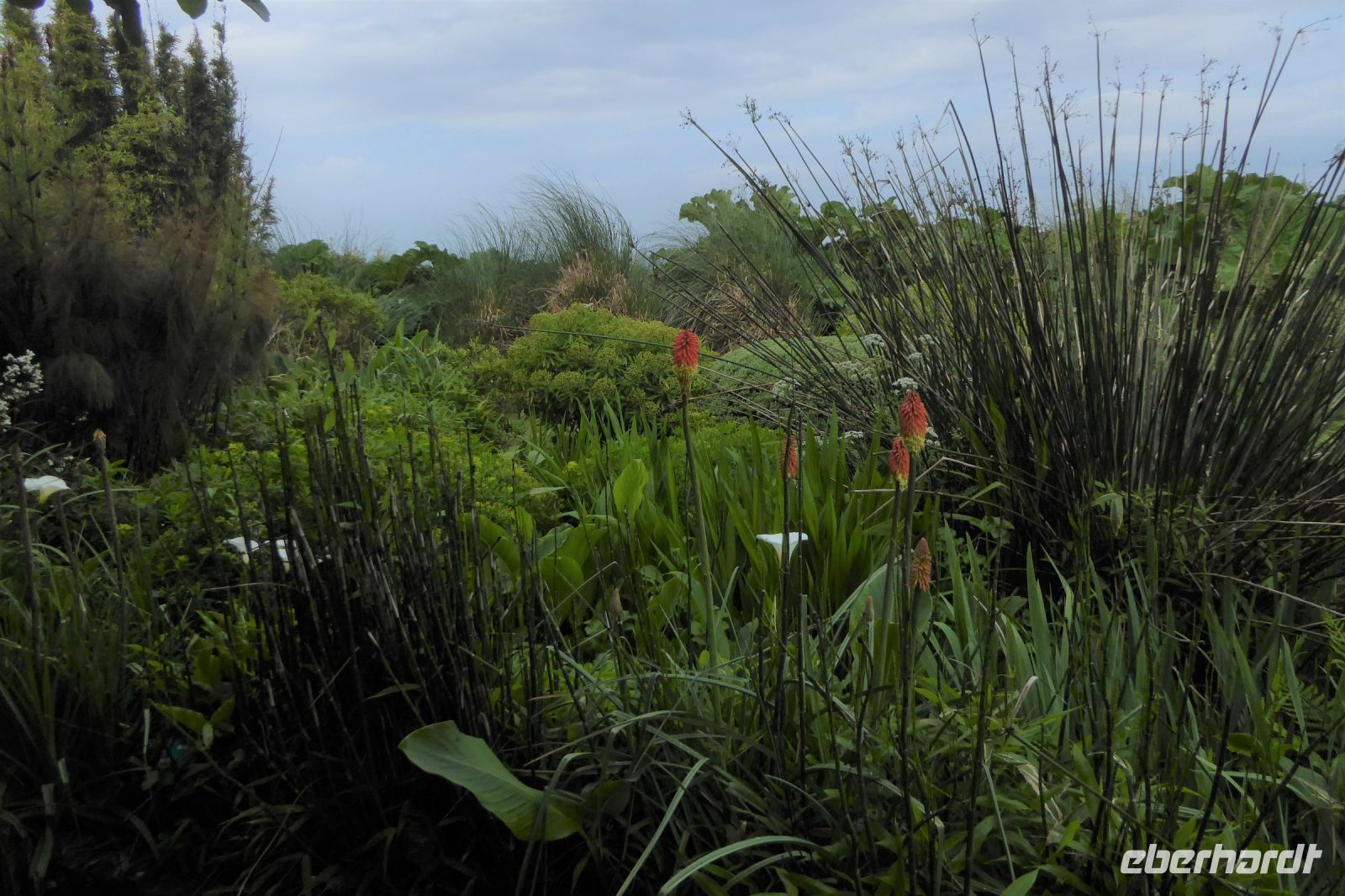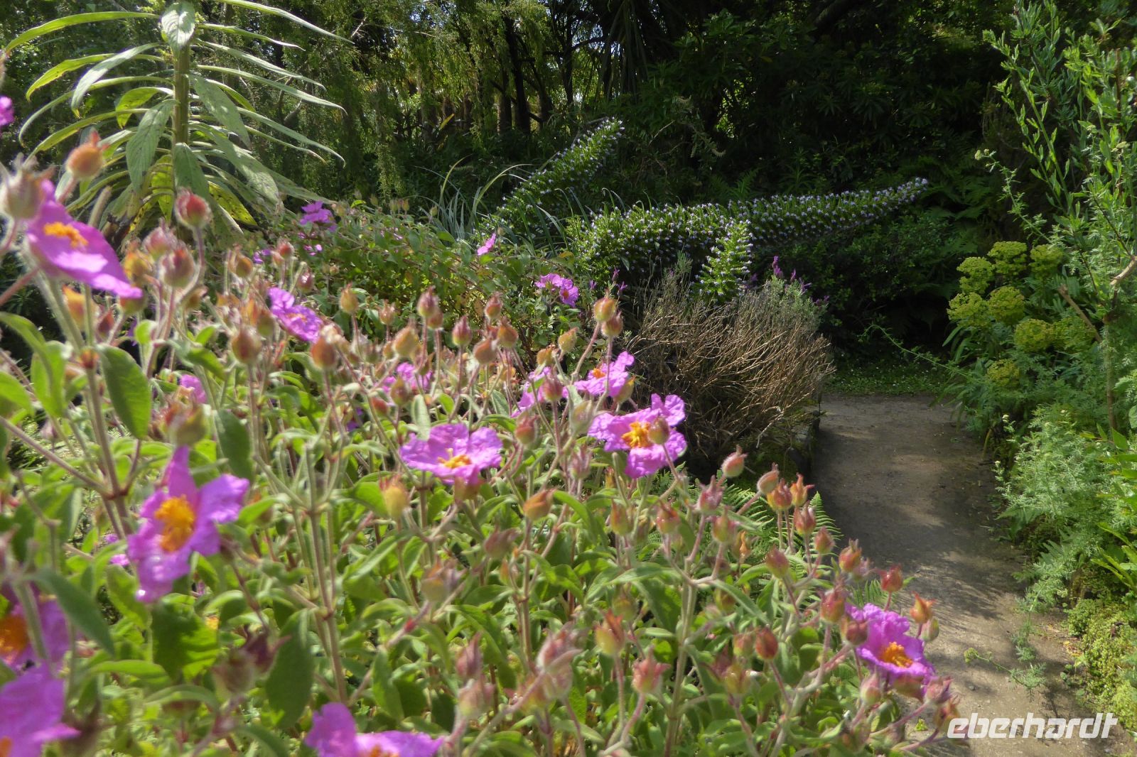 Der nördlichste Palmengarten Frankreichs, direkt am Meer gelegen, profitiert vom milden Klima des Golfstrom, der die Halbinsel Cotentin umspült. Der Park umgibt ein repräsentatives Herrenhausaus dem 17. Jahrhundert und liegt am Rande des pittoresken Dorfes Vauville. Er wurde von Eric und Nicole Pellerin im Jahre 1948 geschaffen. Heute ist er ein außergewöhnlicher botanische Garten von 4 Hektar Größe mit mehr als 900 Pflanzenarten, die hier im Norden Frankreichs eine erstaunliche tropische Stimmung erzeugen. Versiert erläuterte uns Eric Pellerin, der Enkel des Gründers die Vielzahl der Pflanzen und die Besonderheiten der Gartenanlage. Palmen, Eukalyptus, Gingko, Guave, Wollemie, Erdbeer- und Kampferbaum, Rhododendren, leider schon fast verblüht, Azaleen, üppige Gunnera und bunte Blühpflanzen, darunter eine eigene Art Hortensien, die nach seinem Großvater benannt wurde. Der Terrier Odette folgte seinem Herrn auf Schritt und Tritt und begleitet uns auf unserem Streifzug durch den Park, der noch vor 70 Jahren eine einfache Viehweide war.