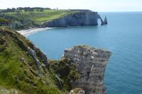 Ein Höhepunkt der Reise erwartete uns im Anschluss: Étretat mit seinen drei markanten Felsbögen an der Alabasterküste: Porte d'Amont, Porte d'Aval und Manneporte. Ihre Entstehung verdanken die Klippen nicht der Meeresbrandung, sondern einem Fluss, der parallel zur heutigen Küstenlinie verlief. Die Felsnadel Aiguille besteht aus etwas härterem Kalkstein, der der Erosion bis heute widerstanden hat.