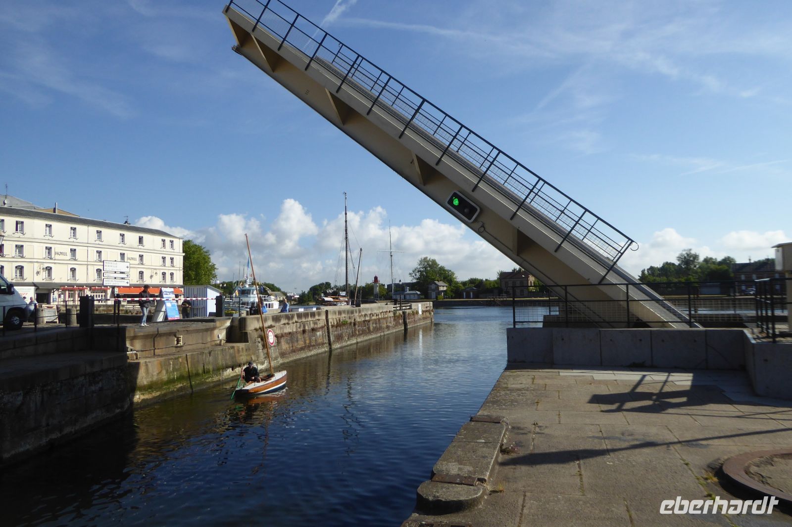 Die beiden Schwesterstädtchen präsentieren sich dagegen mondän und großzügig. 1911 wurde direkt am Meer das Casino errichtet und mit dem Bau von Hotels wurde die Entwicklung zum Luxusbadeort vorangetrieben. In den Folgejahren waren namhafte Künstler aller Sparten, Politiker und Geschäftsleute regelmäßig zu Gast: Josephine Baker, Maurice Chevalier, Sacha Guitry, Tristan Bernerd, Gustave Flaubert, André Citroën und Coco Chanel, Eugène Boudin, Raoul Dufy, Camille Saint-Saëns, Yves Saint Laurent und Arthur Rubinstein. Die 643 Meter lange Promenade von Deauville wurde zum Laufsteg der Eitelkeiten und prickelnder Champagner floss in Strömen. Unser Weg führte uns zuerst über eine von hohen Türmen begrenzte Brücke nach Trouville, wo ein bunter Flohmarkt entlang des Hafenbeckens lockte. Leider wurde uns der Rückweg abgeschnitten, die Brücke wurde für durchfahrende Schiffe nach oben geklappt. So schlenderten wir durch den Ortskern von Deauville gemächlich wieder zurück zum Bus.