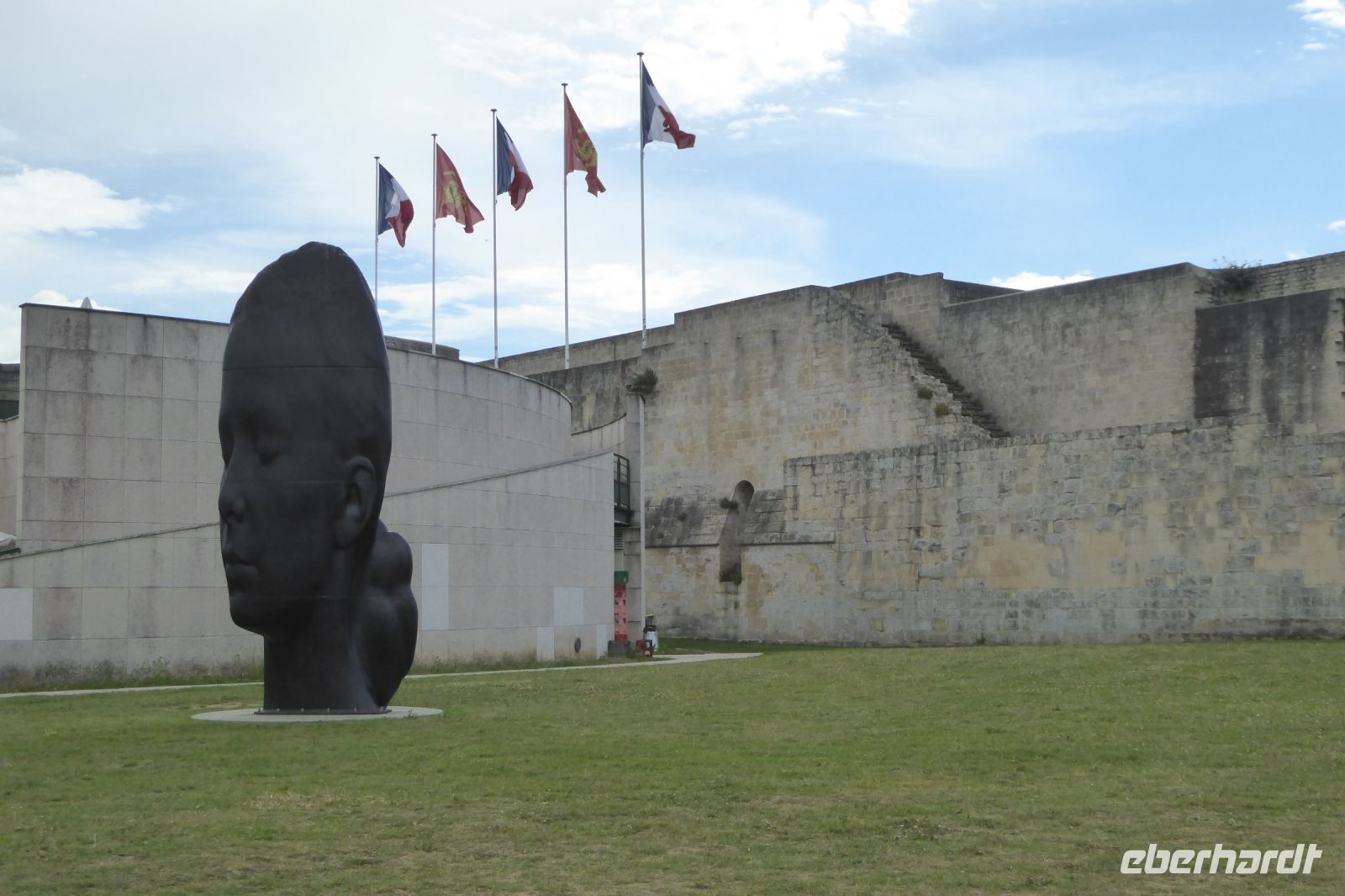 Gleich nach dem Frühstück machten wir uns auf zu einem Spaziergang durch die Stadt, zur Abbay aux Hommes in Caen. In der Abtei befindet sich das Grabmal des 1087 verstorbenen Stifters der Abtei: William der Eroberer. William ließ zwei Klöster, St. Étienne, die Abbaye aux Hommes und Sainte Trinité, die Abbaye aux Dames im elften Jahrhundert errichten, um, wegen seiner von Papst Leo IX missbilligten Heirat mit seiner Cousine Mathilde von Flandern, Abbitte zu leisten. In der Abteikirche St. Étienne fand er seine letzte Ruhestätte, bis Aufständische das Grab mehrfach plünderten, zuletzt in der französischen Revolution. Heute erinnert hier lediglich eine bescheidene Grabplatte im Chor an den großen normannischen Herrscher. Vorbei an St. Pierre erreichten wir die gewaltige Burganlage von Caen, die bereits 1060 vom Herzog der Normandie errichtet wurde Unter dessen Schutz und Herrschaft erlangte die Region eine wirtschaftliche Blütezeit. Die mächtige Wehranlage thront über der Stadt, die im zweiten Weltkrieg fast völlig zerstört wurde. Im Innenhof der Burg stehen eindrucksvolle Skulpturen von Rodin und Bourdelle sowie moderne Plastiken internationaler zeitgenössischer Künstler. Bevor unser Nachmittagsprogramm startete, nutzten wir die Gunst der Stunde und trafen uns auf den Festungsmauern zu einem Umtrunk.