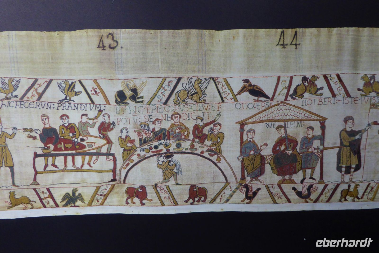 Am nächsten Morgen stand Bayeux auf unserem Programm: Der Wandteppich von Bayeux ist eine Wollstickerei auf Leinen aus der zweiten Hälfte des 11. Jahrhunderts. Auf fast 70 Metern Länge und 50 Zentimetern Höhe zeigt der Wandteppich in 58 Einzelszenen die Eroberung Englands 1066 durch Wilhelm den Eroberer, Herzog der Normandie. Dieses mittelalterliche Meisterwerk wurde vermutlich von seinem Halbbruder, dem Bischof Odo von Bayeux, in Auftrag gegeben, um die neue Kathedrale von Bayeux zu schmücken, die 1077 eingeweiht wurde. Da wir die erste Besuchergruppe dieses Tages waren, hatten wir, ausgerüstet mit Audioguides, das im Halbdunkel präsentierte Kunstwerk mittelalterlicher Handwerkskunst fast für uns alleine und konnten der detailreichen Beschreibung des Geschehens vor fast 1000 Jahren in Ruhe folgen. Lug, Betrug, Verrat, Mord und Totschlag: Eine Chronik der Ereignisse am Beginn des zweiten Jahrtausends.