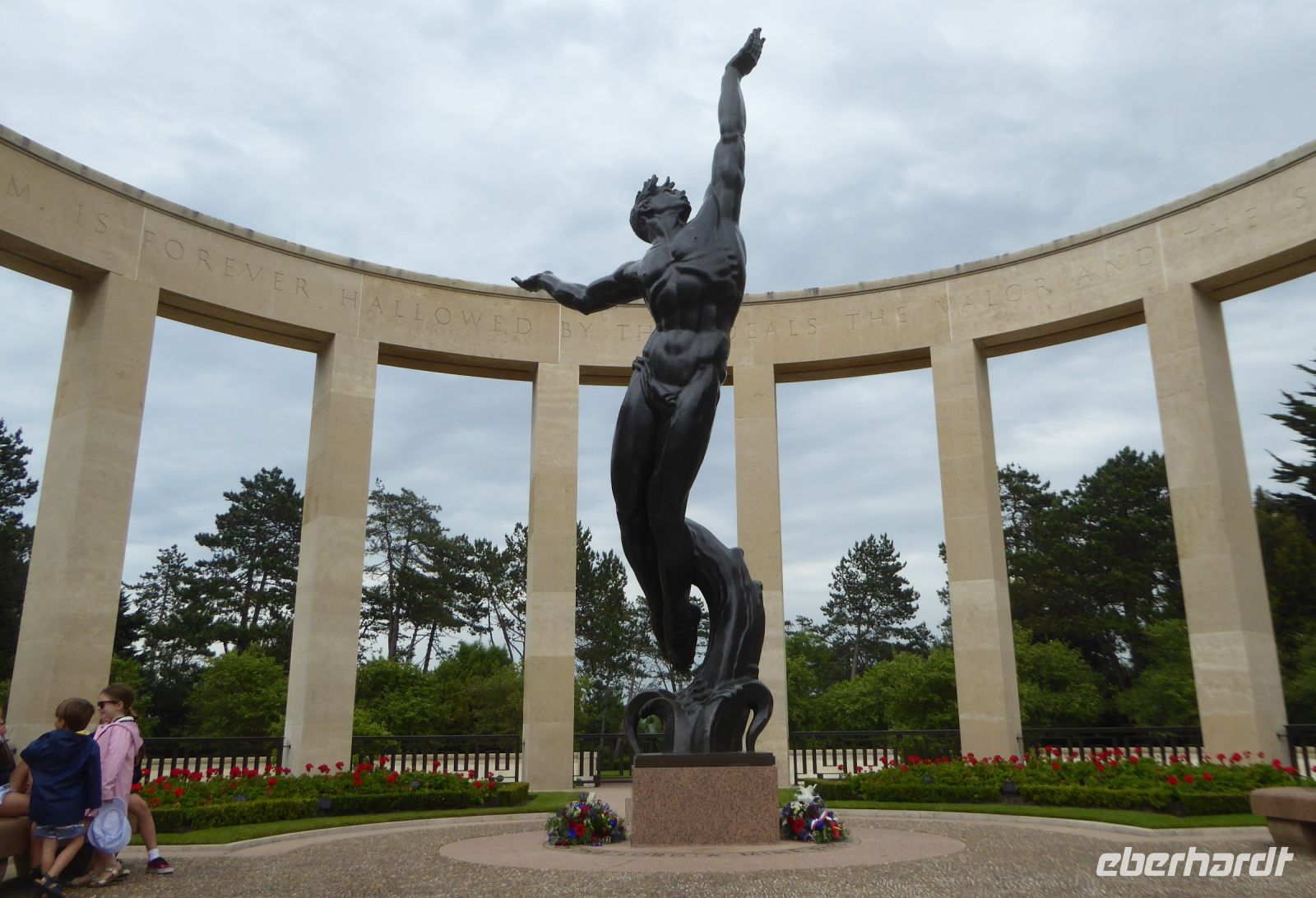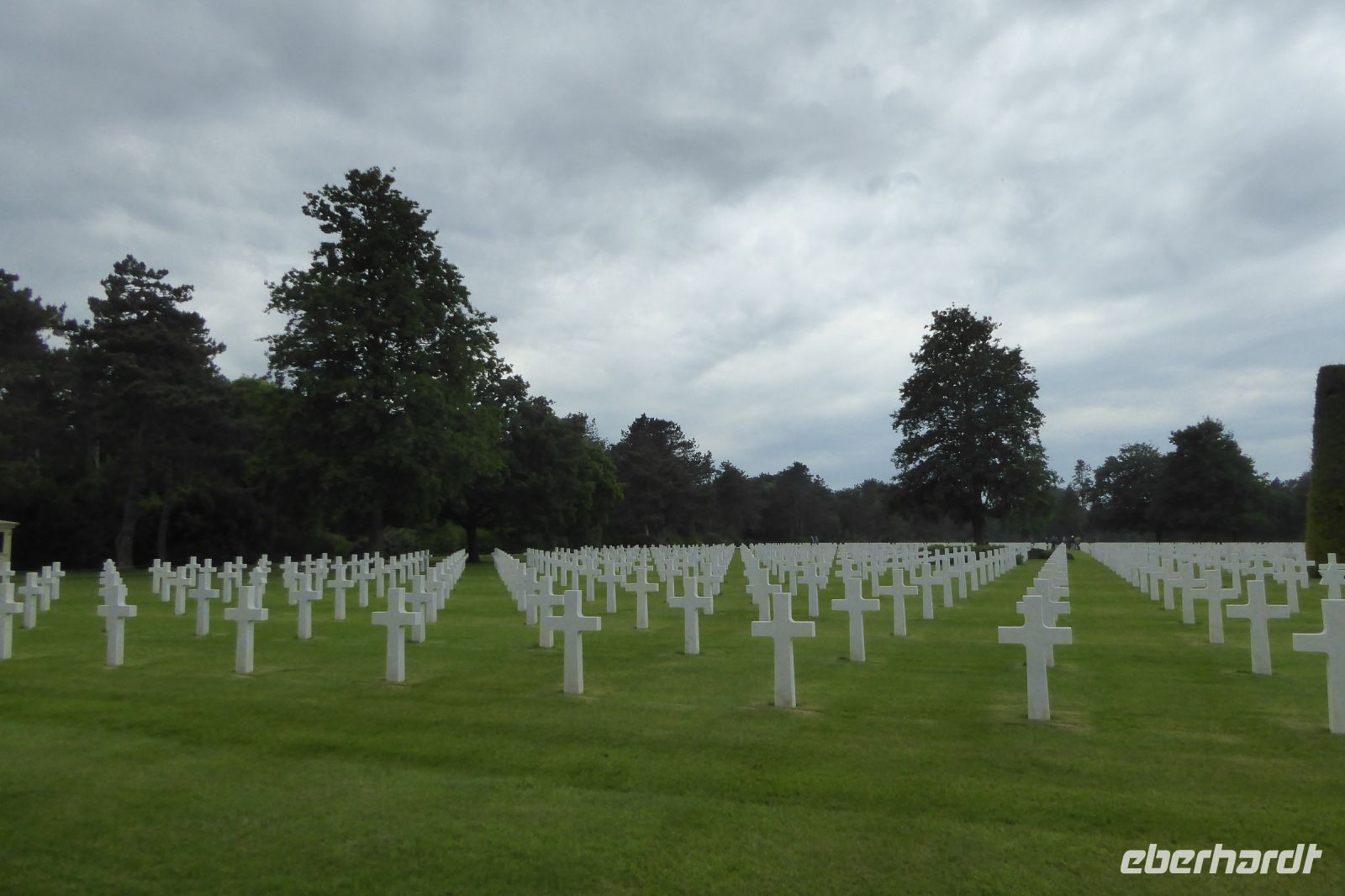 Der amerikanische Soldatenfriedhof in Colleville-sur-Mer ist der international berühmteste an den Krieg erinnernde Friedhof in der Normandie. Lange Reihen weißer marmorner Kreuze und Davidsterne symbolisieren die Opfer der Vereinigten Staaten von Amerika, die für die Freiheit gebracht wurden. Der Friedhof befindet sich an einer Stelle, von der man einen eindrucksvollen Blick über den Küstenabschnitt Omaha Beach hat, wo die Amerikaner ihre größten Verluste zu beklagen hatten. Viele Elemente verbinden sich zu einem bleibenden Eindruck: Die halbkreisförmige Säulenreihe, die kunstvolle Statue, das große Becken mit klarem Wasser, und der makellose Park, der die Gräber von 9.387 amerikanischen Soldaten umgibt, die am D-Day und bei den folgenden Gefechten der Schlacht um die Normandie ihr Leben ließen. Der Friedhof war an diesem Tag sehr gut besucht und es wurden überall für die anstehenden Feierlichkeiten des Jahrestages der Landung der Alliierten am 6. Juni 1944 die letzten Vorbereitungen getroffen.