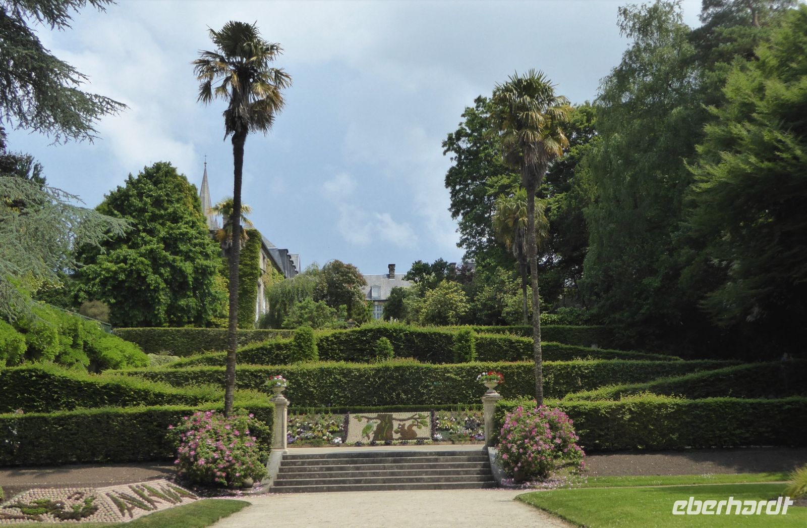 Unsere nächste Station war das kleine knapp 100 Kilometer entfernte Städtchen Coutance. Da unser Fahrer ein ausgeprägtes Faible hatte für enge Nebenstraßen und für Ortsdurchfahrten, die für Fahrzeuge über fünf Tonnen gesperrt waren, überließen wir ihn dieses Mal seinem selbst gewählten Schicksal und verließen in einer engen Gasse im Kern der Altstadt den Bus, um zu Fuß zum Jardin des Plantes zu gehen. Der Garten wurde zu Recht im Jahre 1992 in die Liste der nationalen Denkmäler Frankreichs aufgenommen. Er ist einer der schönsten Gärten der Basse-Normandie. Jean-Jacques Quesnel de la Moriniere, der das Anwesen 1823 erwarb, vererbte den Besitz der Stadt Coutances mit der Auflage, dort ein Museum und einen botanischen Garten zum Wohle des Volkes einzurichten. Mit dem Entwurf wurde der pensionierte Pionier-Offizier und Aquarellmaler Adéle Sebastian Minel beauftragt. Es entstanden italienische Terrassen, Baumgruppen seltener Bäume im englischen Stil, ein Labyrinth und Wasserspiele und kunstvolle Blumenmosaike. Der Park wurde im Jahre 1855 als einer der ersten seiner Art fertiggestellt und wurde zum Vorbild öffentlicher Gärten in der Normandie des Zweiten Kaiserreiches im 19. Jahrhundert.