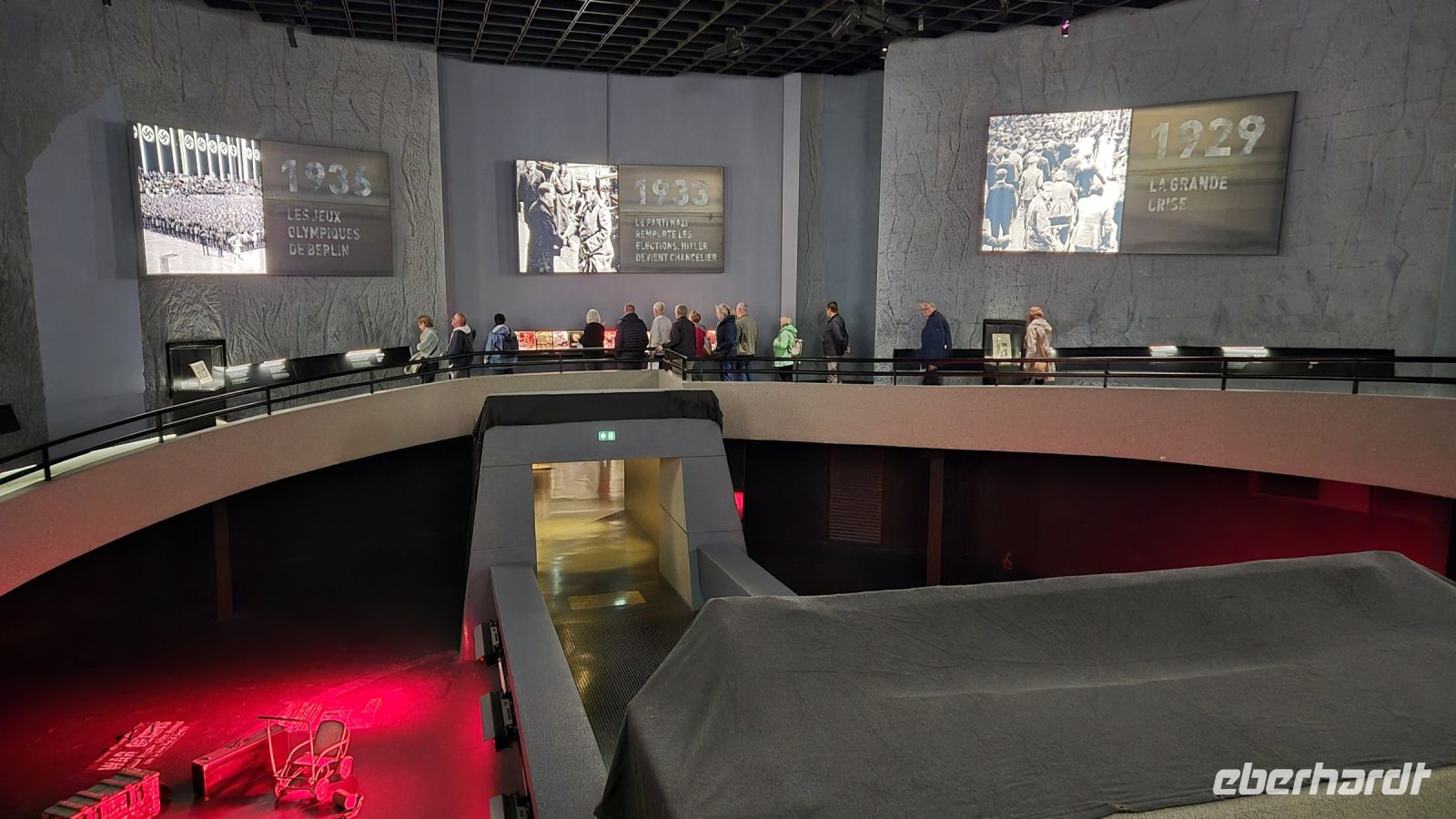 Wir haben nun Zeit, die Stadt ein wenig auf eigene Faust zu erkunden und etwas zu Mittag zu essen bevor wir am frühen Nachmittag mit dem Bus aus dem Zentrum hinaus fahren, um das Mémorial de Caen zu besuchen. Es befindet sich in einem streng kubistischen Bauwerk, 1988 eröffnet, das auf einer weiten Freifläche steht. Eine architektonisch wirkungsvolle Freitreppe führt in das Gebäude, dessen Standort nicht zufällig gewählt wurde: hier war 1944 das regionale Hauptquartier der deutschen Besatzungstruppen. In dem unterirdischen Bunker war die Kommandozentrale der 716. Infanteriedivision untergebracht. Auch ein Exemplar des legendären deutschen Enigma-Kodiergerätes findet sich in der Ausstellung. Rund um das Mémorial de Caen erstreckt sich eine große Parkanlage, der Parc international pour la Libération de l'Europe. Die Gedenkstätte von Caen - das Zentrum der Geschichte für den Frieden - hat den hohen Anspruch, den Besuchern die für das Verständnis des Zweiten Weltkriegs wesentlichen Informationen zu geben, angefangen von den Ursachen, die in den Ergebnissen des Ersten Weltkriegs liegen, bis hin zu den Auswirkungen auf die Ereignisse im Jahr 1989. Jeder Besucher ist aufgefordert, sich selbst über den so schnell verblassenden Geschichtsabschnitt, der das Antlitz Europas und der Welt verändert hat, auseinanderzusetzen.