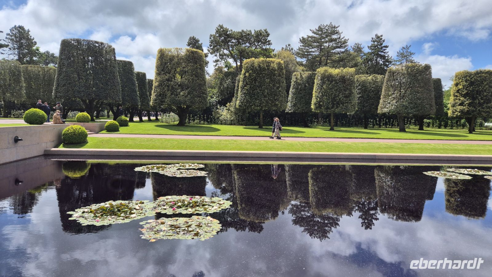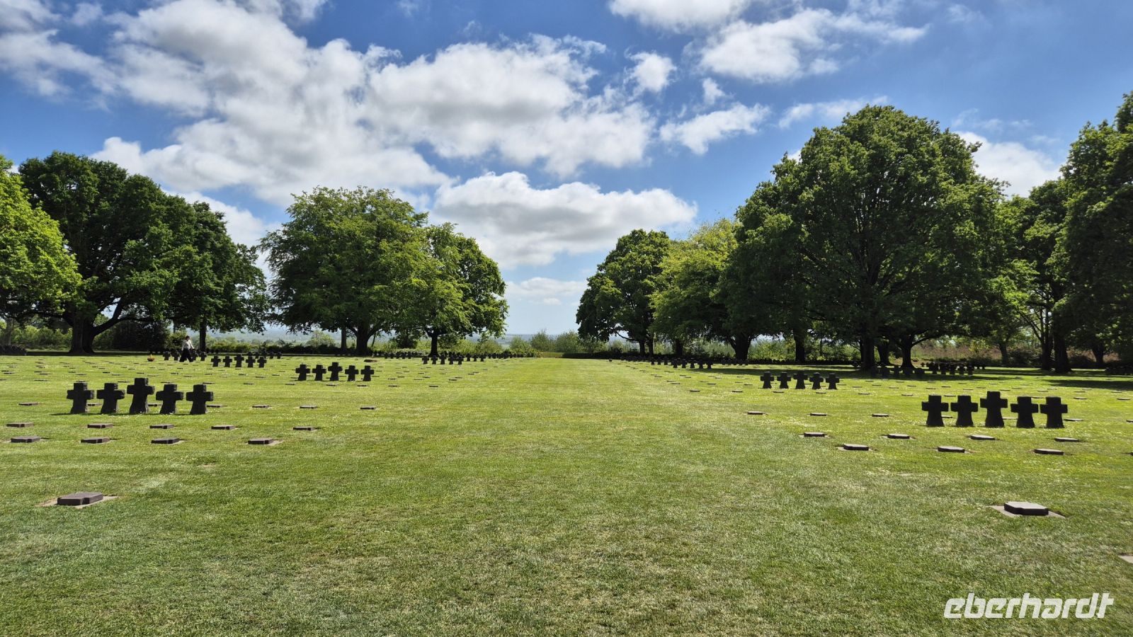 Als Kontrast dazu sehen wir uns auch noch die deutsche Kriegsgräberstätte in La Cambe an. Denn auch auf deutscher Seite sind zu viele, zu großem Teil viel zu junge Männer gefallen ohne eine Wahl zu haben. Weniger glanzvoll aber dennoch sehr pietätvoll wird in La Cambe 21.245 deutschen Kriegsgefallenen gedacht. In der Mitte der Anlage befindet sich ein aufgeschütteter Tumulus auf dem ein schwarzes Basaltkreuz thront. Die schwarzen Kreuze finden sich überall auf der weitläufigen Rasenfläche zwischen den kleinen Grabplatten wieder.