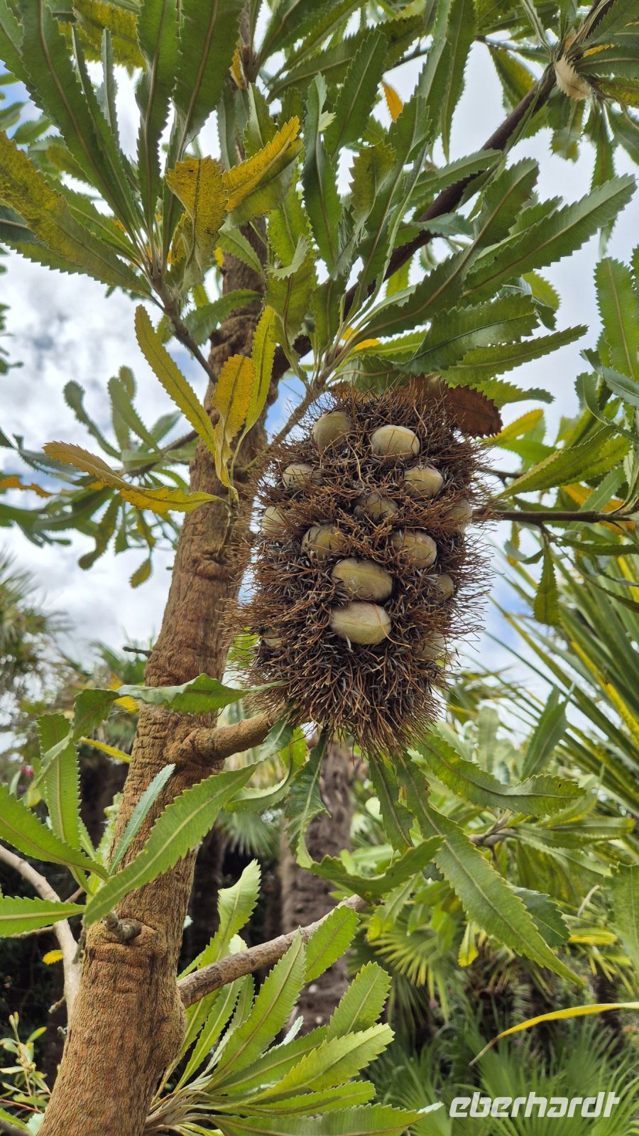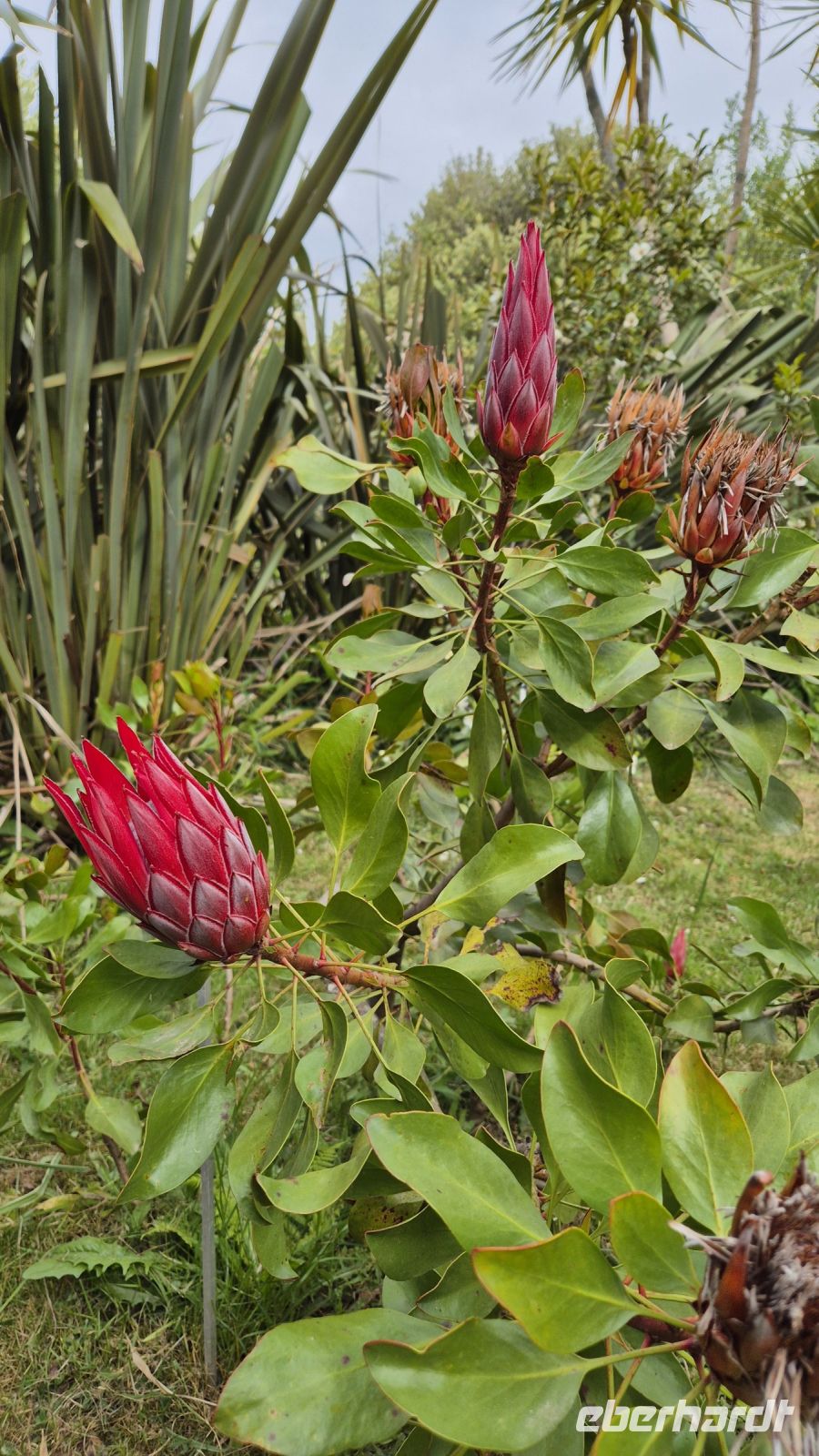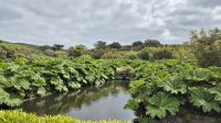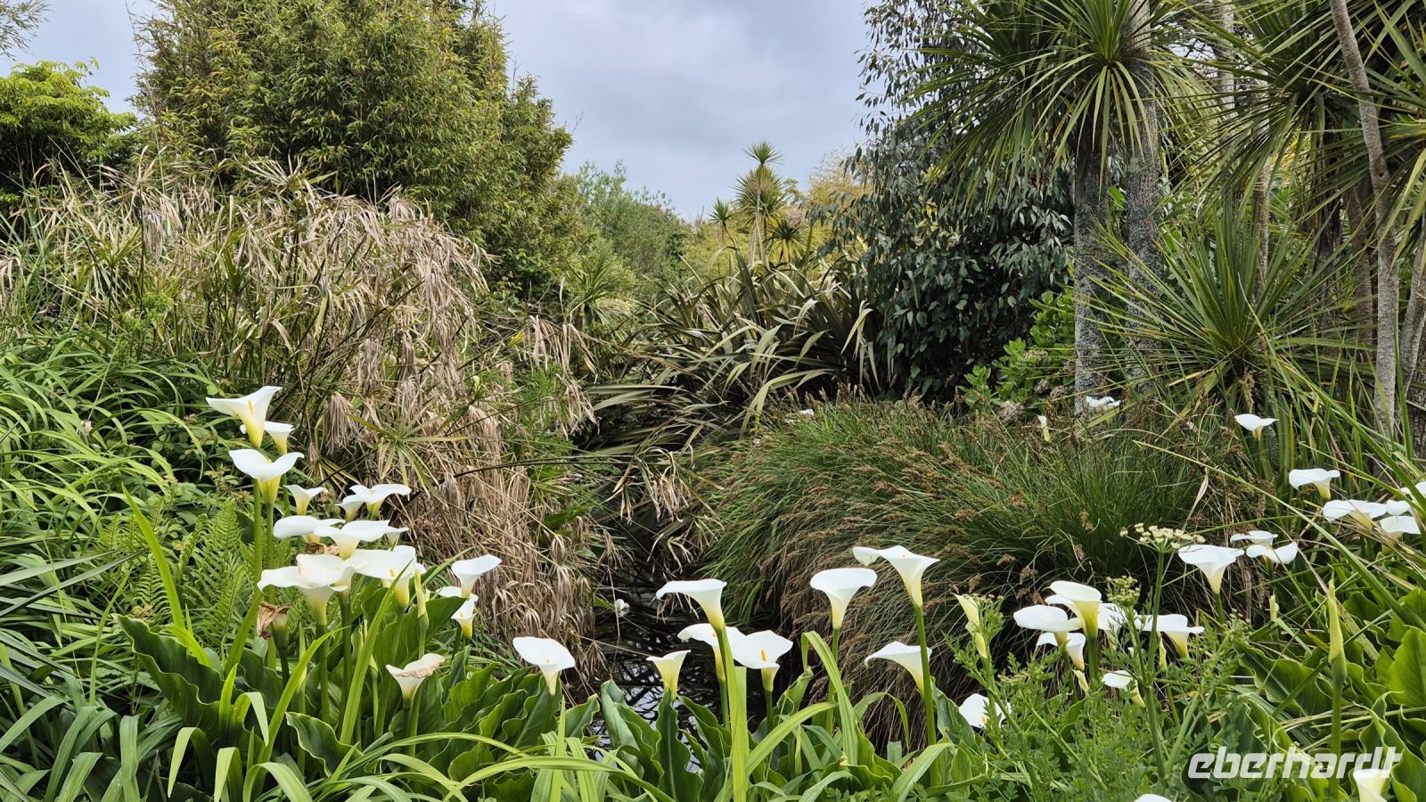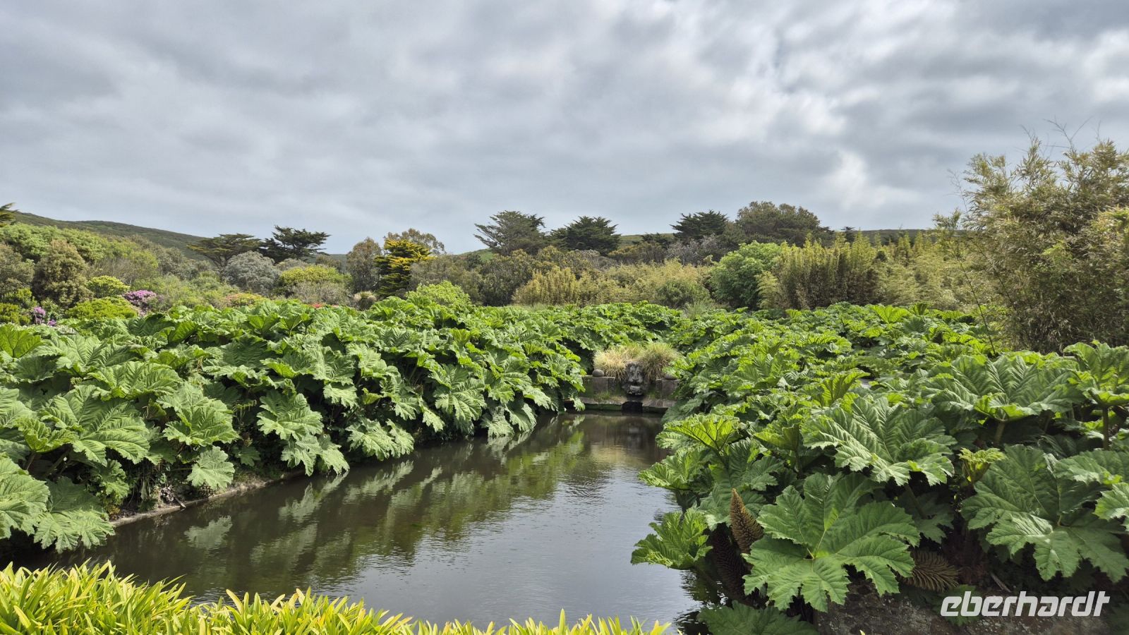 Der Tag heute steht ganz im Zeichen der Cotentin-Halbinsel, die vom milden Klima des Golfstroms profitiert. So kann man hier unter anderem den nördlichsten Palmengarten Frankreichs vorfinden. Eric Pellerin Junior, ein symphytischer junger Mann, begrüßt und im Botanischen Garten des Château de Vauville. Begleitet wird er von den beiden Terriern Odette und Eugène, die gemeinsam mit uns in das kleine Tor hineintrotten. Eric zeigt uns seine Pflanzenschätze und die Sammlung von alten Gartengeräten, die sein Großvater zusammengetragen hat. Der Park umgibt das Schloss von Vauville am Rande des pittoresken Dorfes und wurde von Eric und Nicole Pellerin im Jahre 1947 geschaffen. Heute ist er ein außergewöhnlicher botanischer Garten von 4 Hektar mit mehr als 900 Sorten Pflanzen, die eine erstaunliche tropische Stimmung erzeugen. Palmen, Eukalyptus, Gingko, Guave, Wollemie und Kampferbaum, Rhododendren, üppige Gunnera und bunte Blühpflanzen. Auch das kleine Schlösschen begeistert uns und wir können uns vorstellen wie viel Liebe und Herzblut in den letzten drei Generationen in dieses Projekt geflossen sind.