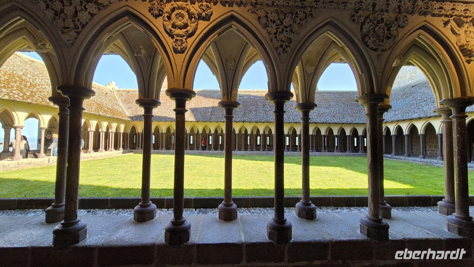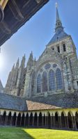 Am nächsten Morgen machen wir uns früh auf den Weg mit dem Shuttlebus entlang des Couesnon über die Stelzenbrücke zum Mont Saint Michel. Noch vor dem großen Ansturm erreichten wir den Inselberg, der auch bei Ebbe ein imposantes Bild bietet. Um die obere Abteikirche zu erreichen müssen erst viele steile Stufen erklommen werden, doch die grandiose Aussicht von oben entschädigt für alle Mühen. Ausgerüstet mit modernen Tablets lassen wir uns die Geschichte der bedeutenden christlichen Wallfahrtsstätte, seit 1979 UNESCO Weltkulturerbe, erklären. Lange Jahre nach der französischen Revolution war die alte Klosteranlage ein gefürchtetes Staatsgefängnis, bevor sich Victor Hugo und andere für die Restaurierung des Ensembles stark machten. Jedes Jahr kommen mehr als drei Millionen Besucher zu dem heiligen Berg im Meer, der seit 1300 Jahren die Menschen in seinen Bann zieht. Bei unserem Rundgang über die Festungsmauern können wir sehen wie die vielen Tagesgäste, einer Ameisenstraße gleich, den Berg erstürmen. Glück gehabt - das frühe Aufstehen hat sich gelohnt. Wir hatten den Berg noch fast ganz für uns und konnten im Kreuzgang noch meditative Stille genießen.