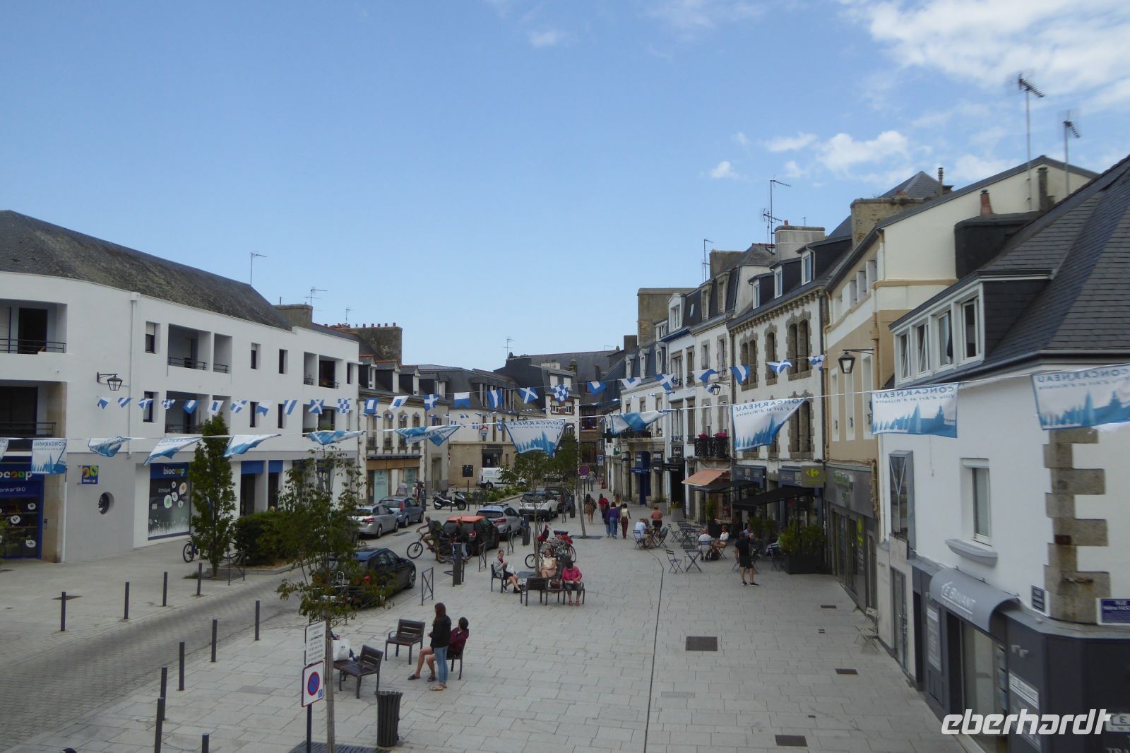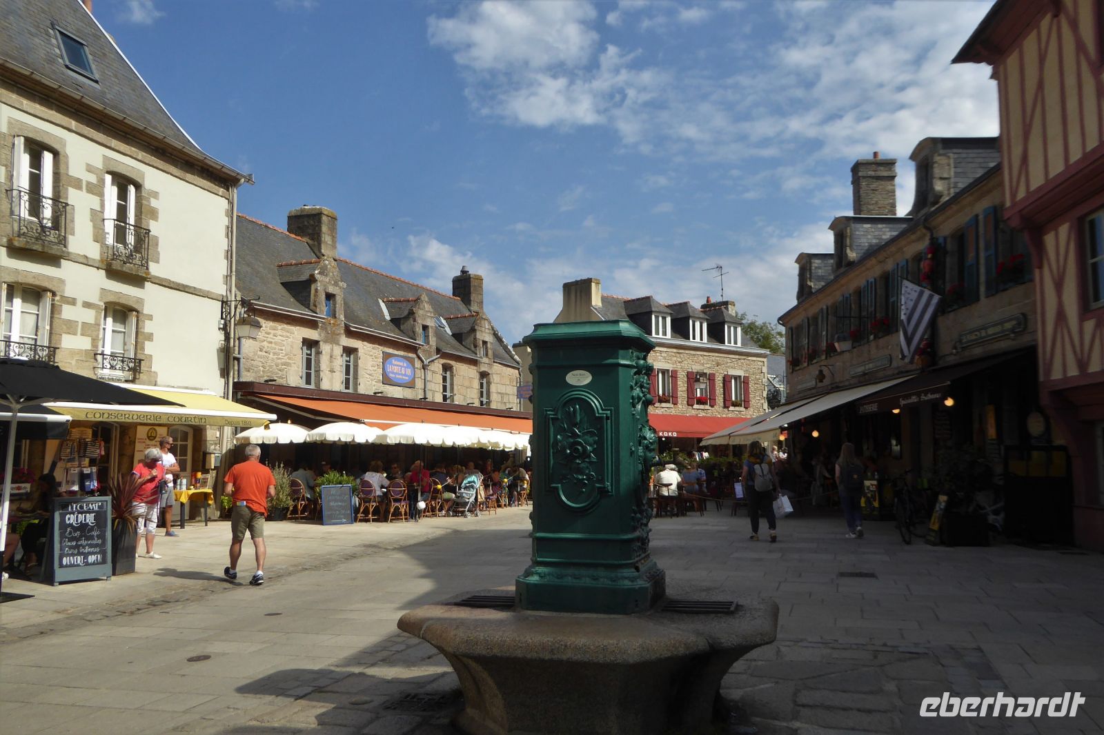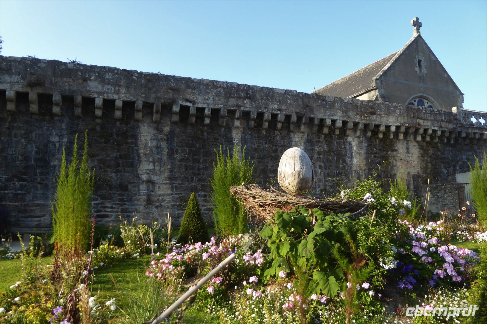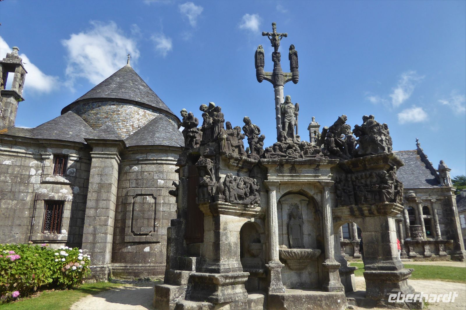 Über dem Badeort Dinard weht noch immer ein Hauch vom mondänen Fin de Siècle. Noble Villen, die sich wohlhabende Engländer am Ende des neunzehnten Jahrhunderts errichteten, reihen sich malerisch entlang der stillen Bucht. Seit dreißig Jahren gibt es hier ein Festival des britischen Films - eine Statue des berühmten Regisseurs Alfred Hitchcock, umrahmt von den allgegenwärtigen räuberischen Möwen, steht für dieses immer im September stattfindende Ereignis. In Dinard befindet sich auch das erste kommerziell genutzte Gezeitenkraftwerk der Welt. Mit einer Spitzenleistung von 240 Megawatt war es bis weit hinein ins dritte Jahrtausend das größte Kraftwerk dieser Art weltweit. Unsere Rundreise führte uns weiter nach Guimiliau, einer kleinen Gemeinde mit 2000 Einwohnern mitten im Département Finistère. Restaurants und Einkaufsmöglichkeiten sind hier im Binnenland eher dünn gesät und so war eine schnelle Entscheidung gefragt: nach mehreren telefonischen Rückfragen konnten wir einen Platz in der Crêperie „Ar Chupen“ ergattern. Der Wirt persönlich bewirtete uns mit frischem Cidre, leckeren "Galettes complètes" und süßen Crèpes mit gesalzenem Caramel. Extra für uns spielte er auf dem Akkordeon traditionelle bretonische Lieder! Draußen erwartete uns ein herrlicher blauer Himmel und die Sonne strahlte über dem stillen Ort. Gleich neben dem Lokal befindet sich die bedeutendste Sehenswürdigkeit der Region: Ein umfriedeter Pfarrbezirk mit seinem Kalvarienberg aus dem sechzehnten Jahrhundert, einer Kirche und dem Beinhaus. Diese bilden eine Einheit, die die Volksfrömmigkeit der Region widerspiegelt. Das Hauptportal verbindet den profanen mit dem heiligen Raum und stellt so eine Verbindung der Gemeinschaft der Lebenden mit den Toten her. Mit einem kleinen Abendspaziergang durch Quimper, unserem heutigen Etappenziel, endete ein weiterer ereignisreicher Urlaubstag.