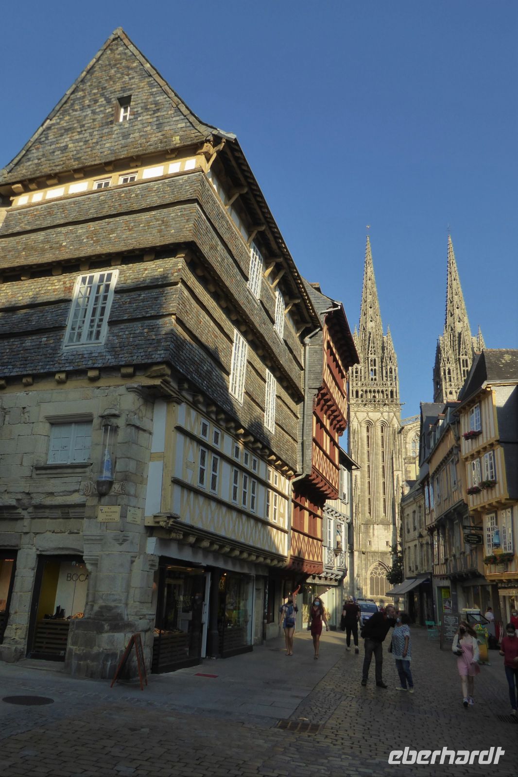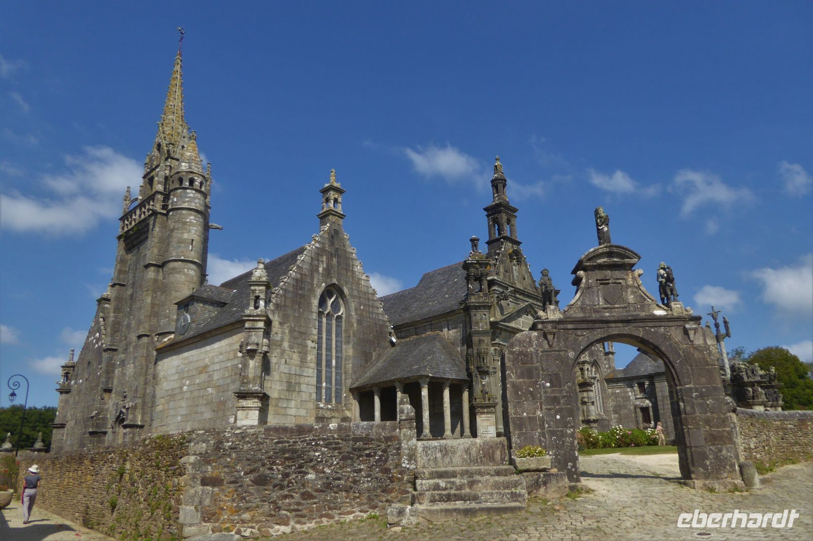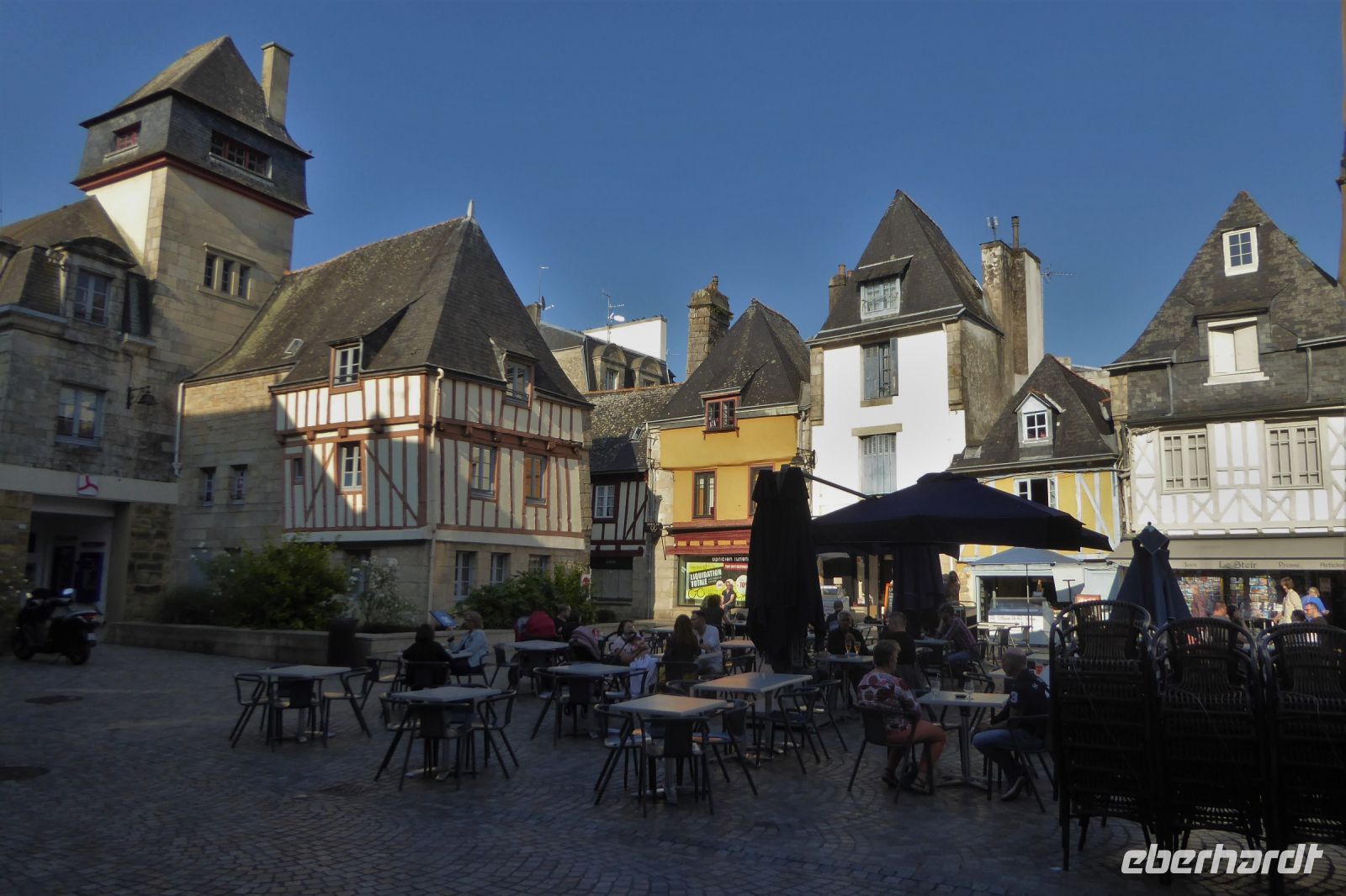 Über dem Badeort Dinard weht noch immer ein Hauch vom mondänen Fin de Siècle. Noble Villen, die sich wohlhabende Engländer am Ende des neunzehnten Jahrhunderts errichteten, reihen sich malerisch entlang der stillen Bucht. Seit dreißig Jahren gibt es hier ein Festival des britischen Films - eine Statue des berühmten Regisseurs Alfred Hitchcock, umrahmt von den allgegenwärtigen räuberischen Möwen, steht für dieses immer im September stattfindende Ereignis. In Dinard befindet sich auch das erste kommerziell genutzte Gezeitenkraftwerk der Welt. Mit einer Spitzenleistung von 240 Megawatt war es bis weit hinein ins dritte Jahrtausend das größte Kraftwerk dieser Art weltweit. Unsere Rundreise führte uns weiter nach Guimiliau, einer kleinen Gemeinde mit 2000 Einwohnern mitten im Département Finistère. Restaurants und Einkaufsmöglichkeiten sind hier im Binnenland eher dünn gesät und so war eine schnelle Entscheidung gefragt: nach mehreren telefonischen Rückfragen konnten wir einen Platz in der Crêperie „Ar Chupen“ ergattern. Der Wirt persönlich bewirtete uns mit frischem Cidre, leckeren "Galettes complètes" und süßen Crèpes mit gesalzenem Caramel. Extra für uns spielte er auf dem Akkordeon traditionelle bretonische Lieder! Draußen erwartete uns ein herrlicher blauer Himmel und die Sonne strahlte über dem stillen Ort. Gleich neben dem Lokal befindet sich die bedeutendste Sehenswürdigkeit der Region: Ein umfriedeter Pfarrbezirk mit seinem Kalvarienberg aus dem sechzehnten Jahrhundert, einer Kirche und dem Beinhaus. Diese bilden eine Einheit, die die Volksfrömmigkeit der Region widerspiegelt. Das Hauptportal verbindet den profanen mit dem heiligen Raum und stellt so eine Verbindung der Gemeinschaft der Lebenden mit den Toten her. Mit einem kleinen Abendspaziergang durch Quimper, unserem heutigen Etappenziel, endete ein weiterer ereignisreicher Urlaubstag.