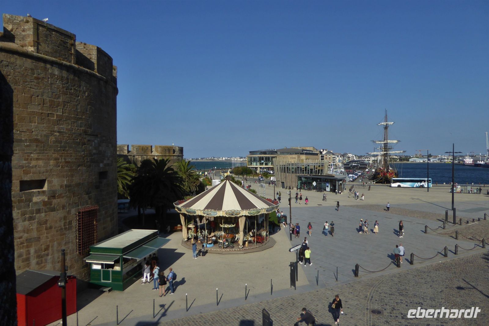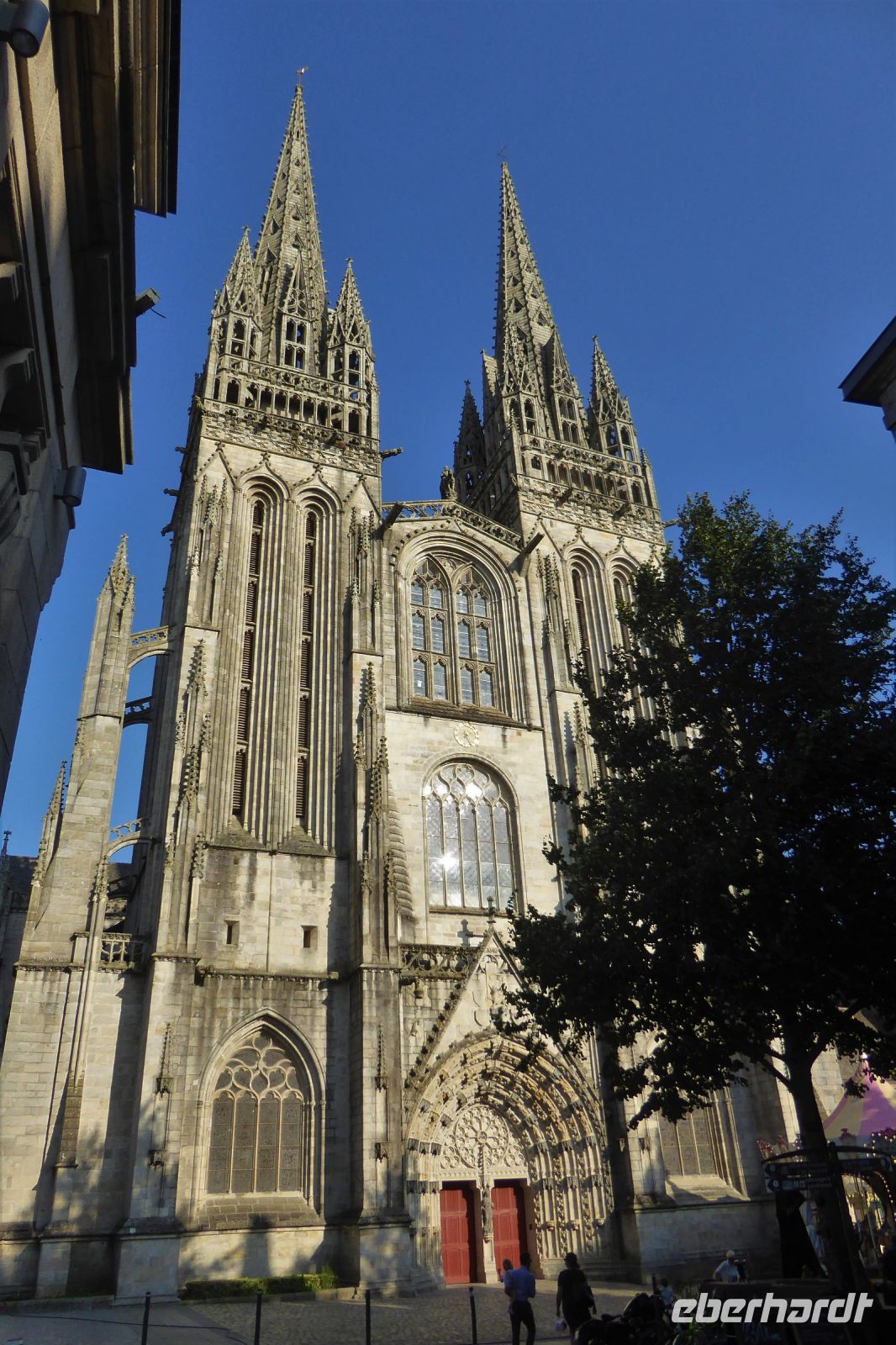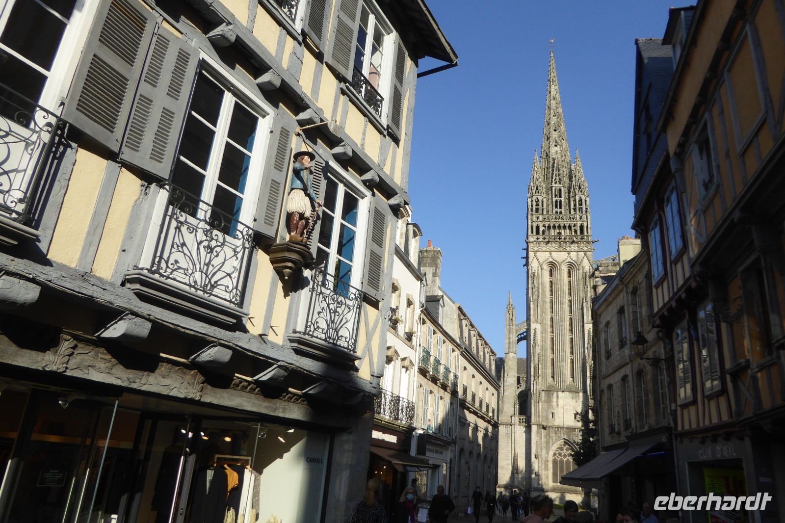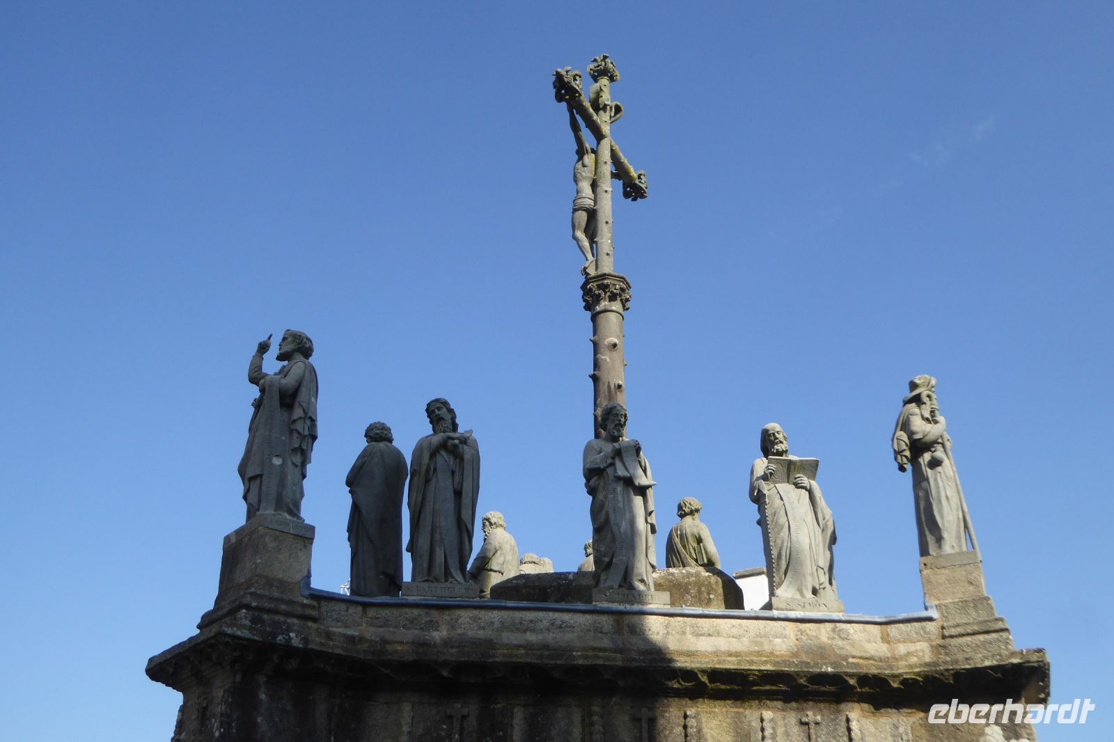 Über dem Badeort Dinard weht noch immer ein Hauch vom mondänen Fin de Siècle. Noble Villen, die sich wohlhabende Engländer am Ende des neunzehnten Jahrhunderts errichteten, reihen sich malerisch entlang der stillen Bucht. Seit dreißig Jahren gibt es hier ein Festival des britischen Films - eine Statue des berühmten Regisseurs Alfred Hitchcock, umrahmt von den allgegenwärtigen räuberischen Möwen, steht für dieses immer im September stattfindende Ereignis. In Dinard befindet sich auch das erste kommerziell genutzte Gezeitenkraftwerk der Welt. Mit einer Spitzenleistung von 240 Megawatt war es bis weit hinein ins dritte Jahrtausend das größte Kraftwerk dieser Art weltweit. Unsere Rundreise führte uns weiter nach Guimiliau, einer kleinen Gemeinde mit 2000 Einwohnern mitten im Département Finistère. Restaurants und Einkaufsmöglichkeiten sind hier im Binnenland eher dünn gesät und so war eine schnelle Entscheidung gefragt: nach mehreren telefonischen Rückfragen konnten wir einen Platz in der Crêperie „Ar Chupen“ ergattern. Der Wirt persönlich bewirtete uns mit frischem Cidre, leckeren "Galettes complètes" und süßen Crèpes mit gesalzenem Caramel. Extra für uns spielte er auf dem Akkordeon traditionelle bretonische Lieder! Draußen erwartete uns ein herrlicher blauer Himmel und die Sonne strahlte über dem stillen Ort. Gleich neben dem Lokal befindet sich die bedeutendste Sehenswürdigkeit der Region: Ein umfriedeter Pfarrbezirk mit seinem Kalvarienberg aus dem sechzehnten Jahrhundert, einer Kirche und dem Beinhaus. Diese bilden eine Einheit, die die Volksfrömmigkeit der Region widerspiegelt. Das Hauptportal verbindet den profanen mit dem heiligen Raum und stellt so eine Verbindung der Gemeinschaft der Lebenden mit den Toten her. Mit einem kleinen Abendspaziergang durch Quimper, unserem heutigen Etappenziel, endete ein weiterer ereignisreicher Urlaubstag.