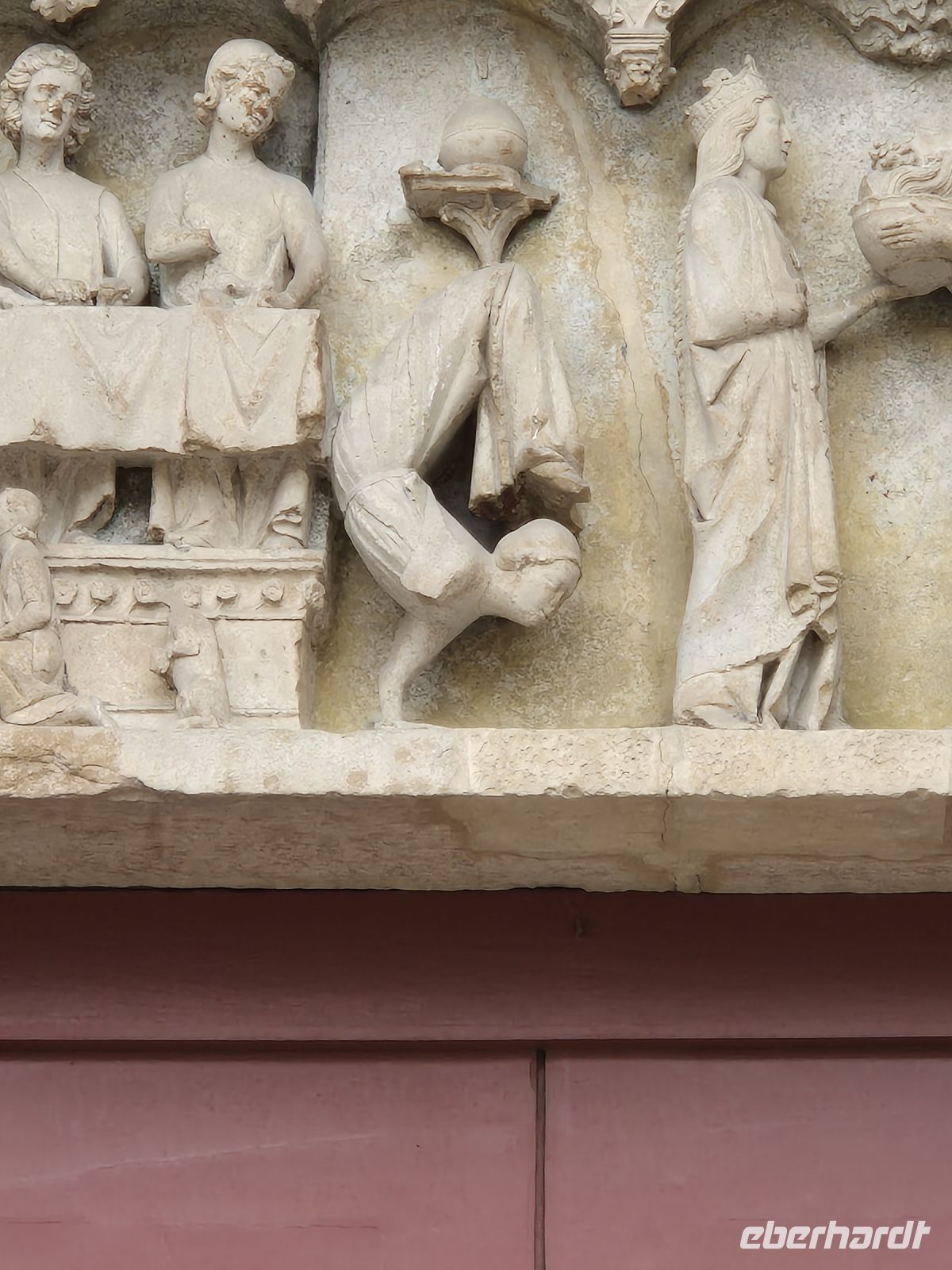 Doch nicht nur die romanische Krypta verdeutlicht, dass Teile der Kathedrale älter sind als der gotische Bau. Die Figuren des Königsportals, also des Mitteleingangs der Hauptfassade, entstanden bereits 1145-50, also fast 50 Jahre vor dem Neubau. Wann sie nach dem Brand der Vorgängerkirche hierher versetzt wurden, ist umstritten. Sie sind die ältesten gotischen Figuren der Kunstgeschichte. Willibald Sauerländer nannte sie die „Versinnlichung des Religiösen“. Eine Mandorla zeigt das Jüngste Gericht, eine sog. Majestas Domini, die Figuren auf den rechten Gewänden sind vermutlich David, Bathseba und Salomo. Das linke Portal zeigt die Himmelfahrt Christi, flankiert von Tierkreiszeichen-Darstellungen und solcher von Monatsarbeiten. Das rechte Portal zeigt Maria auf dem Thron der Weisheit, umgeben von Figuren des Wissens und der Artes liberales. Bemerkenswert die Darstellung der Grammatik: sie hat eine Rute in der Hand, mit denen sie zwei Schülern wortwörtlich etwas einbläuen kann.