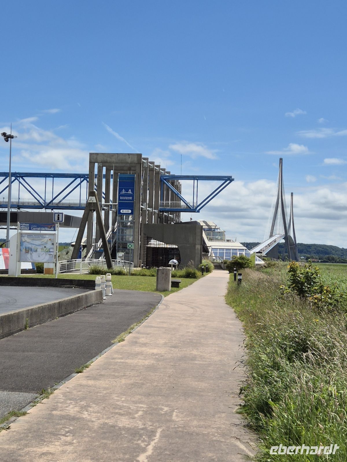 Wir fuhren weiter, bis wir von Norden an die Pont de Normandie (1988-94) kamen. Es ist eine 2141 m lange Schrägseilbrücke mit einer Höhe von 214 m. Die Pylone werden getragen von 4x23 Kabeln. Die längste Stützweite ist 856 m, ein europäischer Rekord.